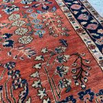 Beautiful rich jewel toned antique Sarouk rug, with amazing variations in the dye and older than most Sarouk rugs, woven around 1900-1910.  A well drawn traditional floral Persian design with orange/red dyes that change through-out and change to lighter shades.  Known as abrash, the Persian term for dye change, this is the charm of an antique rug.  Deep royal blue dyes used for the border and hints of green and golds too.  Sarouk’s were woven in the village of Saruk in the Arak region of Persia.  In good pile all over with some old marks in a couple or areas, it has been washed by our workshop and ready to be used.