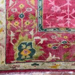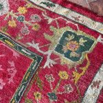Due to the age of this carpet some old areas of restoration are apparent, with some old reweaves at the ends/fringe area.  There are some areas of lower pile in the main field, but no thread bare areas or holes to speak of.  The general pile is very good, with a medium wool pile height on this 140 year old carpet from Ushak in Turkey.