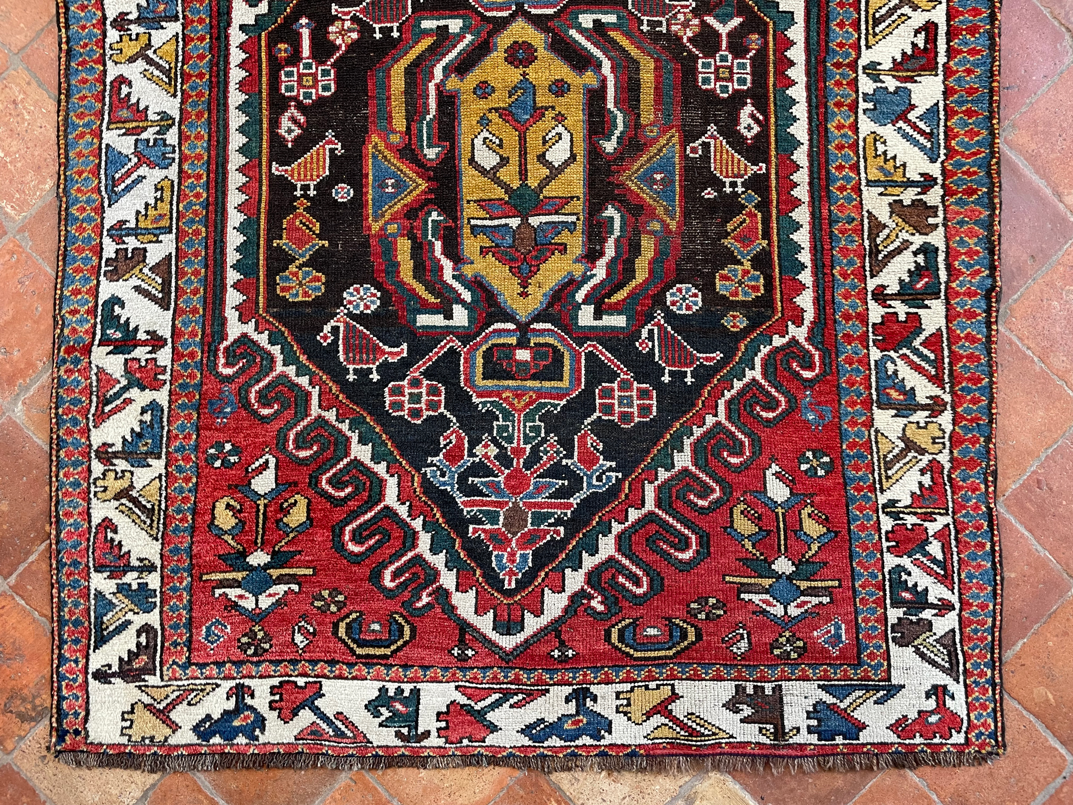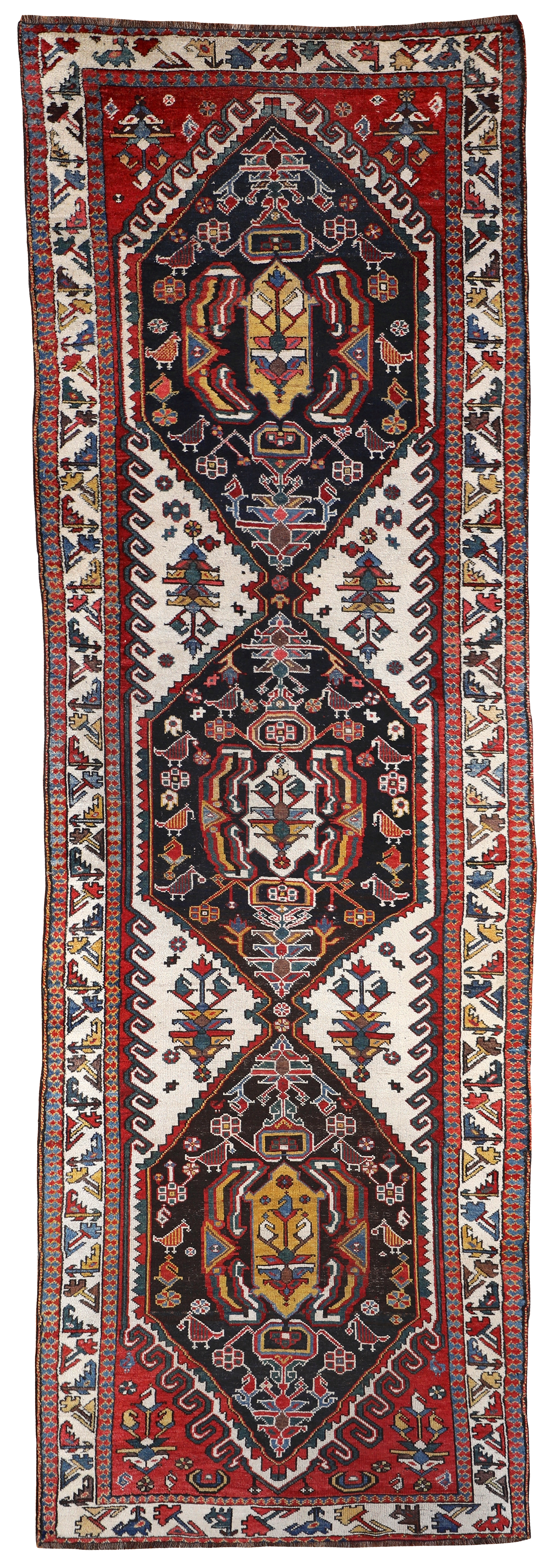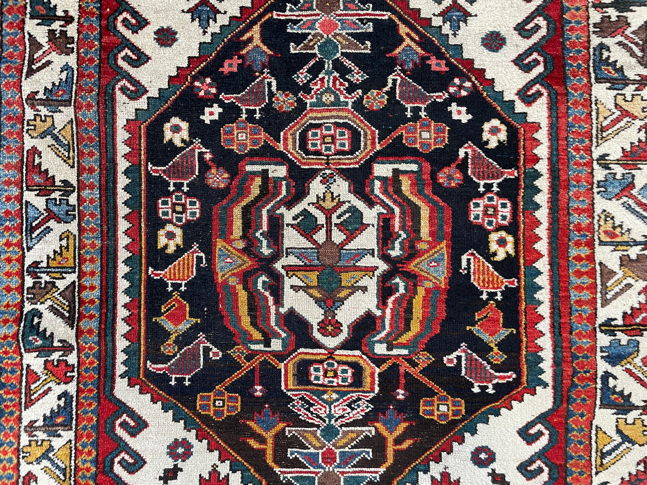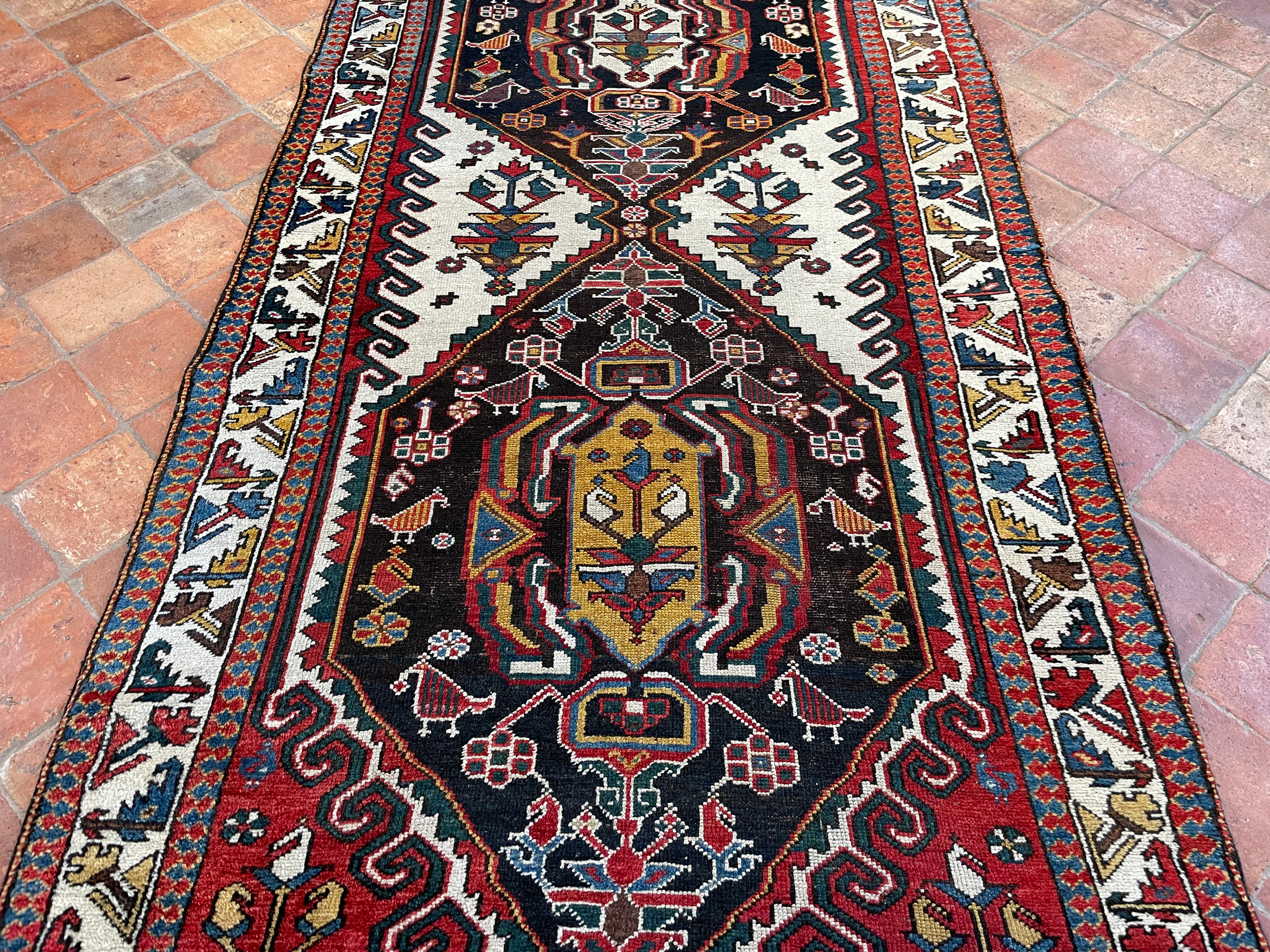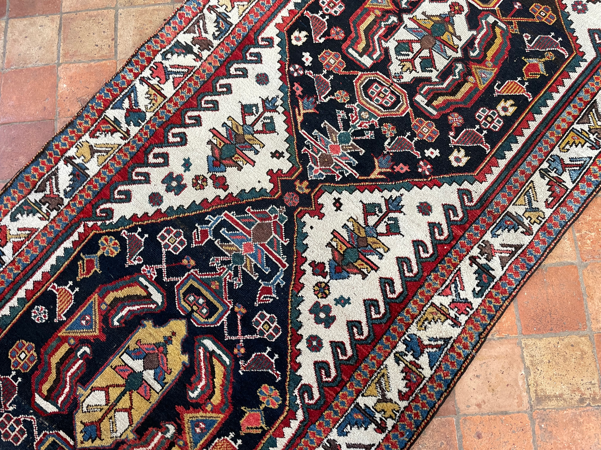 An antique Baktiari runner woven in the south-west of Persia with a beautiful array of colours, wonderful birds and abstract tree designs in the main field with exquisite natural dyes. This antique runner dates from around 1900-1910 and is in good condition in general, only a few areas of minimal lower pile. Woven on a soft wool foundation, they tend to be light to touch and come in a variety of designs, but Baktiari rarely produced runners. A wonderful vibrant tribal antique runner to brighten up a hall or corridor.