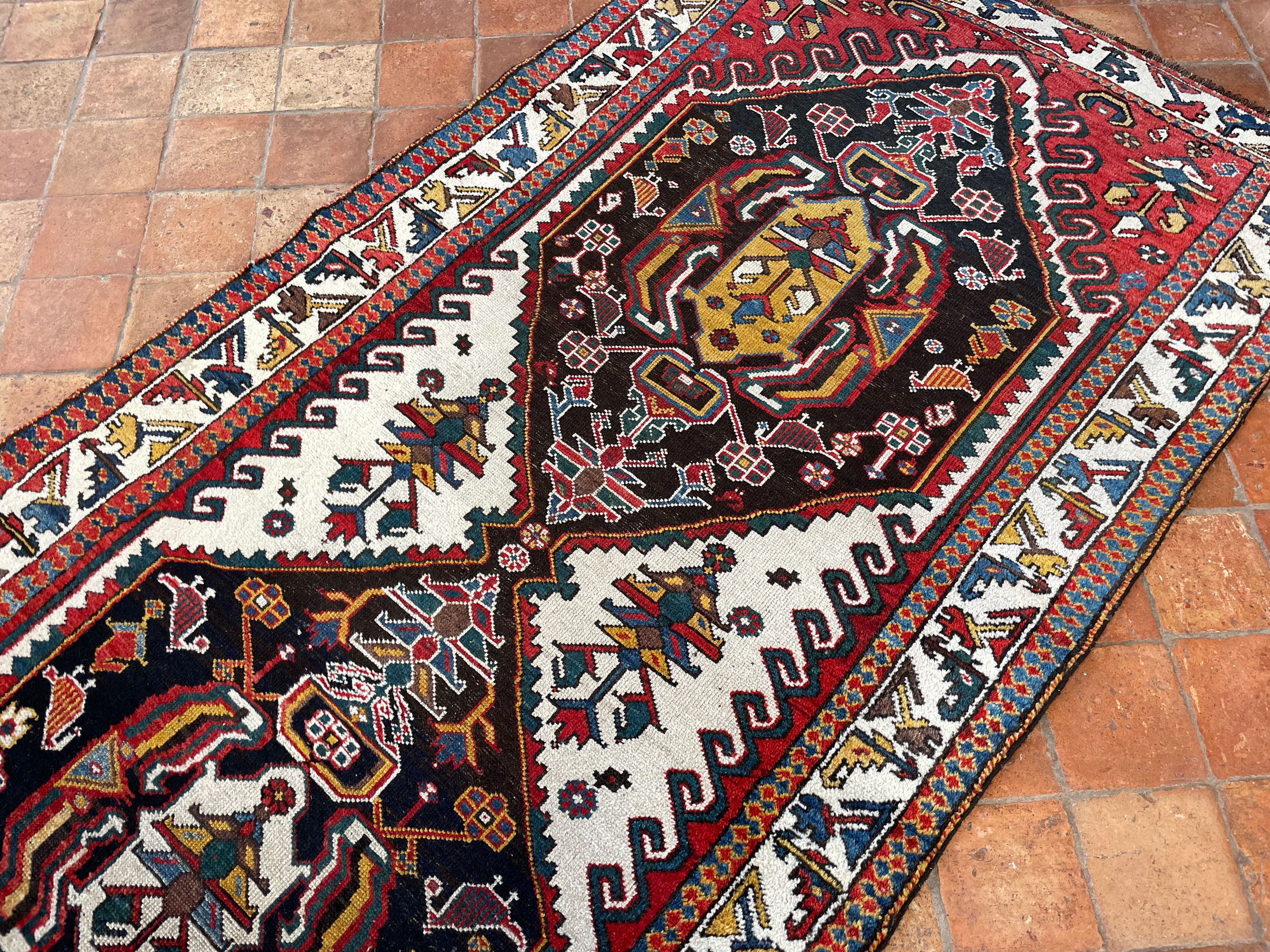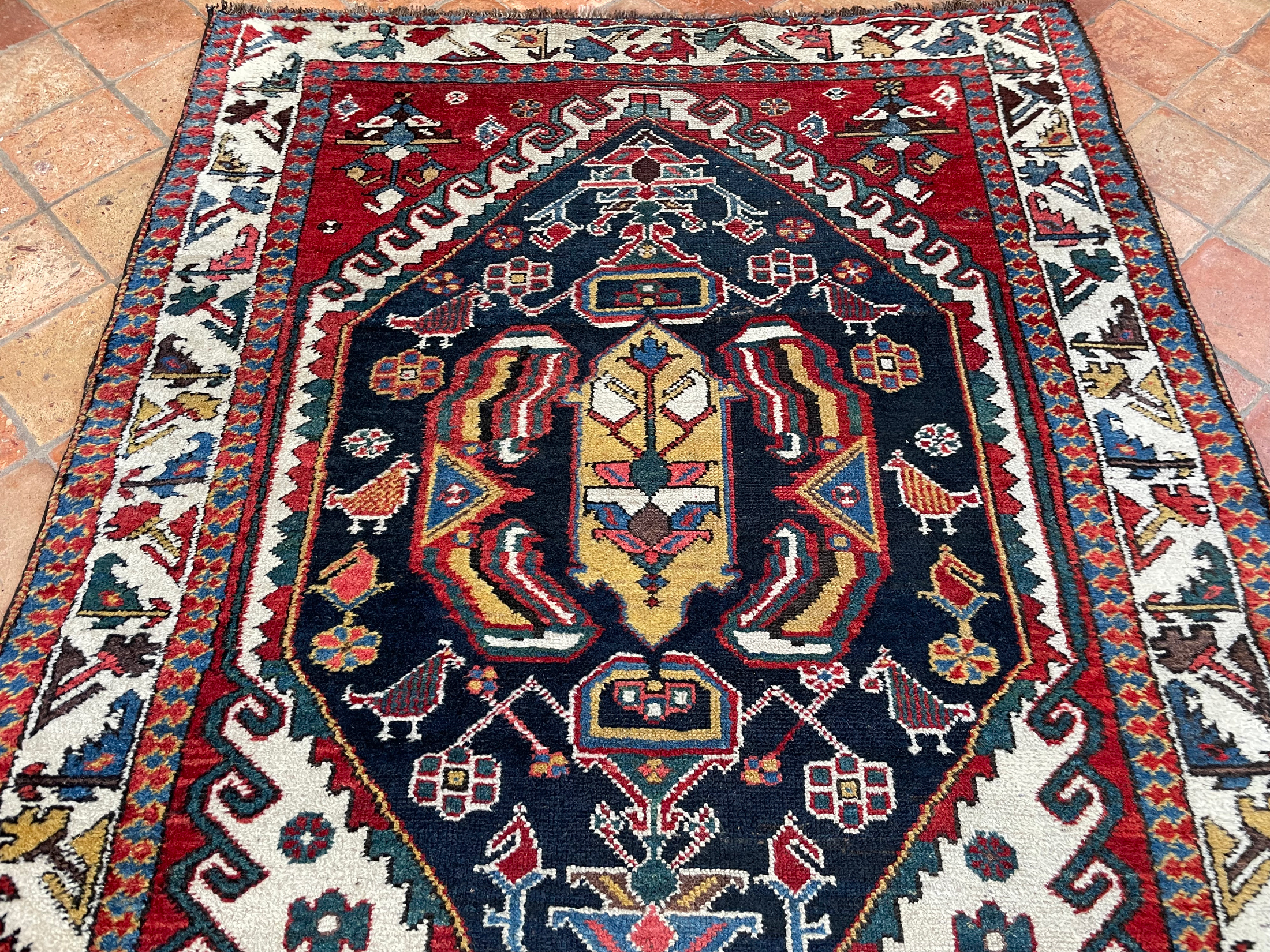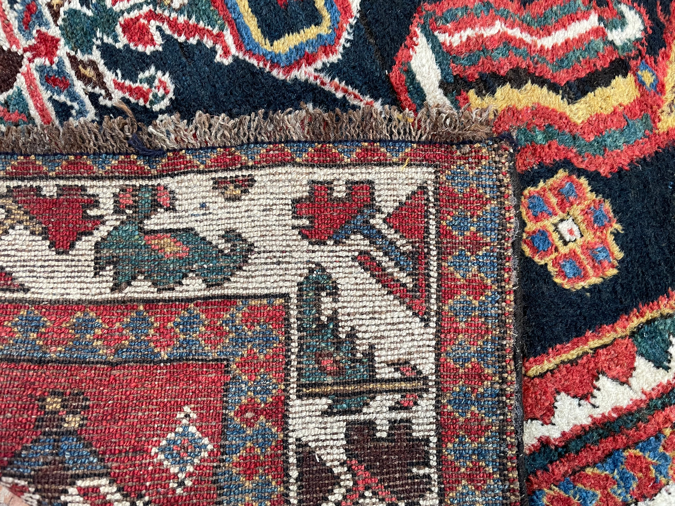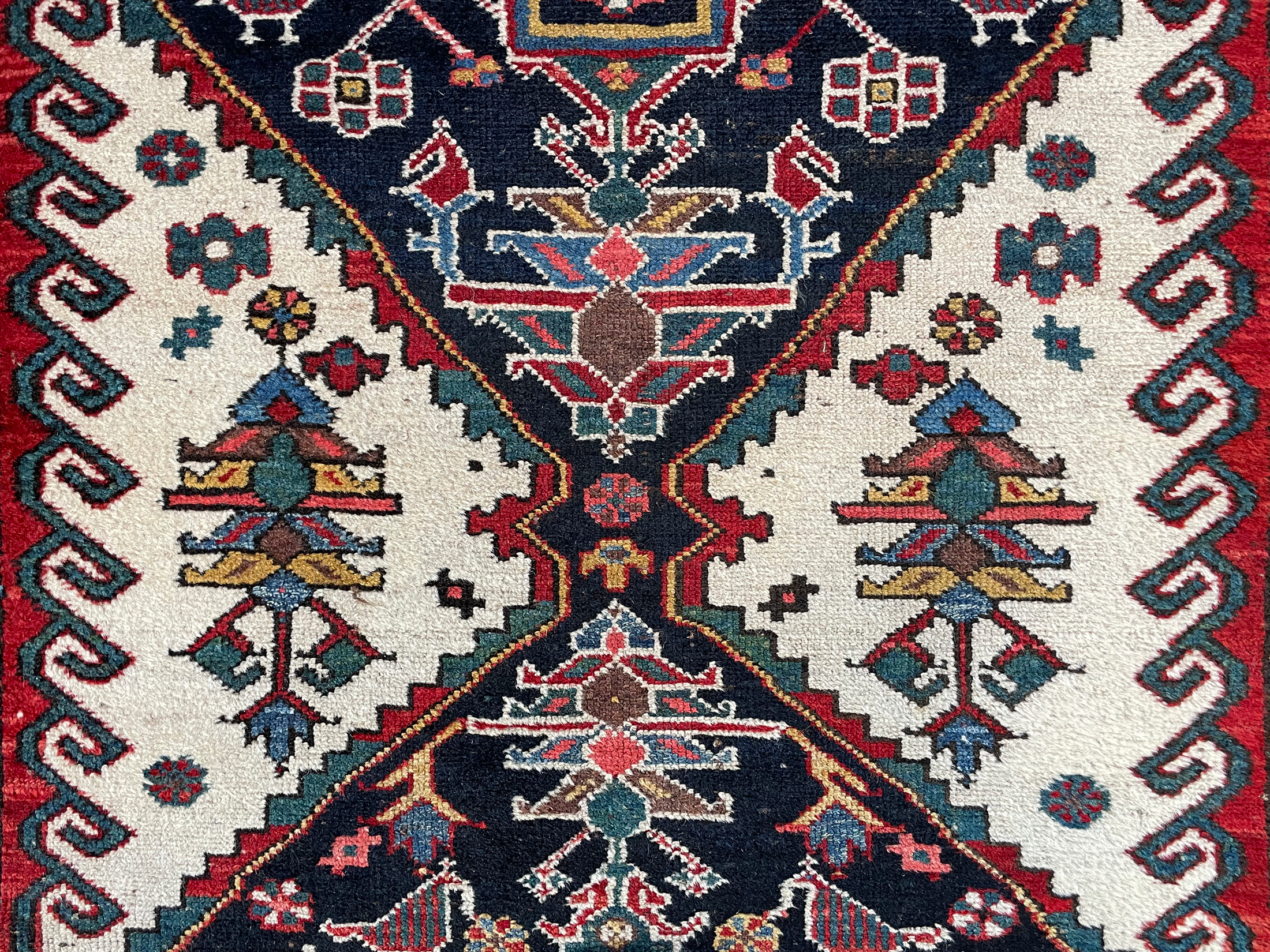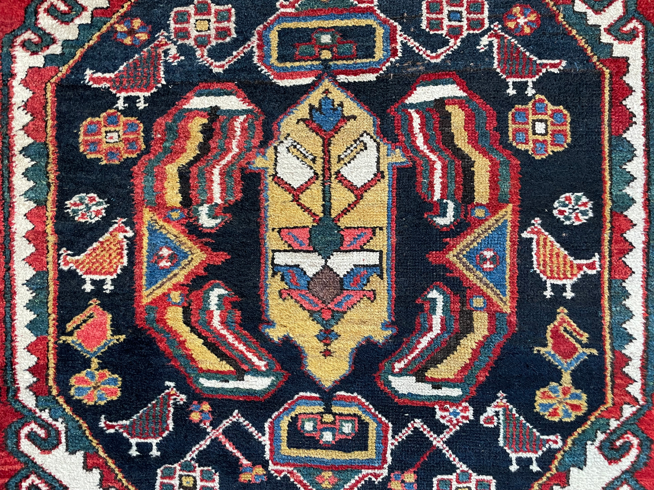 An antique Baktiari runner woven in the south-west of Persia with a beautiful array of colours, wonderful birds and abstract tree designs in the main field with exquisite natural dyes. This antique runner dates from around 1900-1910 and is in good condition in general, only a few areas of minimal lower pile. Woven on a soft wool foundation, they tend to be light to touch and come in a variety of designs, but Baktiari rarely produced runners. A wonderful vibrant tribal antique runner to brighten up a hall or corridor.