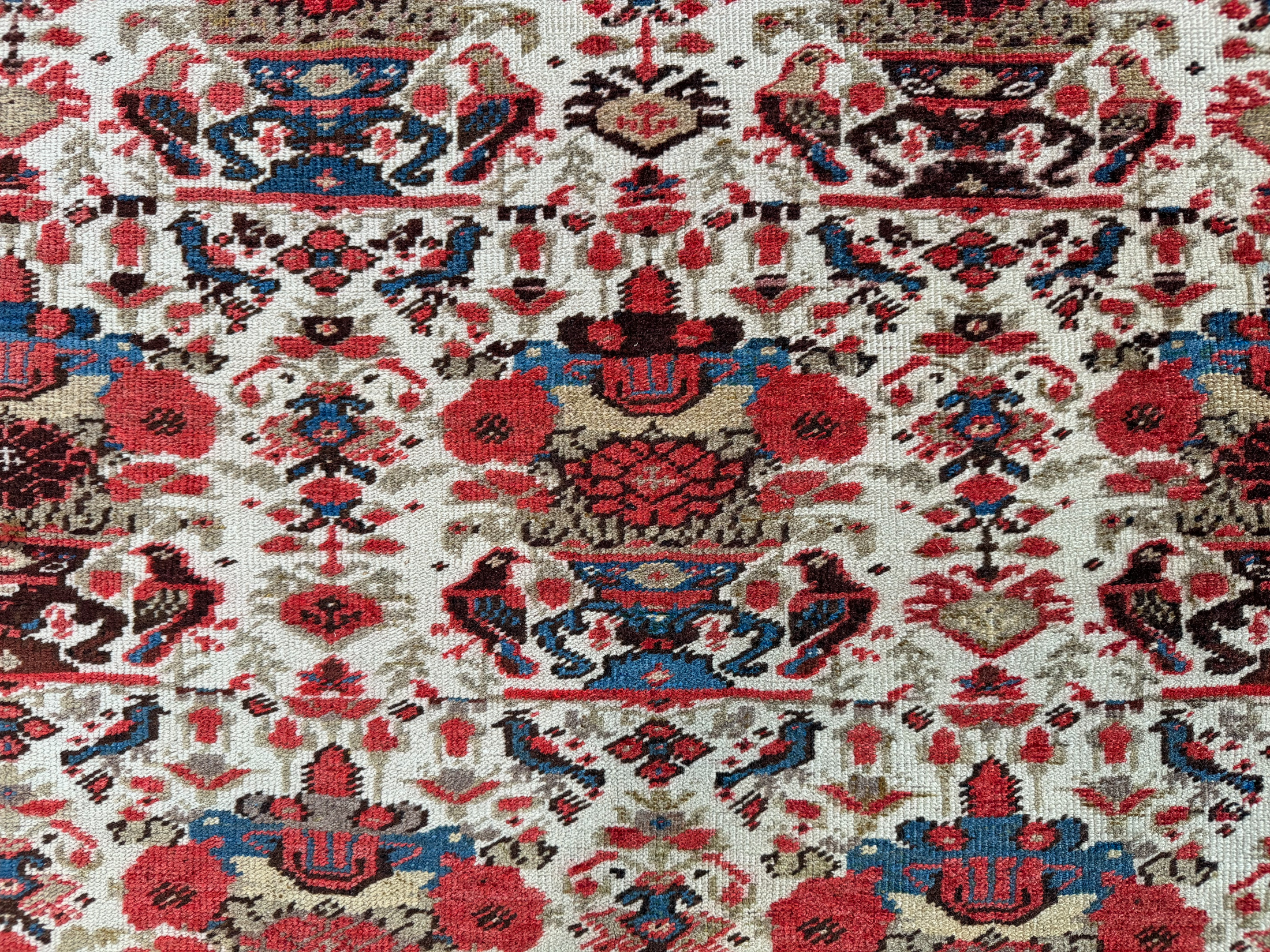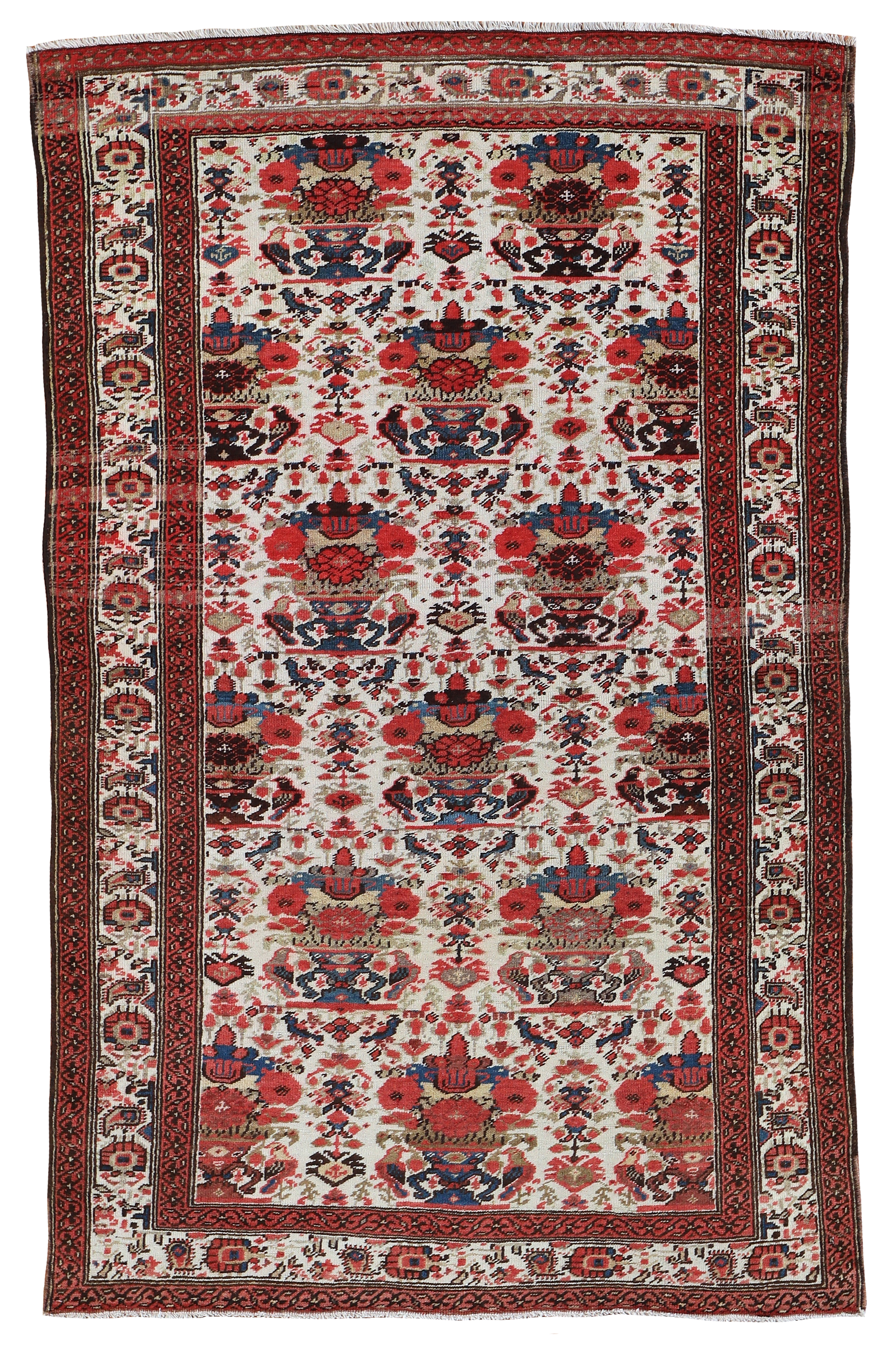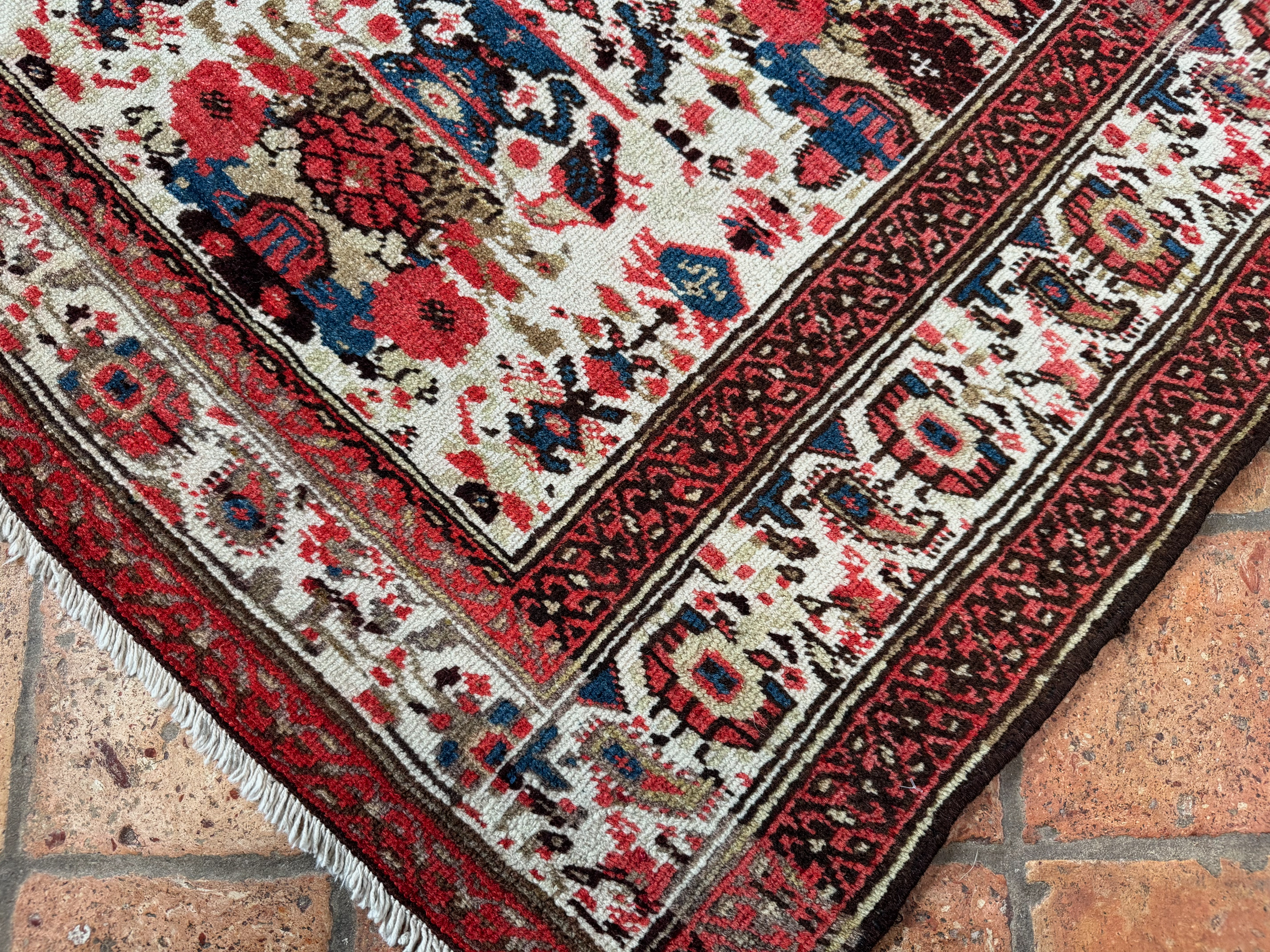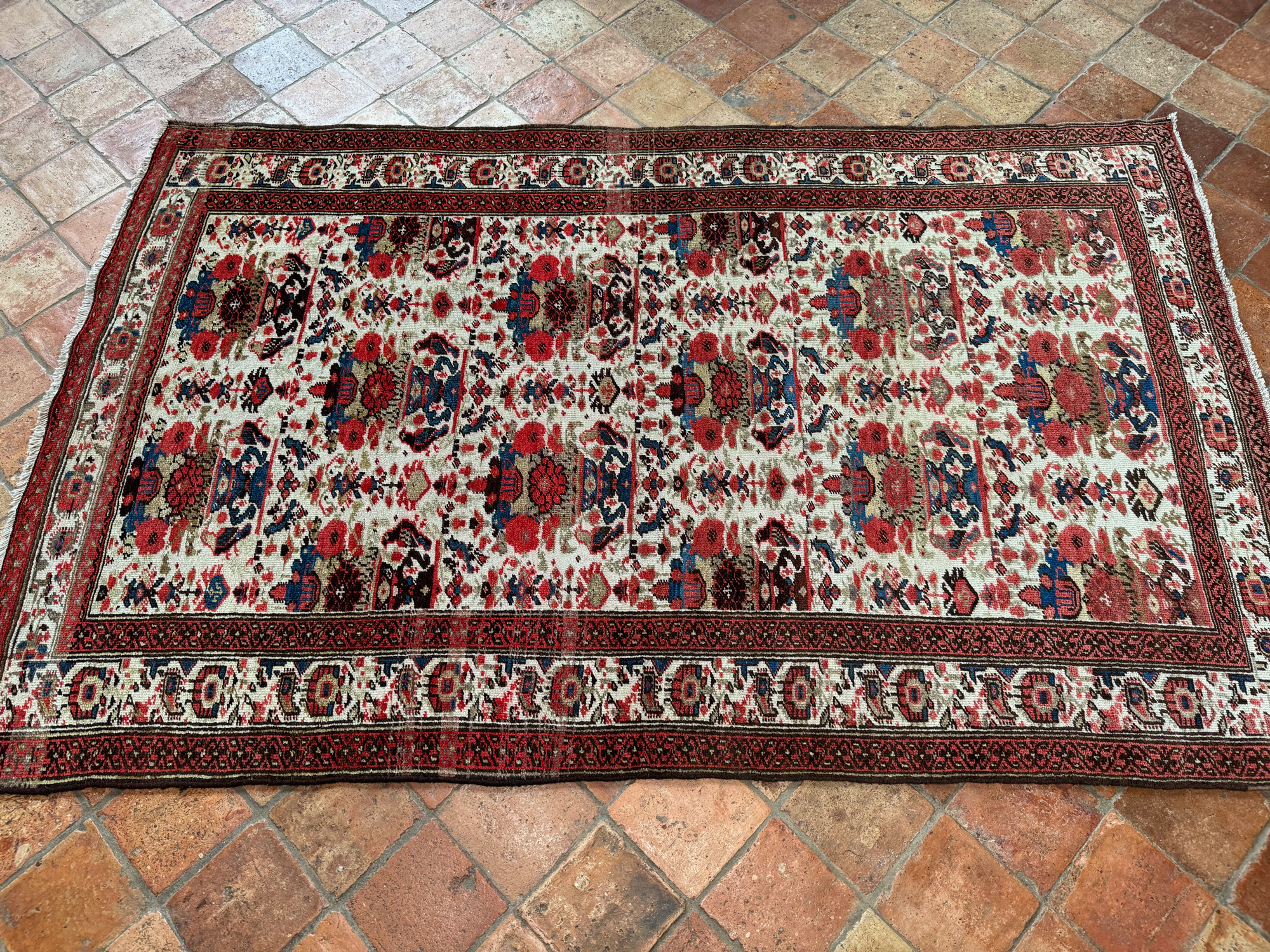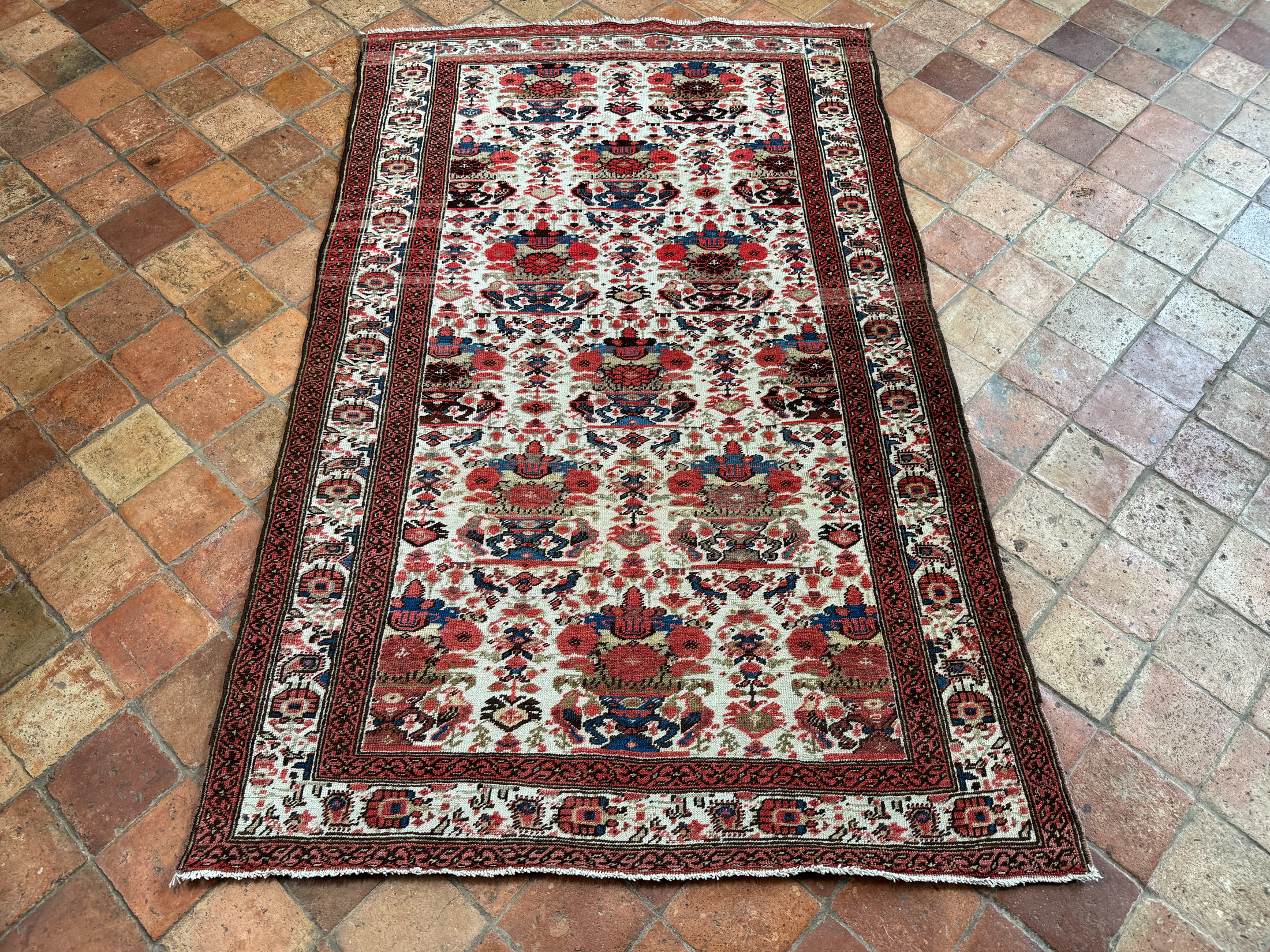 An antique Malayer rug woven around 110 years ago, woven on an off white background and border colour, with warm red and blue tones, and muted green dyes too. An unusual large vase design in the main field, similar to that of the famous Zil-e Sultan design. Zil-e was the eldest of the Shah of Persia around 1840. As he was not in line to the throne he designed his own royal symbol which is the repeating bird and vase design we see in the centre of this rug, which actually became more famous and used in rugs.