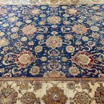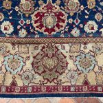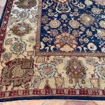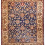 Woven in the early to mid part of the 19th century the condition is good in general, with predominantly a good wool pile in place. Minimal scattered wear can be seen and minor old areas of restoration, this carpet has not been heavily restored or re-piled which keeps its originality and beauty. The structure is sound and in excellent order. The deep blue dyes varying gold border tones and rich reds and faded sage greens complete the look to create a truly handsome carpet. The best weavers in India often travelled from Persia to showcase their skill and replicate these 17th century designs.