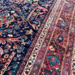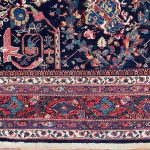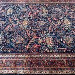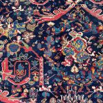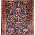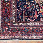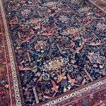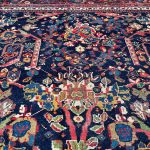 A wonderful deep blue almost black background on this antique Mahal carpet with a scrolling Mustafi design woven in Persia around 1900-1910.  The design is famous due to the Persian prime minister during the late 19th Century commissioned artisans to create a scrolling spiralling version of the ‘Gol Farang’ (which is a foreign flower; inspired by French and English florals) pattern that was immensely popular at the time.     As Ziegler & Co had inspired and created decorative floral carpets being woven in Sultanabad in the late 19th century other workshops locally followed suit and these designs were made in competition.