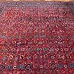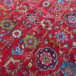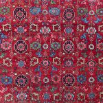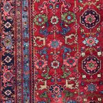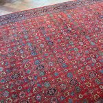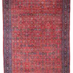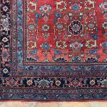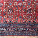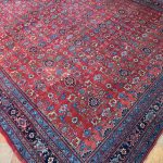 Rugs from Bidjar are very tough due to their structure which consists of usually five weft threads, two are loose wool threads followed by one taut cotton thread, then a further two loose wool threads. These are tightly beaten together against the knots, creating an extremely tight, compact rug. They tend to be floral in design, with the ‘Herati’ fish design commonly used in the main field and border or the ‘Mina-Khani’ floral design all over as in this example.