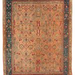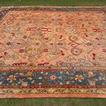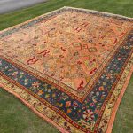 Decorative oversize antique Ushak carpet from Western Anatolia with glorious soft peach tones, blue greens, and golden yellow border. One of the largest rug production areas since the Ottoman Empire, Ushak designs tend to be more open than Persian rugs and softer dyes are not uncommon. Often younger Ushak’s or Oushak’s will be rich red in colour and use bolder geometric designs in the 20th century.