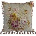 A beautiful early Antique Aubusson cushion which has been handmade with a silk backing. This cushion is feather filled and very soft to touch and handle. The Aubusson face of this cushion is from an original French tapestry from the late 19th century, which has been conserved where necessary and then made into this elegant decorative cushion.