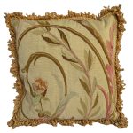 A beautiful Antique Aubusson cushion which has been handmade with a silk backing and wool details. This cushion is feather filled and very soft to handle. The Aubusson face of this cushion is from an original French tapestry from the mid 19th century which has been conserved where necessary and then made into this elegant decorative cushions.