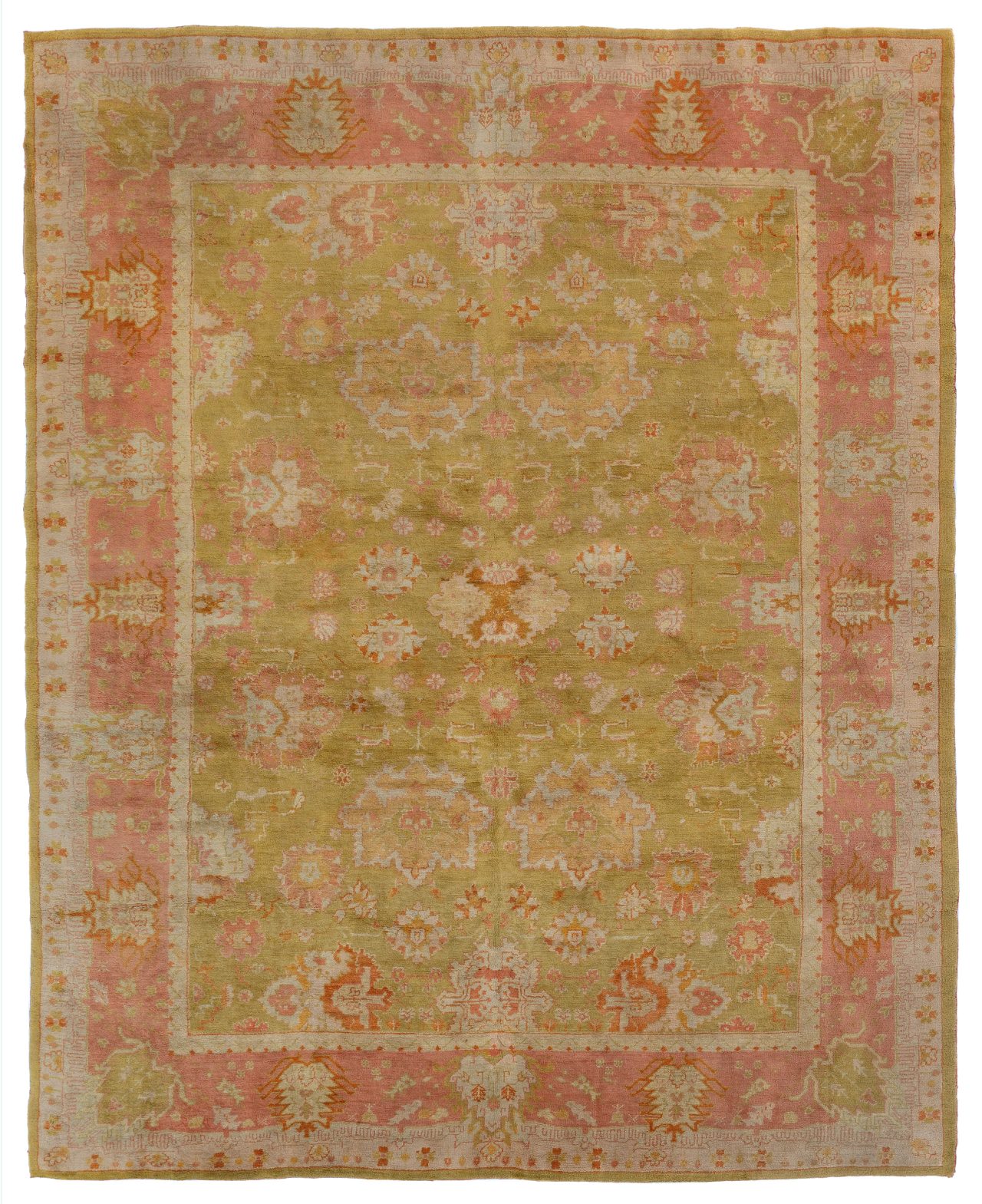 In near perfect original condition, this is one of the best antique Ushak carpets we have seen in over 30 years! With a dense, soft wool pile all over, no areas of wear or restoration, it is as near to being in perfect condition as can be! With the rarer pale green background and muted dusky pink border, one of the best colour combinations for these antique Turkish carpets.