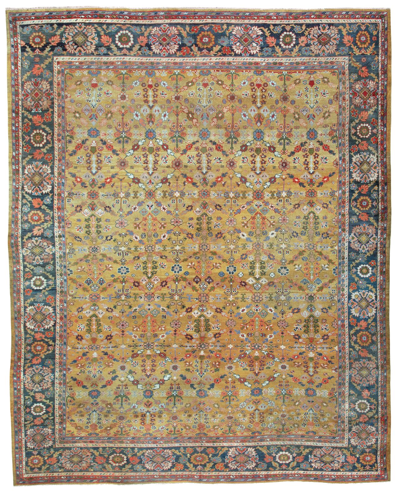 An extraordinary golden yellow antique Ziegler carpet from the late 19th century. It is incredibly rare to come across this background colour due to the expensive yellow dyes. More often using saffron or turmeric to dye the wool to get this remarkable colour, in the late 19th century it would have been a costly exercise and usually these grand carpets from the Sultanabad workshop in Persia were commissioned for stately homes across Europe and the US.