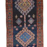 A dark blue almost black background on this 1910 antique Heriz runner, with soft brick red orange tone minor border with pale greens and blues. Some lovely geometric motifs, and people motifs too. The wool pile is thick and dense, and in really good condition. A great and rare narrow width on this antique tribal runner.