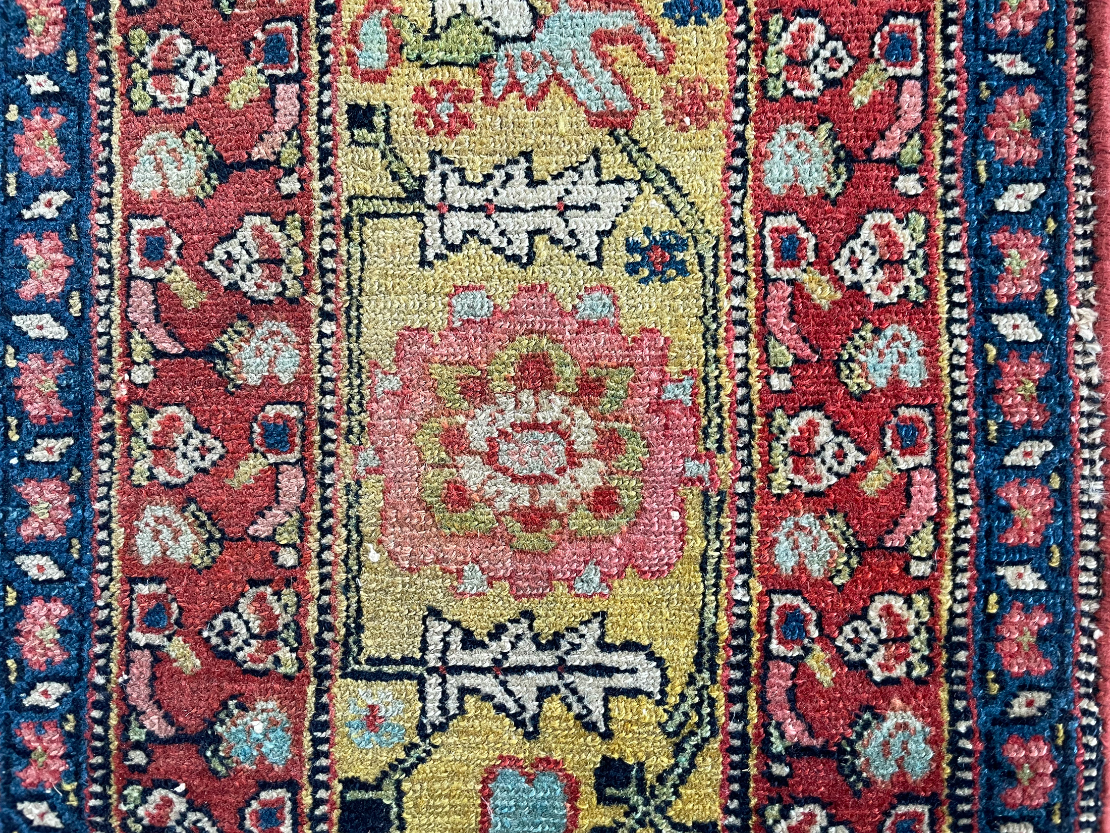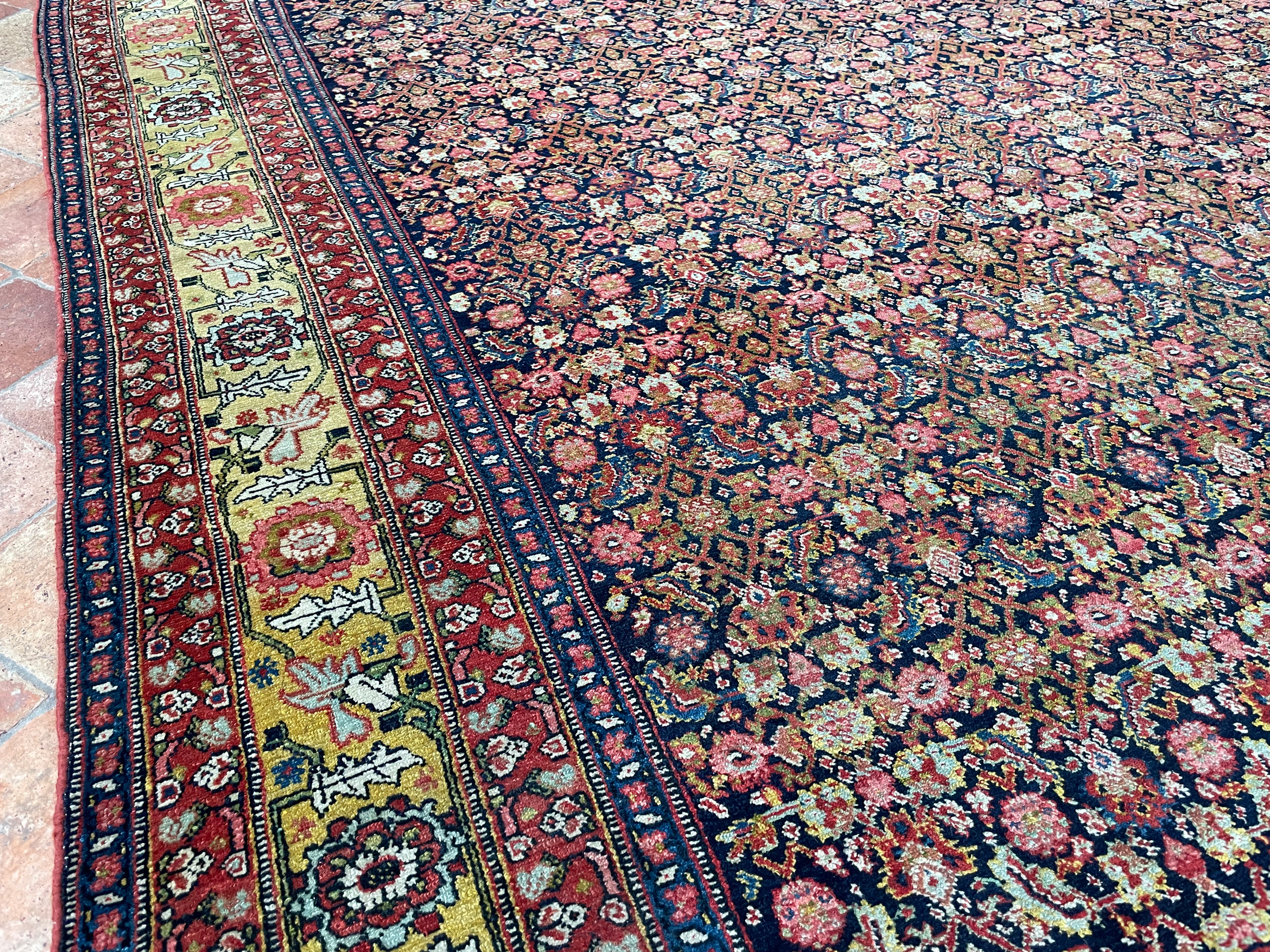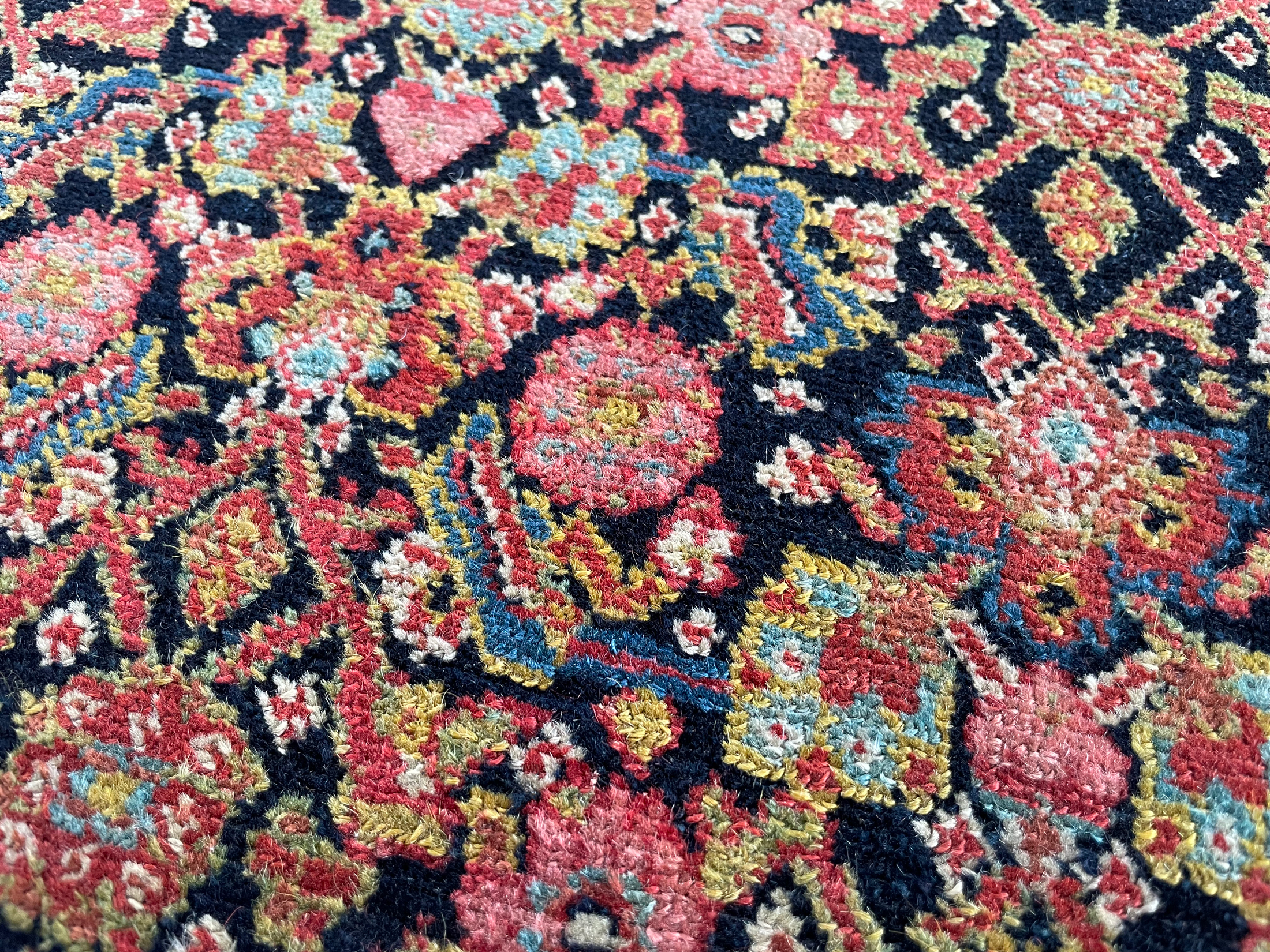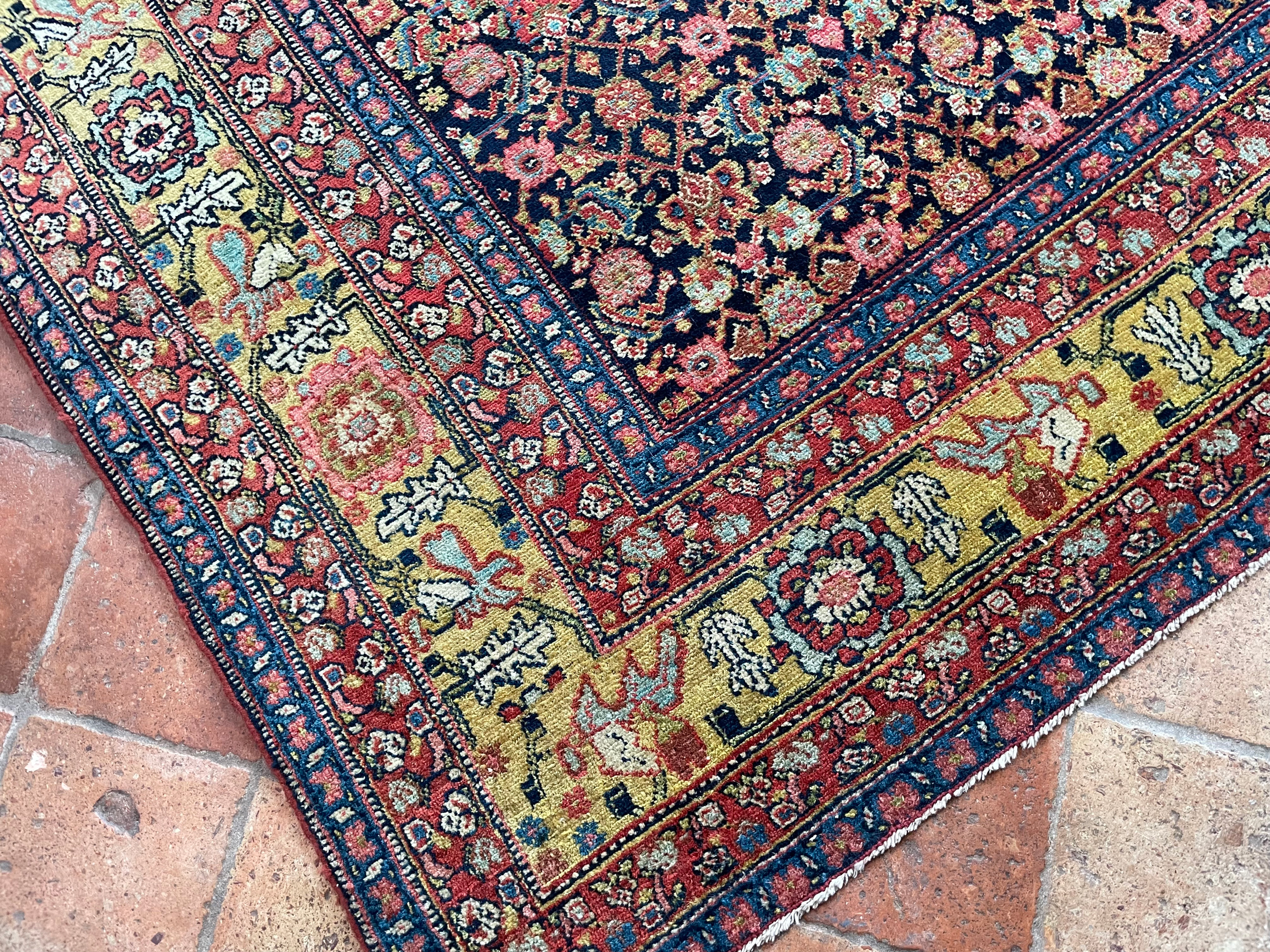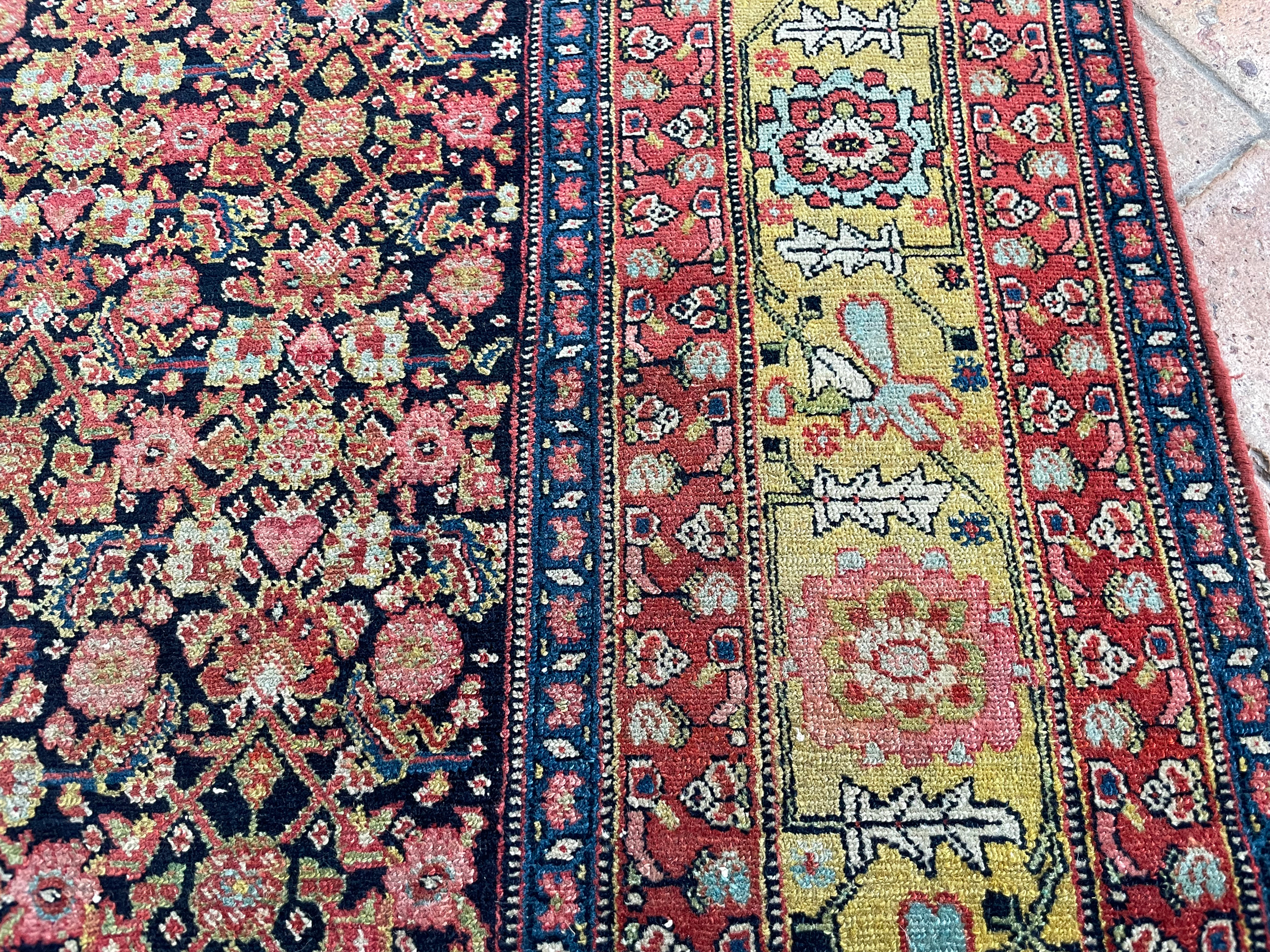 An exceptional, early antique Senneh kelleh, dating from circa 1860-1870 the weave is extremely fine indeed. This amazing large corridor carpet has a small scale all over Herati design, which in early carpets from the 16-17th century depicted two fish swimming around a water-lily. Rugs in the 18th-19th century had this design stylised which resembles two leaves around a flower. Dyes are stunning with a rich yellow border, with faded blue and pink flowers in the border too. Deep dark blues for the background which almost change to black in places and vibrant reds, oranges and hints of purple for the design.