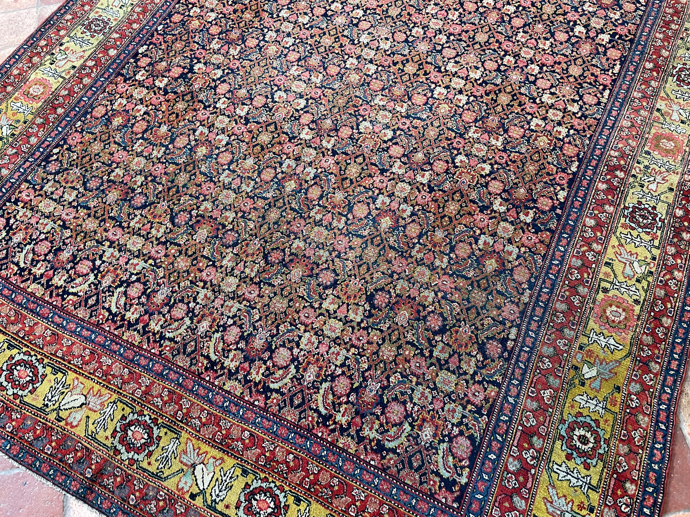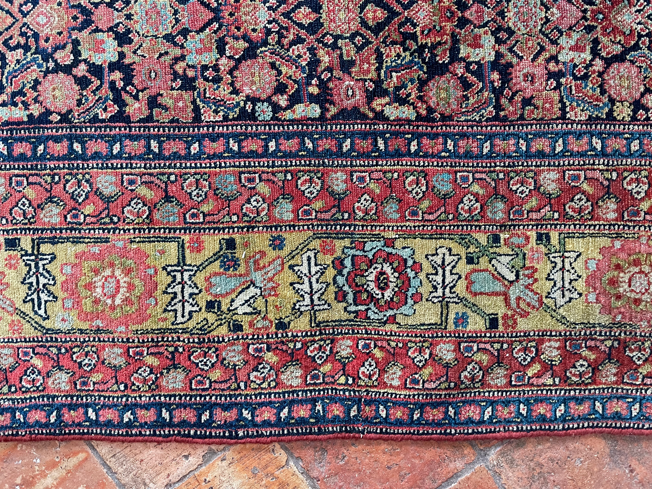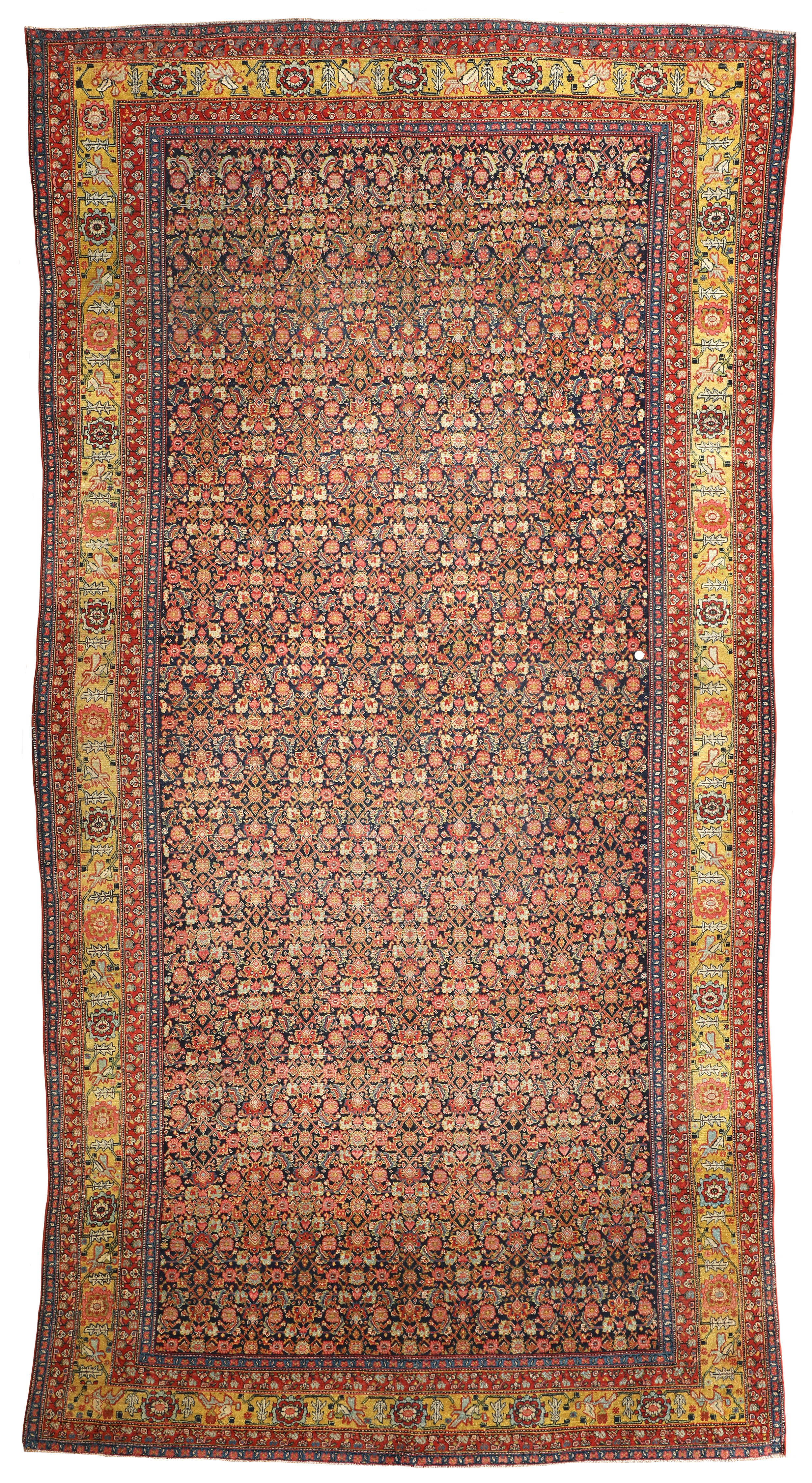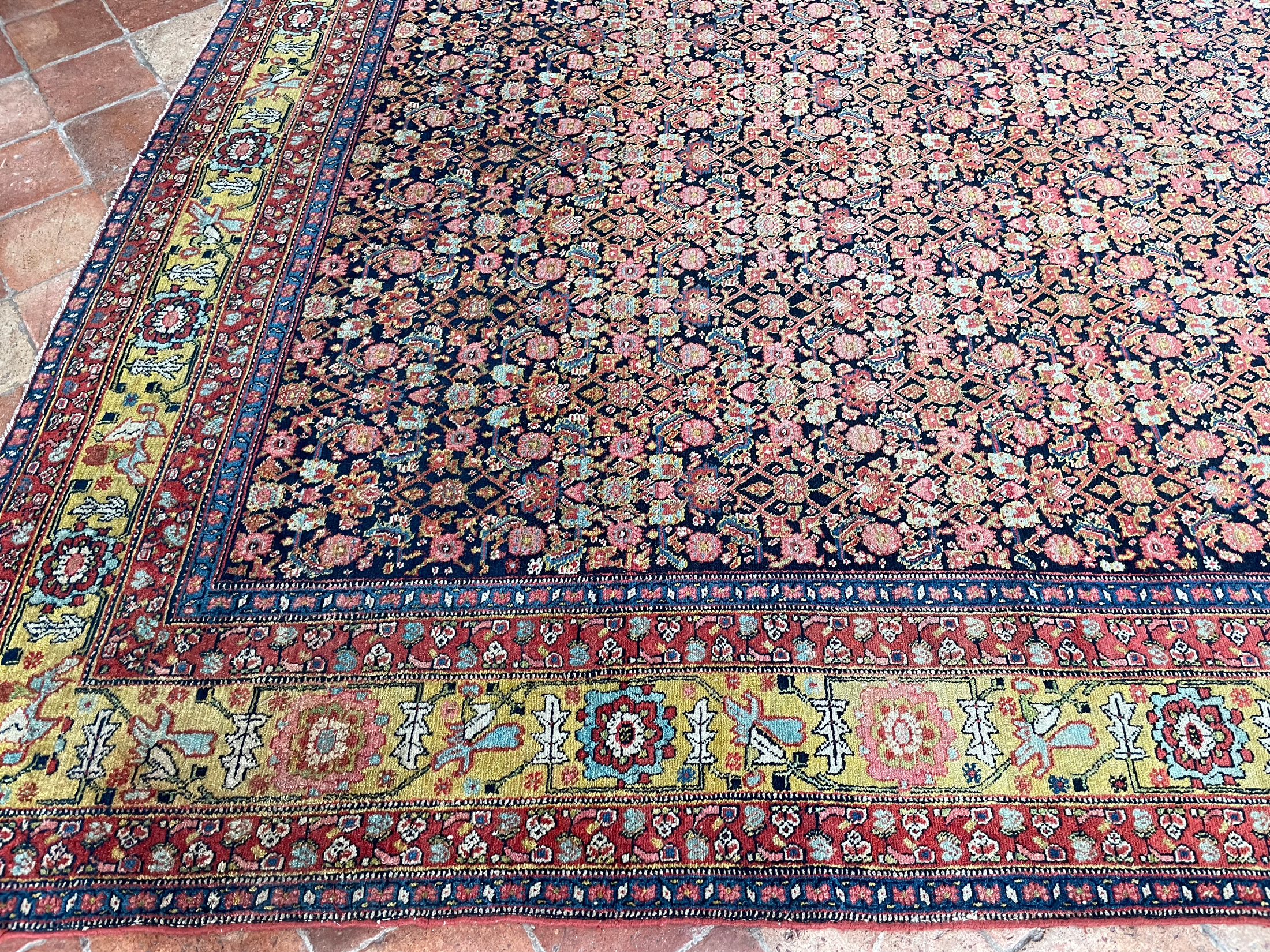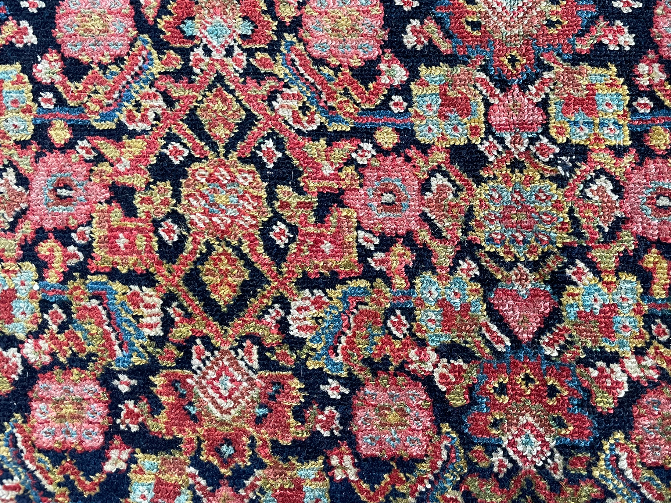 An exceptional, early antique Senneh kelleh, dating from circa 1860-1870 the weave is extremely fine indeed. This amazing large corridor carpet has a small scale all over Herati design, which in early carpets from the 16-17th century depicted two fish swimming around a water-lily. Rugs in the 18th-19th century had this design stylised which resembles two leaves around a flower. Dyes are stunning with a rich yellow border, with faded blue and pink flowers in the border too. Deep dark blues for the background which almost change to black in places and vibrant reds, oranges and hints of purple for the design.