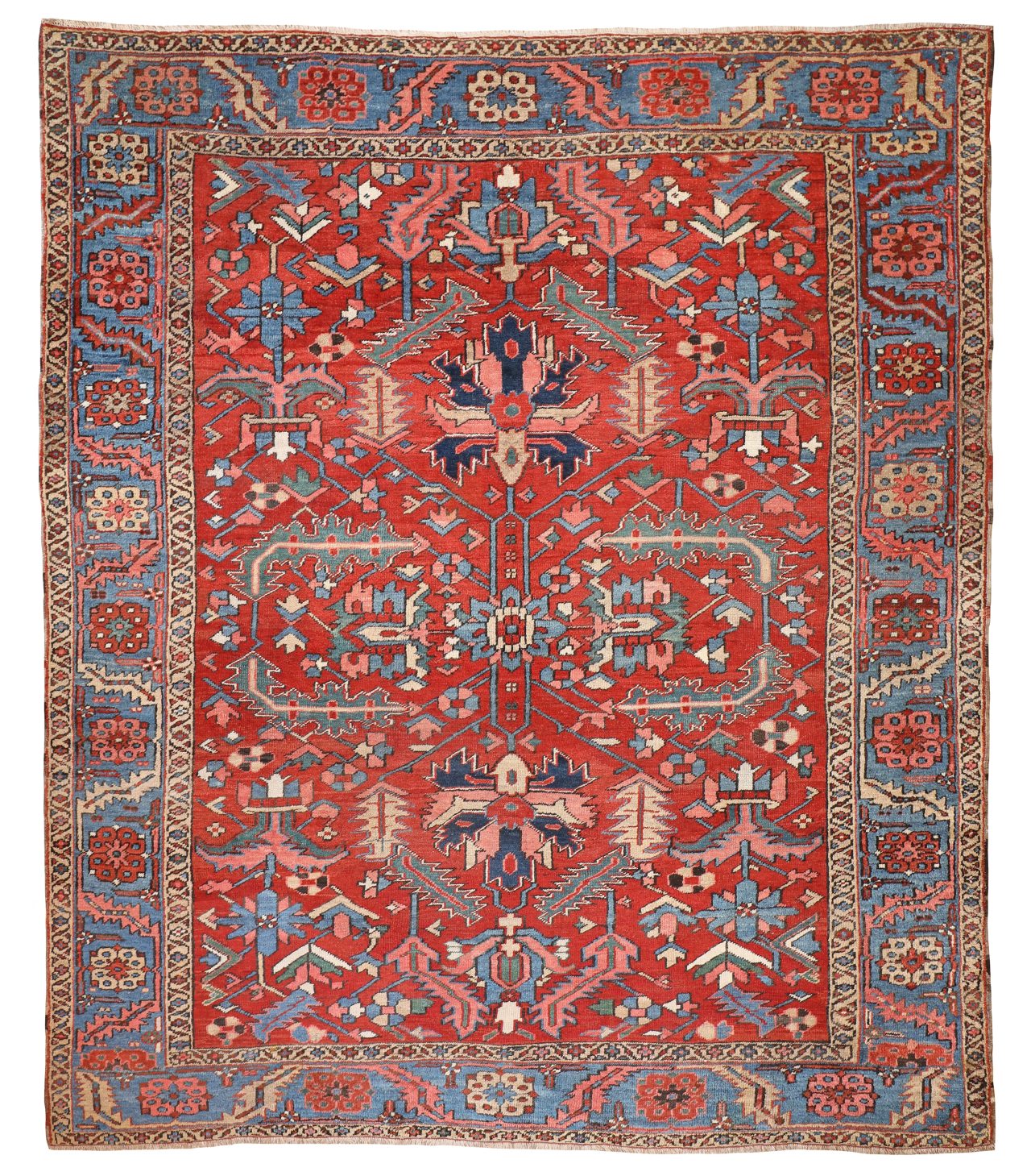 This Bakshaish has a wonderful large scale design with large green leaves and pale blue border, the rustic brick red/orange background is a fantastic base colour. Generally older pieces were more open than younger examples woven from the Heriz region in the North of Persia.  The charm and characteristics of antique carpets from this region woven in the late 19th century are simply wonderful.  A rare example of tribal weaving.