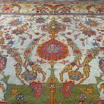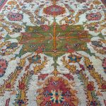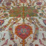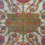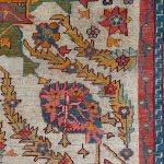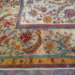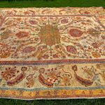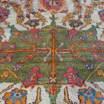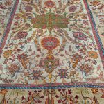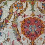 Wow! This Ushak is a true delight for the eyes! The design and colour palette are quite magnificent, full of early dyes from the late 19th century with a wide border using a fabulous large leaf design. The gorgeous pale green central motif with flame like golden leaves surrounding it all on an off-white to light grey tone background. The pale blues and greens are a particular highlight and would be wonderful to scheme fabrics with for a room. Please view all the additional images to see the colours up close, but really this carpet needs to be viewed with the naked eye, as it looks better in the flesh so to speak. If you would like to request a home visit or showroom visit we would love to show it to you soon.