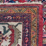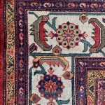 A beautiful antique Sultanabad carpet, which remains in near perfect condition despite being 130 years old. Woven in around 1890, the vegetable colours used are just perfect and a joy to see. The madder field is a wonderful warm tone, the restraint of then using an ivory colour for the main border gives the carpet a wonderful airy, uplifting feel. The additional colours are also superb, with soft greens, pale blues, and wonderful soft yellows. The design is a classical Mina-Khani design which is fabulous, the measurements and weaving skill that goes into this is very involved – every vine and flower sits perfectly spaced within the field design, with both sides and ends of the field being perfectly symmetrical – a very difficult achievement.