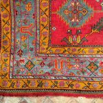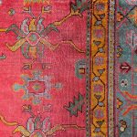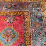 Ushak’s were woven in Western Anatolia which was one of the largest rug production areas since the Ottoman Empire. Their designs tend to be more open than Persian rugs and use soft natural dyes. The faded green border colour works so well with the soft reds and muted golden tones.