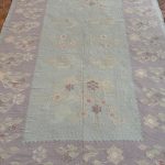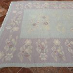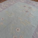 A very soft and pretty Bessarabian Kilim woven in the mid 20th century, in lovely condition and with gentle colours and an elegant floral pattern floating over the main background colour of light blue/grey. Each floral element has different tones and design to replicate barley, poppies, and various other flowers.  A really pretty kilim in excellent condition too, the pale purple to lilac tone border is a wonderful colour too.