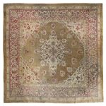 A soft toned and elegant antique Amritsar carpet with a beautifully woven design using classical elements from Indian weaving. Woven around 1870 the dyes are all vegetable – the main field colour an unusual dye, green to biscuit to gold tones, all varying and adding depth to the palette. Soft pinks famously used by amritsar weavers, the border is refined in design and colour, with faded dyes throughout. This is an ancient looking carpet, which does have some scattered wear, but really it adds to the whole feel of this piece. A hard to find, rare square size too.