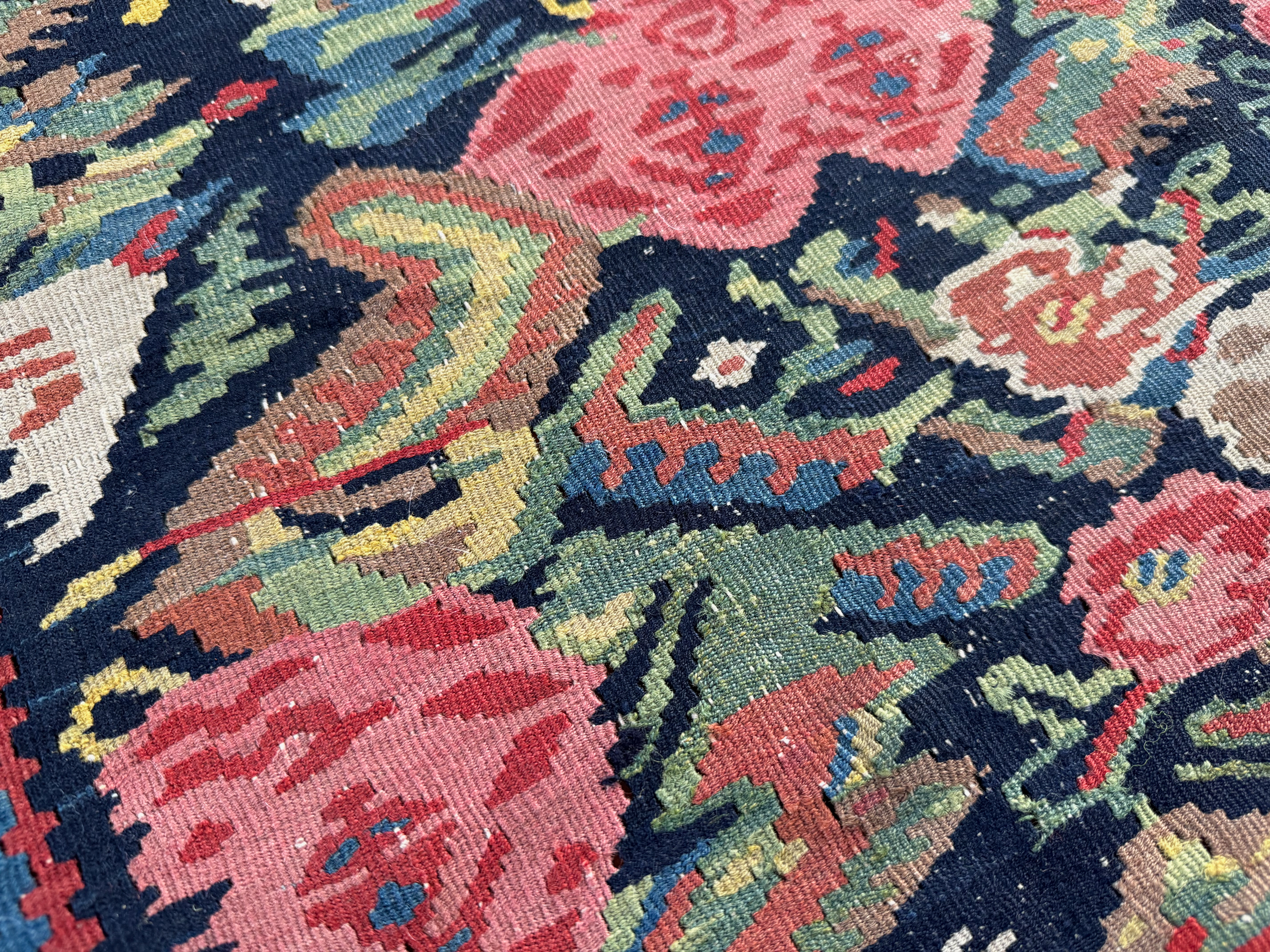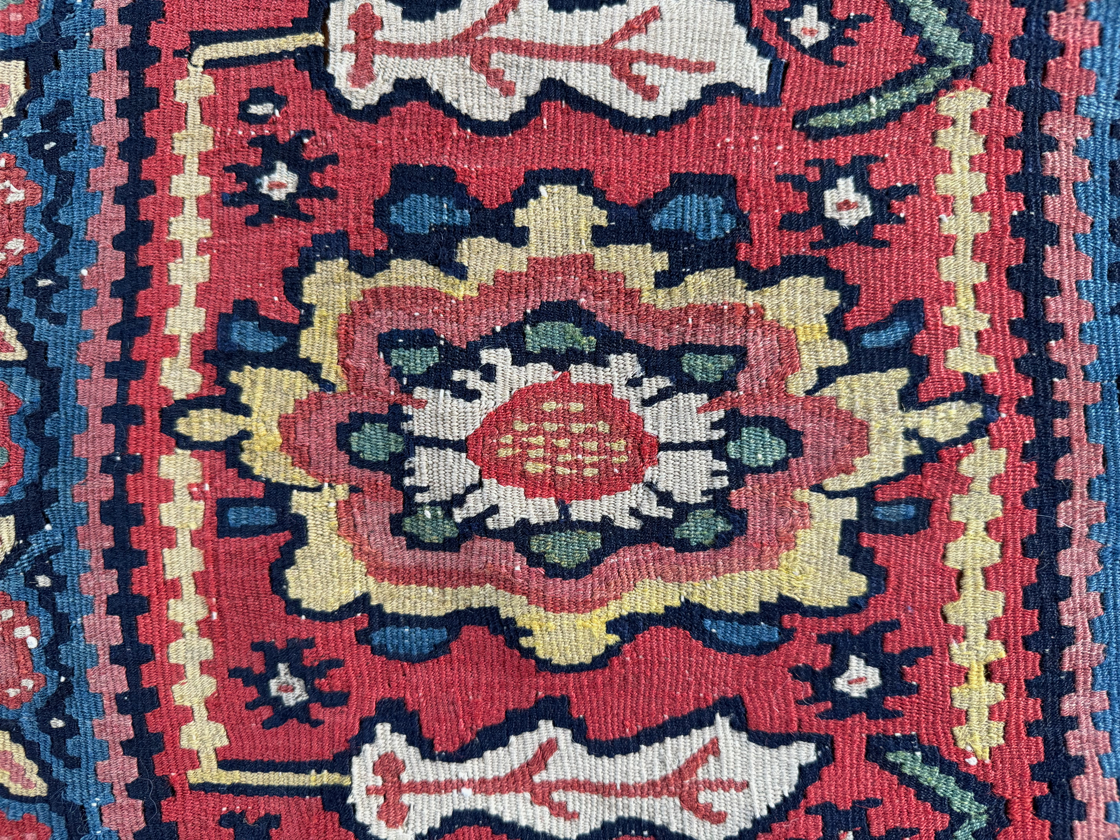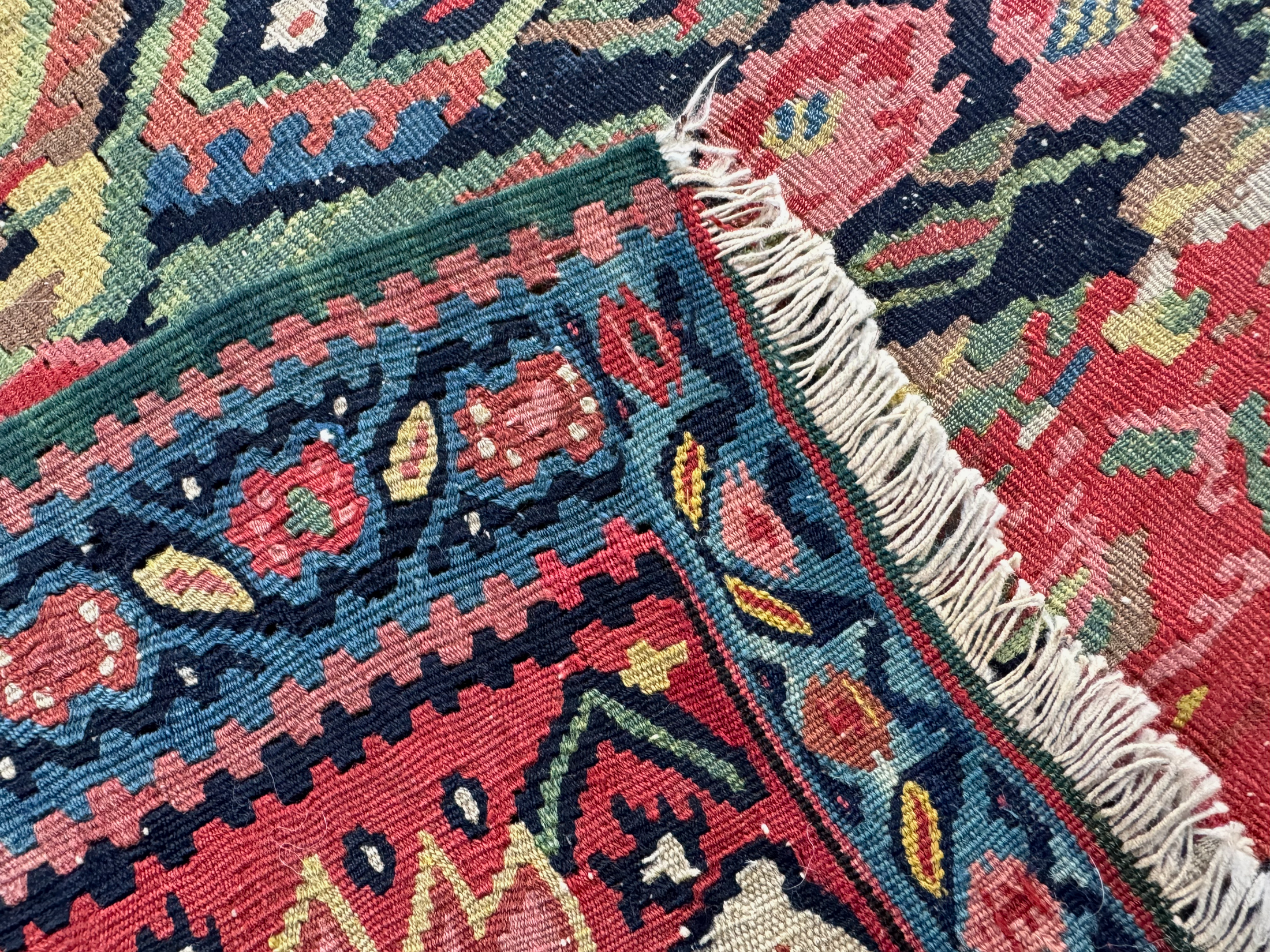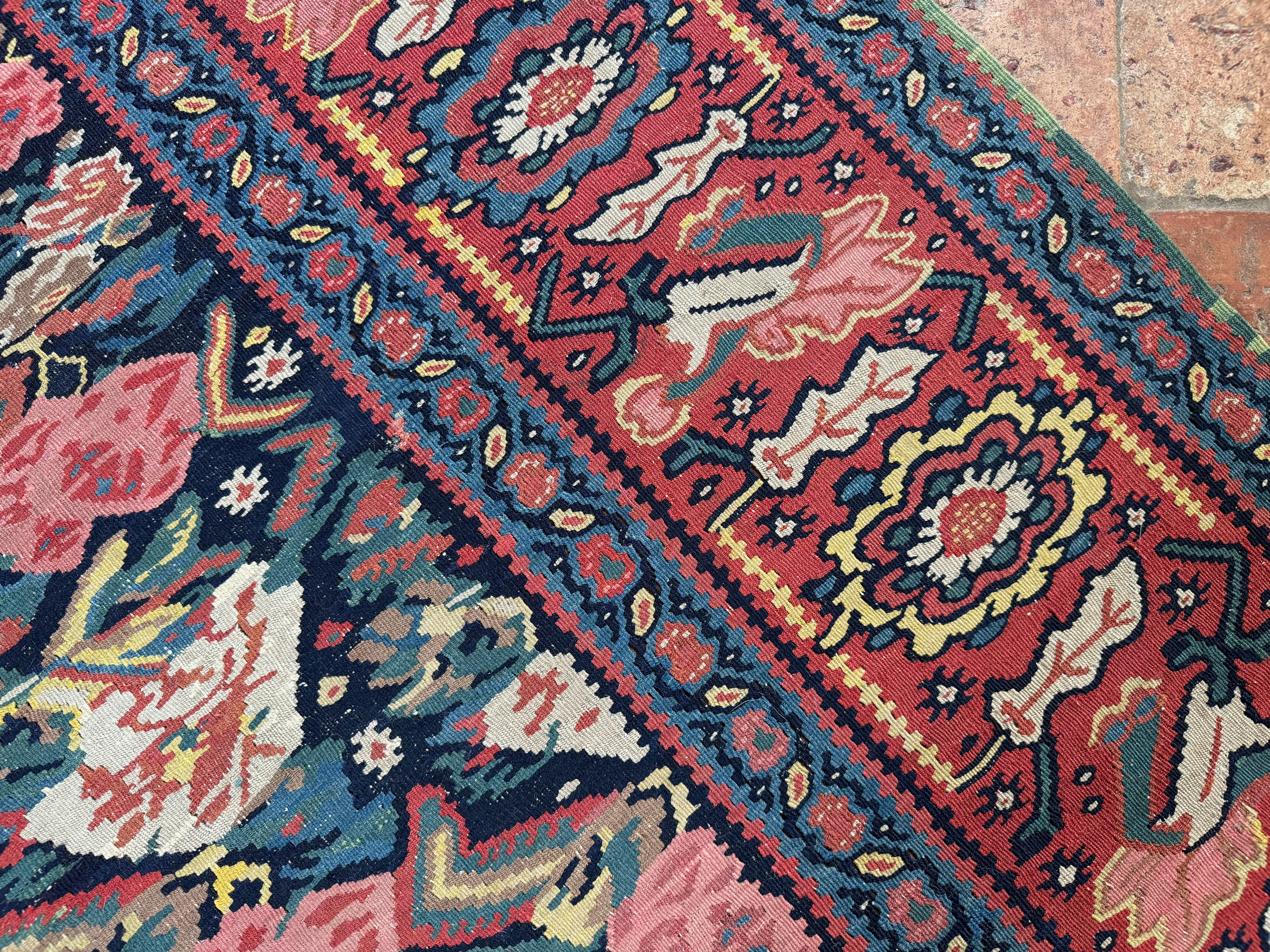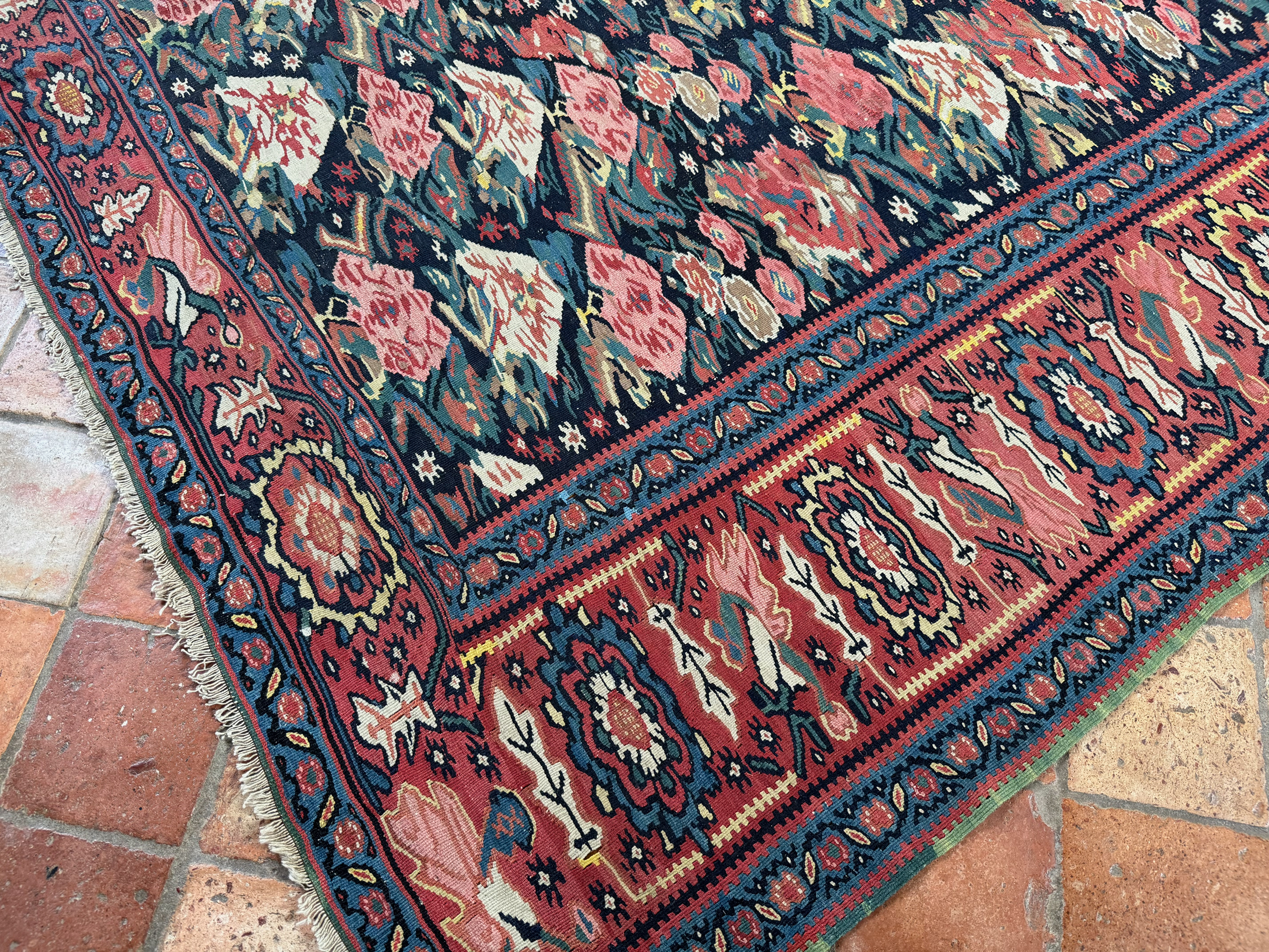 Exceptional condition it has been used on the floor and well looked after. We supply excellent anti-slip underlay to aid kilims, helping them stay flat on the floor. As unlike a wool piled carpet, these flatweaves are very thin and often move around. A beautiful rare kilim, as you never see kilims of this type and age in such amazing order.