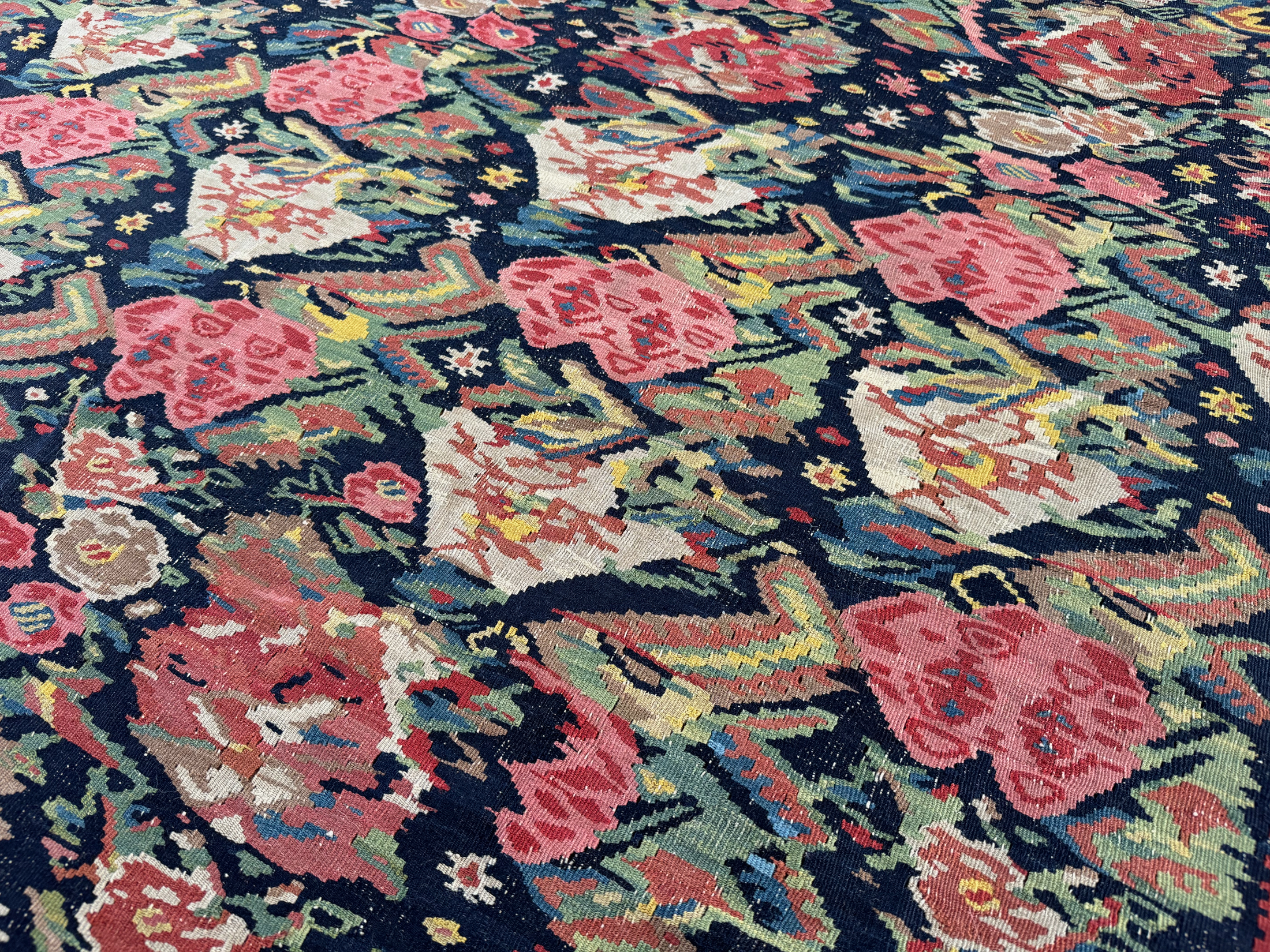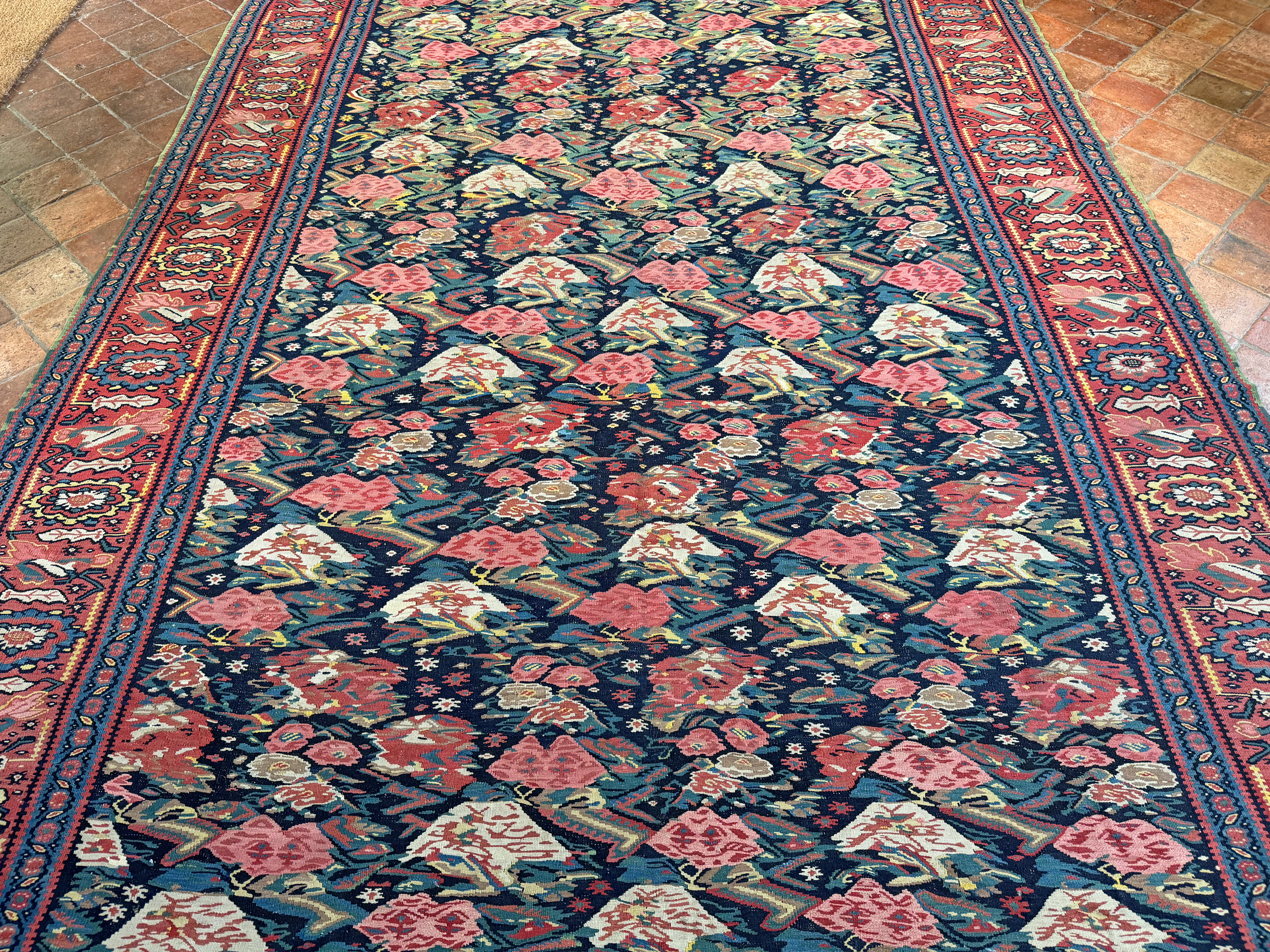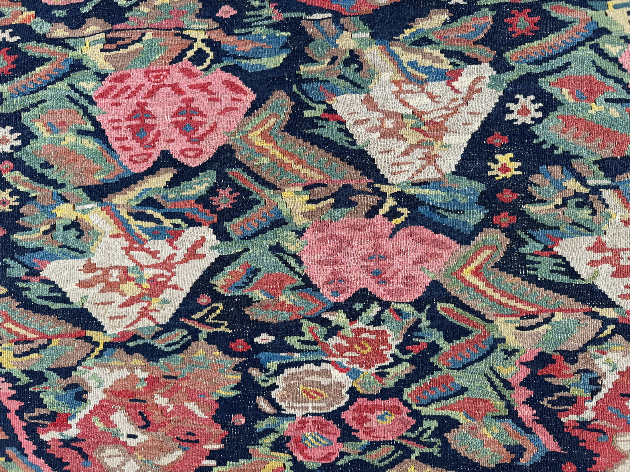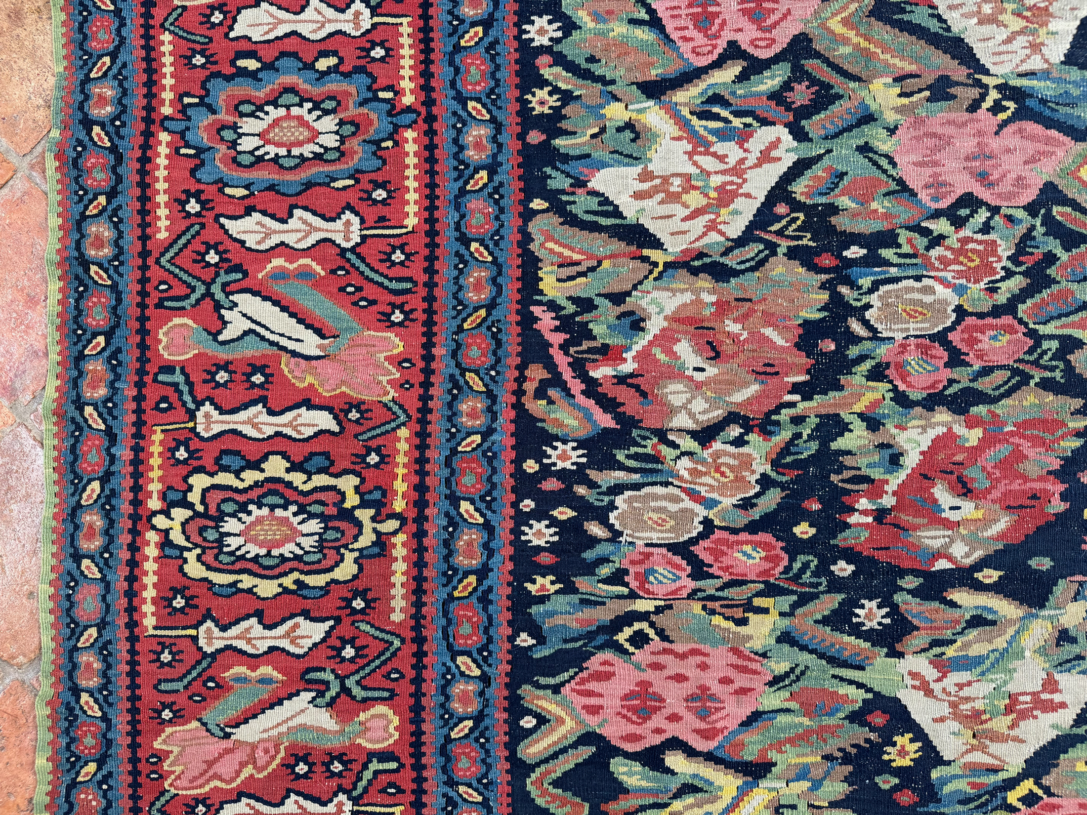 Exceptional condition it has been used on the floor and well looked after. We supply excellent anti-slip underlay to aid kilims, helping them stay flat on the floor. As unlike a wool piled carpet, these flatweaves are very thin and often move around. A beautiful rare kilim, as you never see kilims of this type and age in such amazing order.