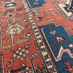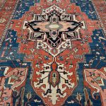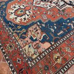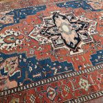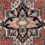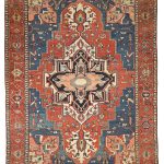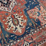 Antique Serapi carpets are more intricate finer tribal weavings of the Heriz region hand-woven by Azerbaijan Turkish inhabitants close to the city of Heriz in North-West Persia. They are famous among collectors because of their vivid vegetable dyes or soft earth tones that are woven on a geometric pattern. In terms of design, drawing, and coloration as well, Serapi carpets are clearly part of one and the same tradition as Heriz, despite being a distinct antique rug style, which originated as a Northwest Persian adaptation of early Sarouk Farahan medallion, but with a more geometric, abstract, village sensibility.