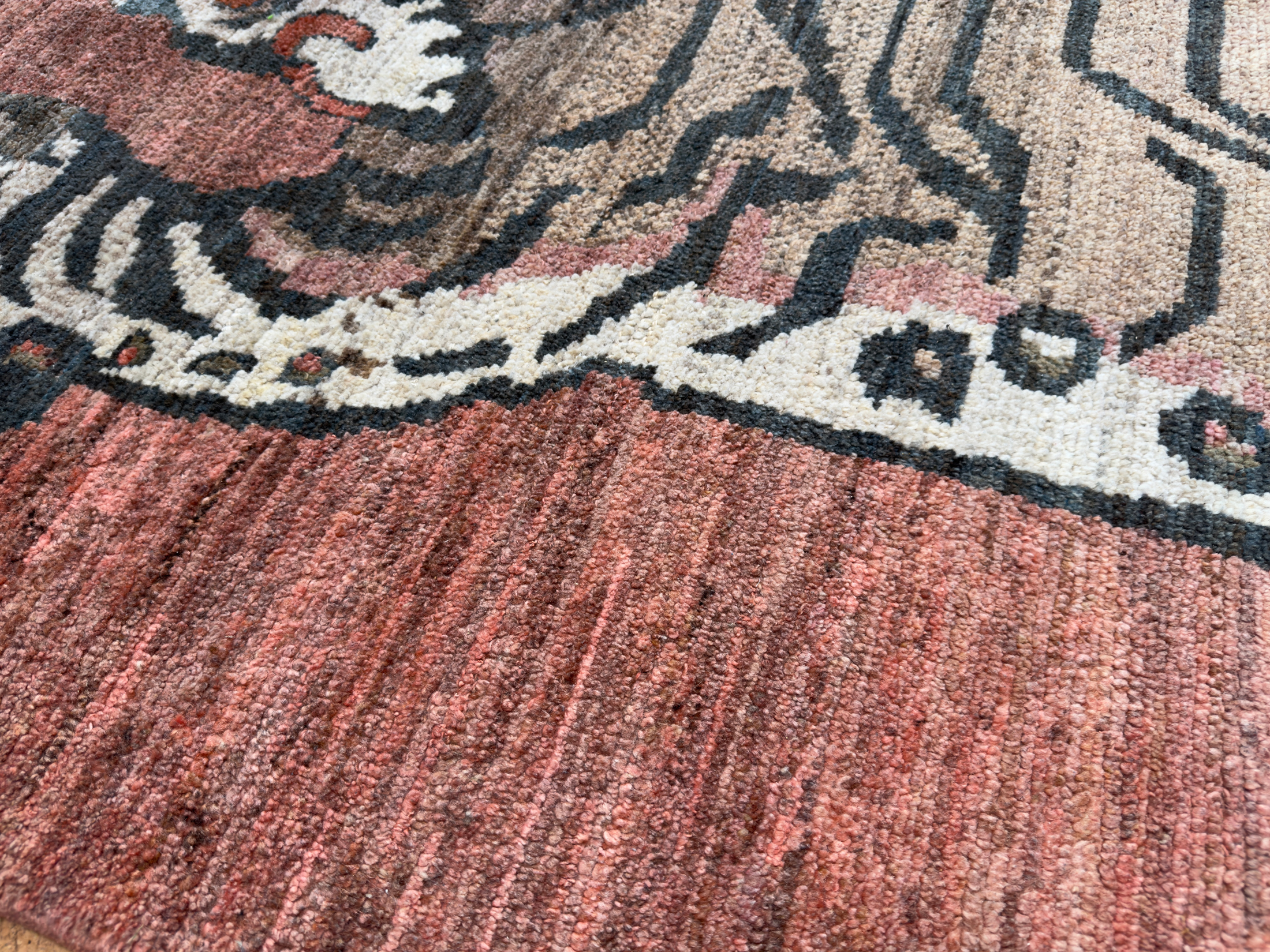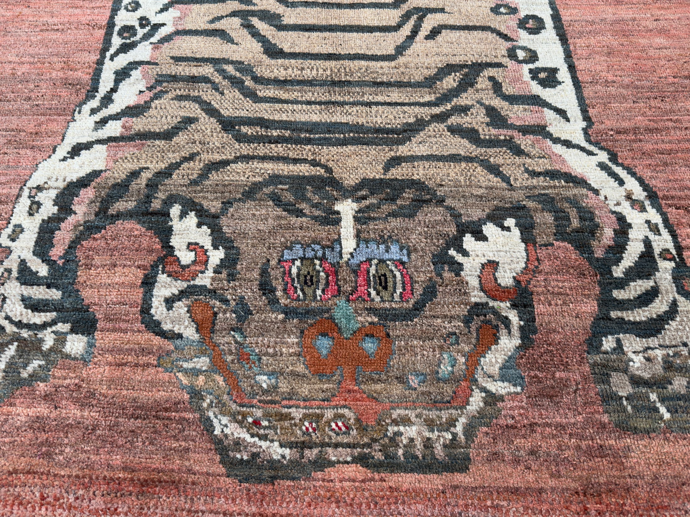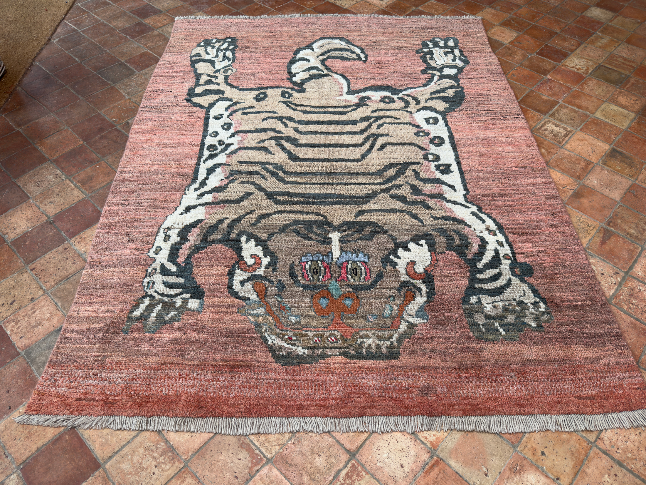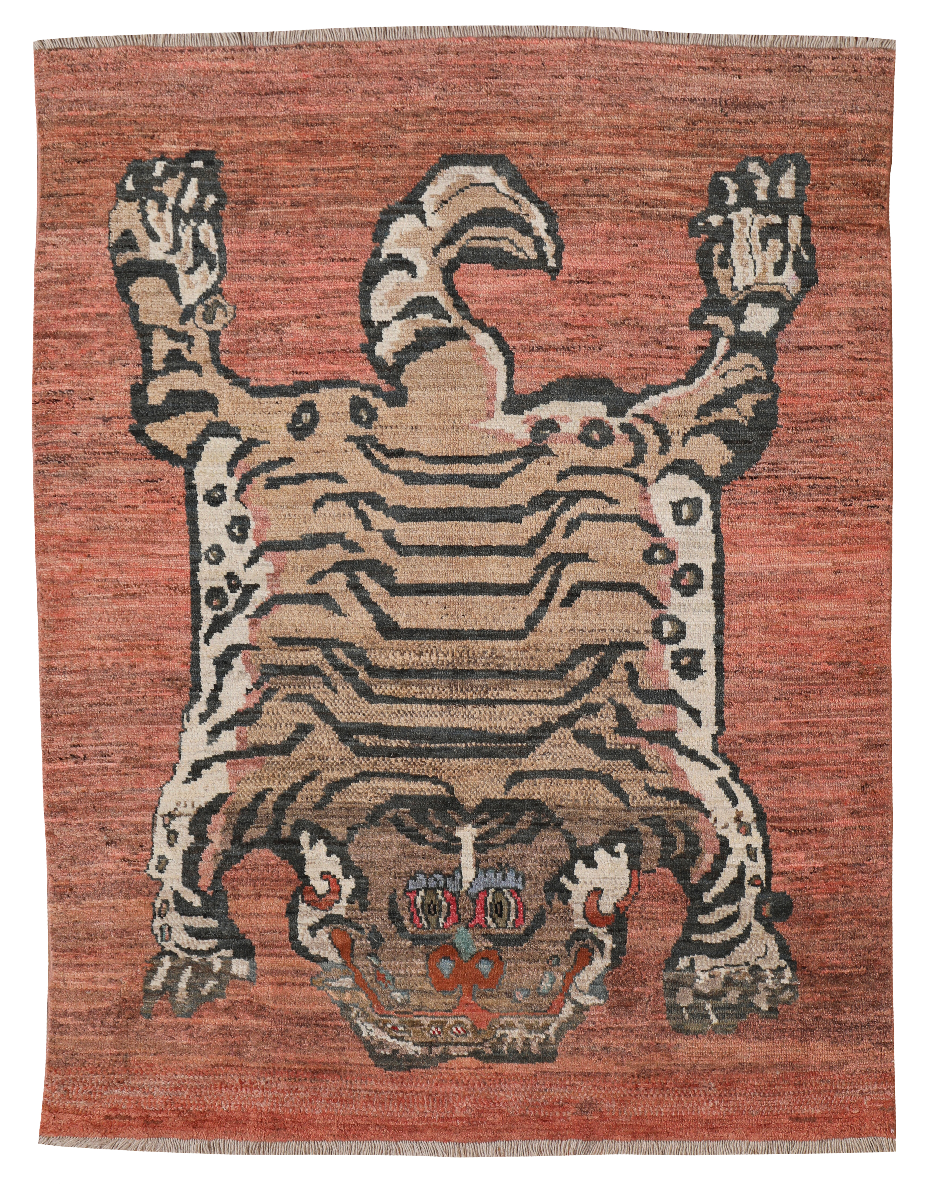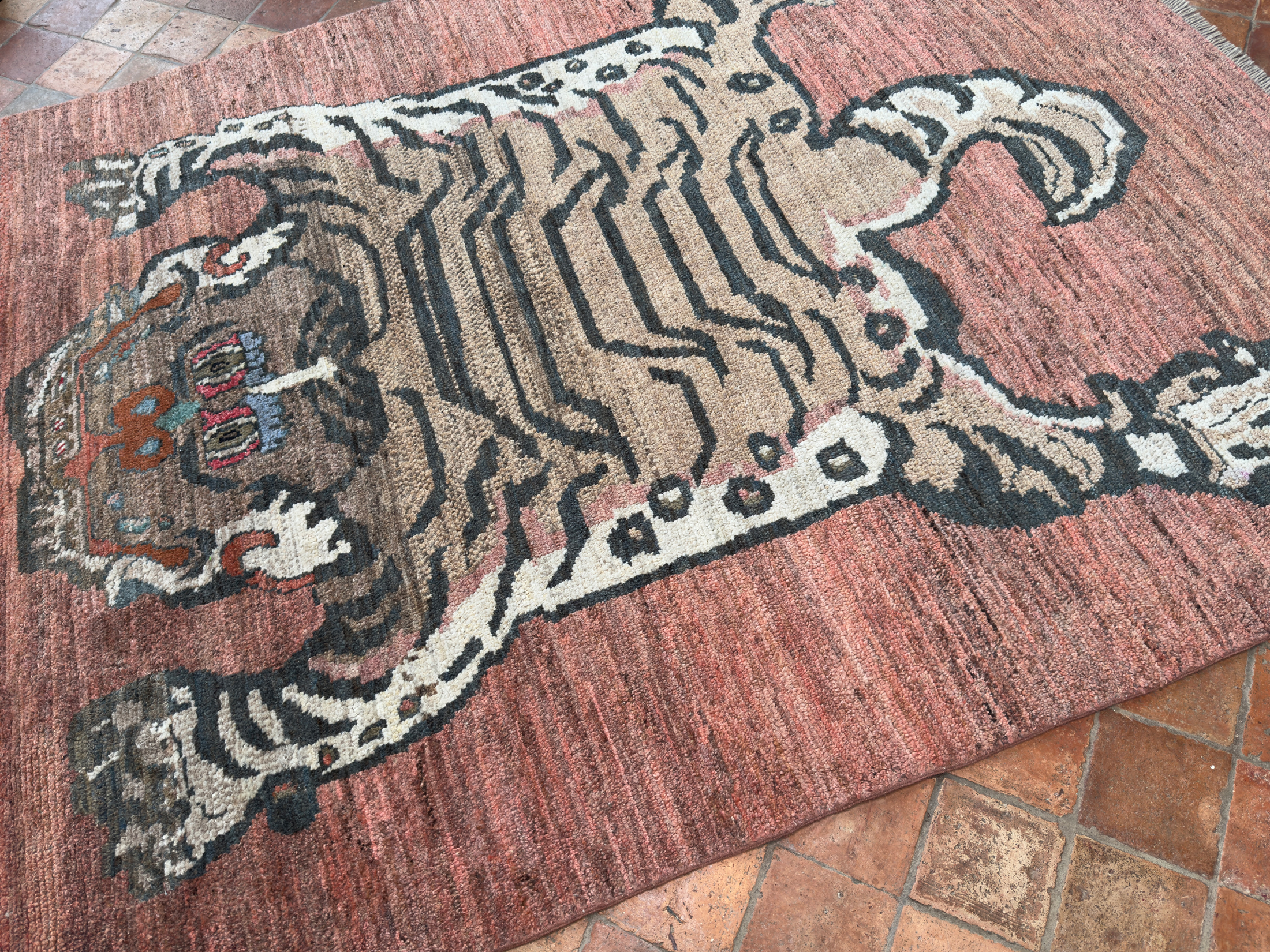 Tibetan tiger rugs are as culturally fascinating, and as poignantly elusive now as the tigers themselves. In the early 19th century woven tiger rugs became the substitute for the increasingly scarce Indian tiger pelts. The small number produced remained within the monasteries, and unlike other works of Tibetan art appeared outside Tibet only in 1976, when an example was taken to the USA.