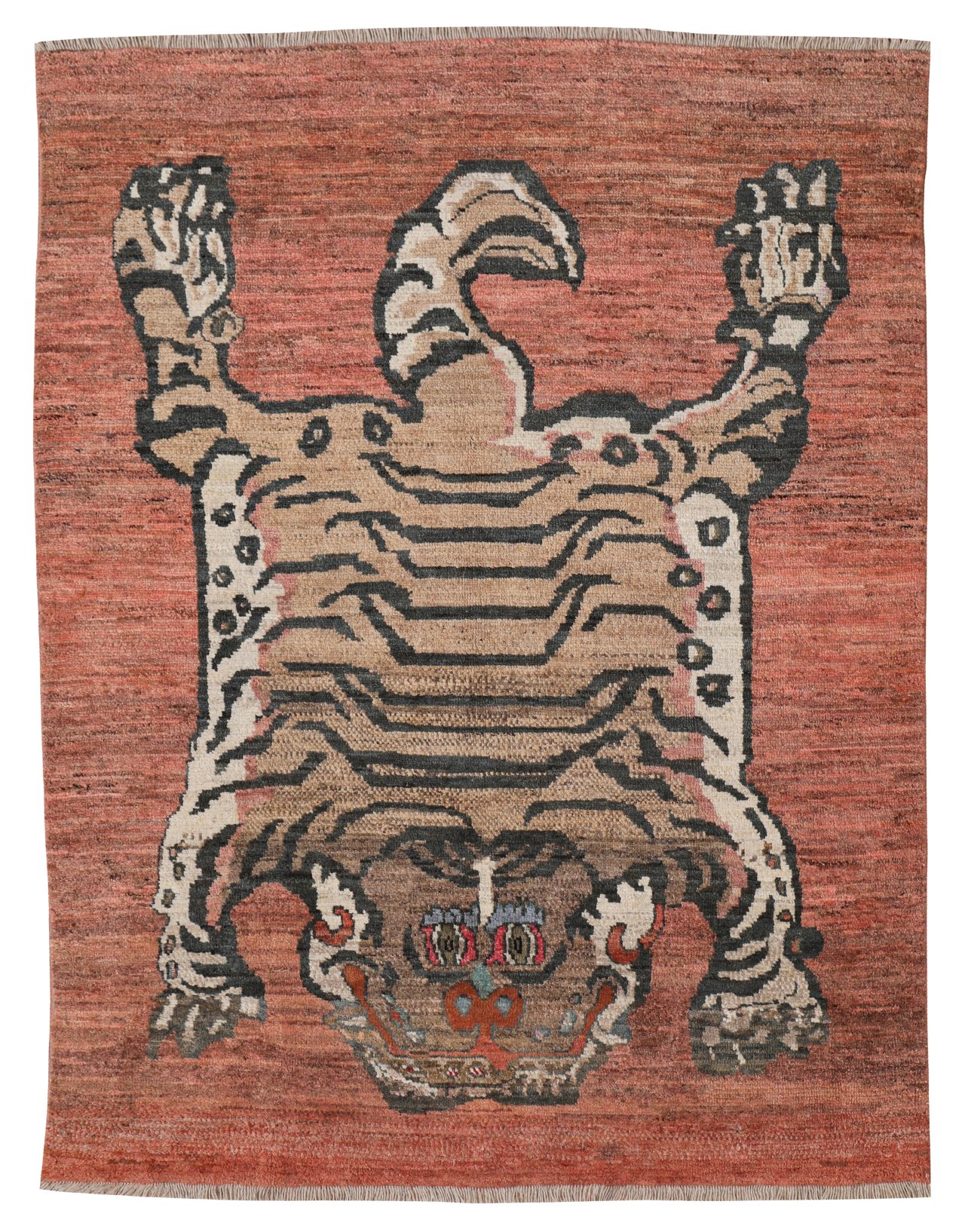 Hand-woven using fabulous natural dyes and the softest of hand-spun wool, these are beautifully created and an appreciation of the weaving history of Tibet and the Tigers revered status in their culture. This contemporary Tiger rug, taking designs from ancient Tibetan tiger rugs using a wonderful variant of natural colours.