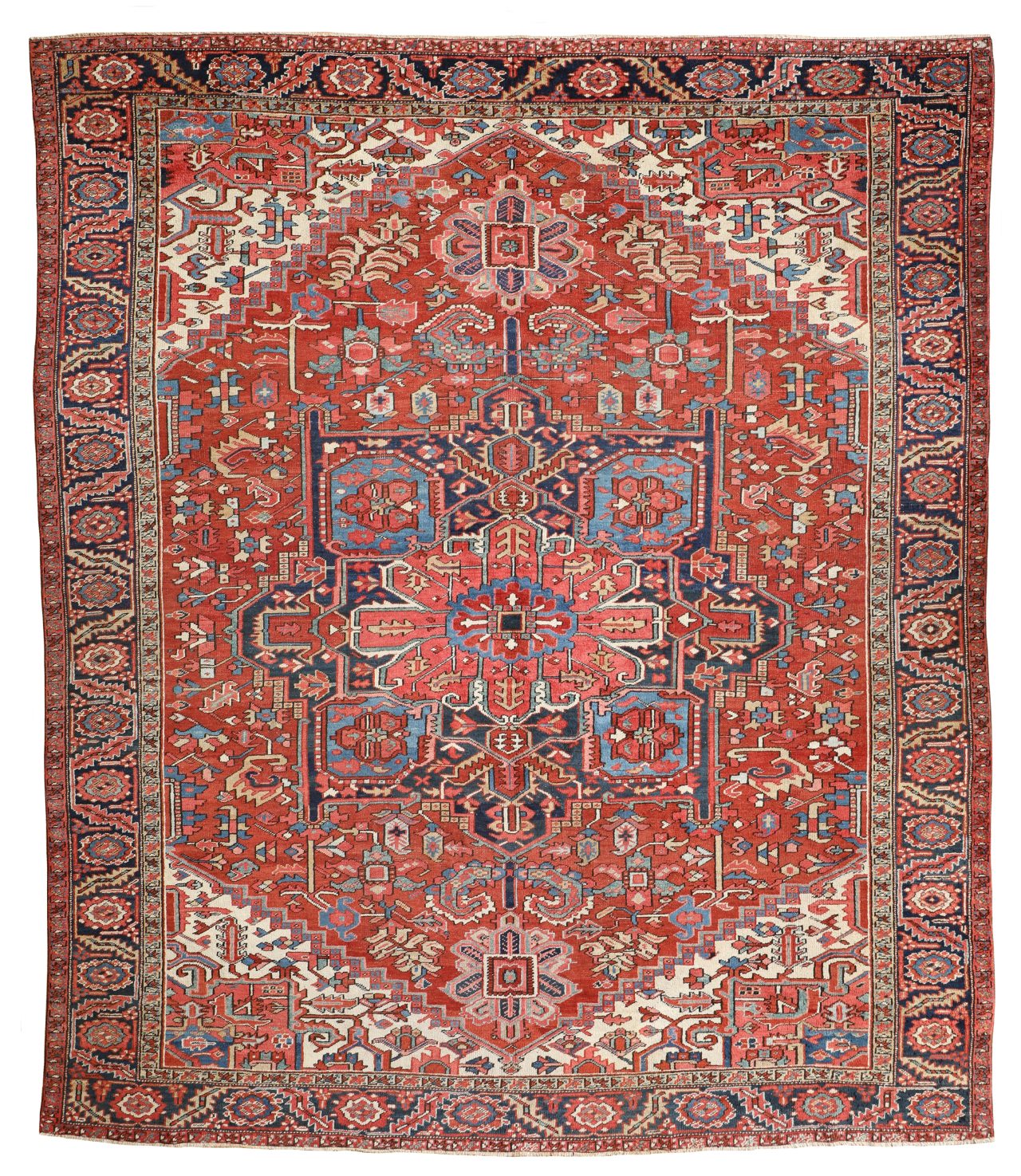 A wonderful rustic antique Heriz carpet with beautiful colours, a refined geometric pattern with detailed leaves, pale blue medallion and soft off white, ivory corners which lifts the whole palette. The warm brick reds are a wonderful natural dye too. Condition is really excellent, a great wool pile and dating from circa 1890-1900.