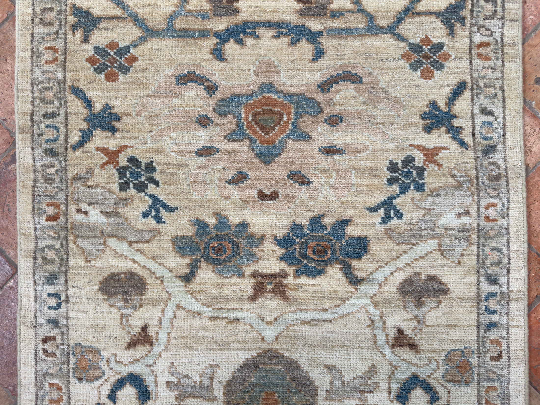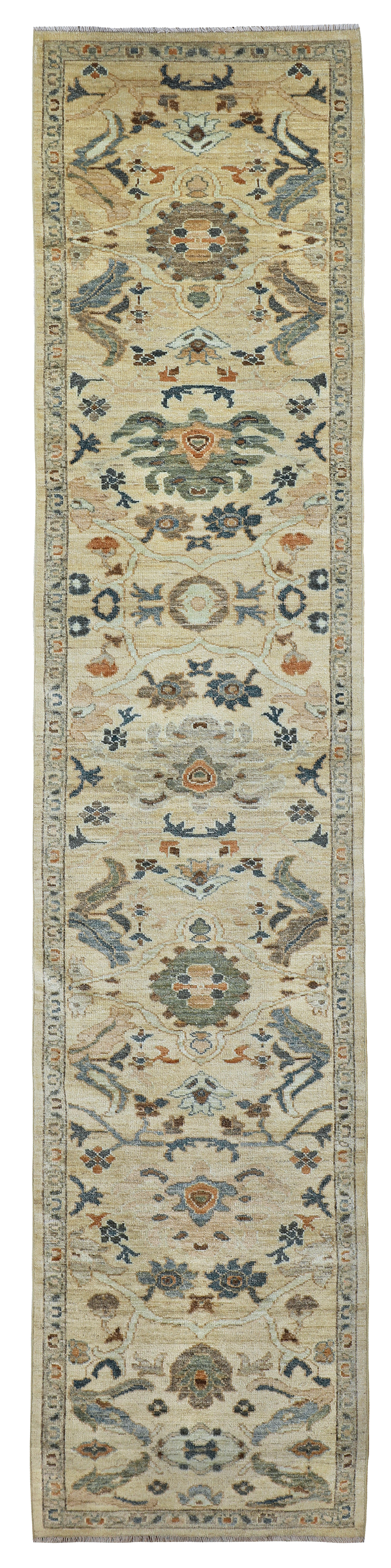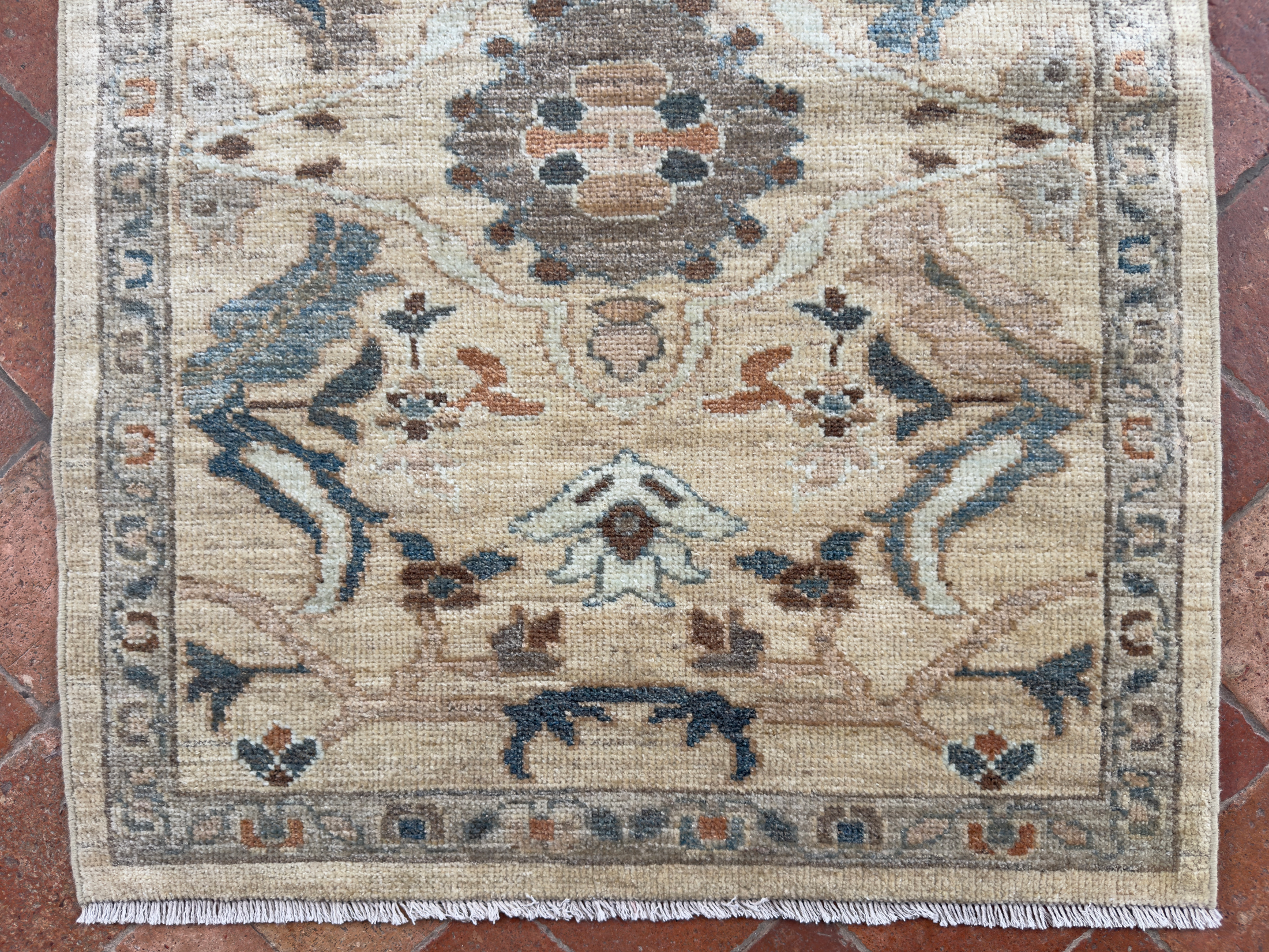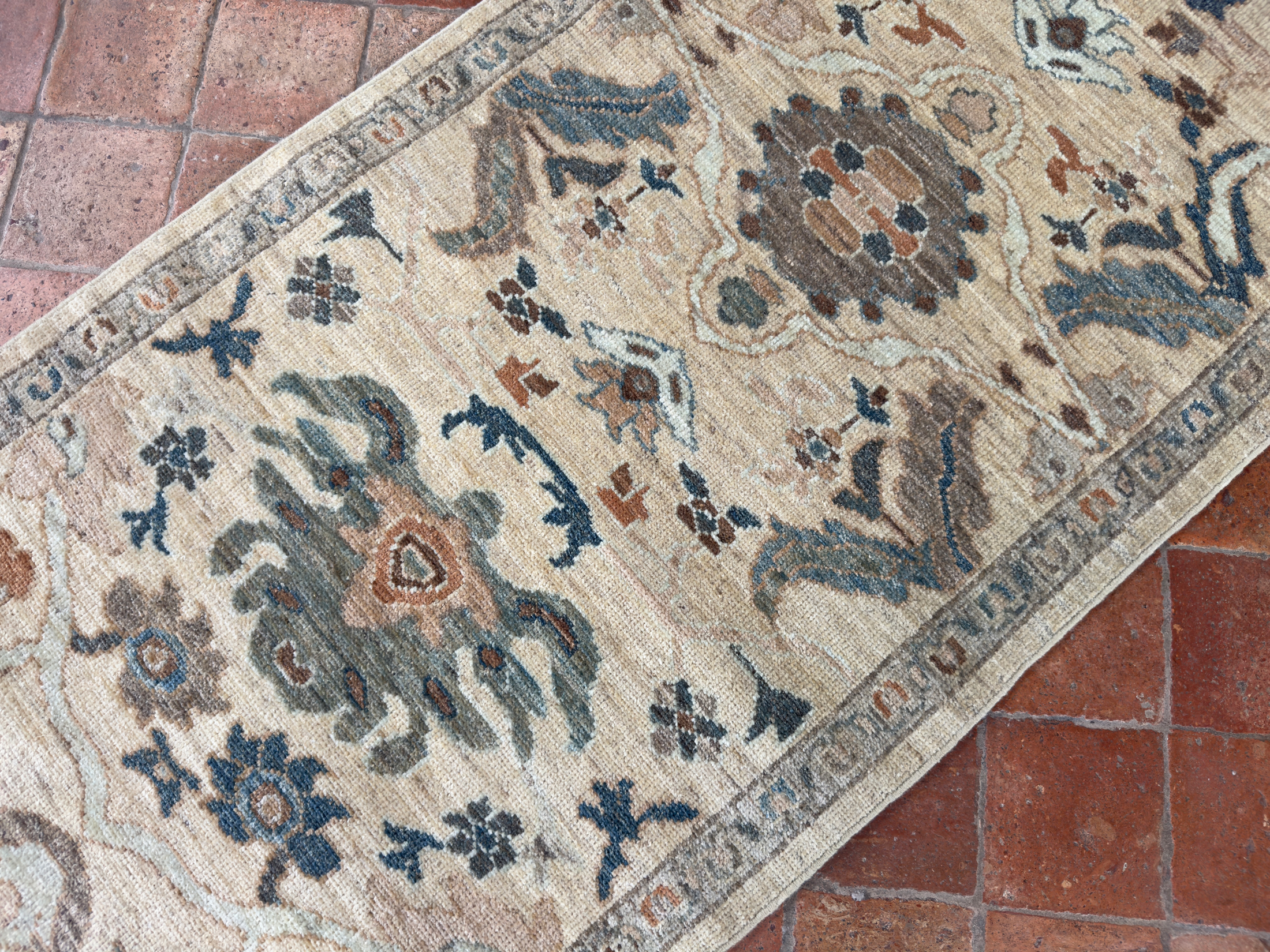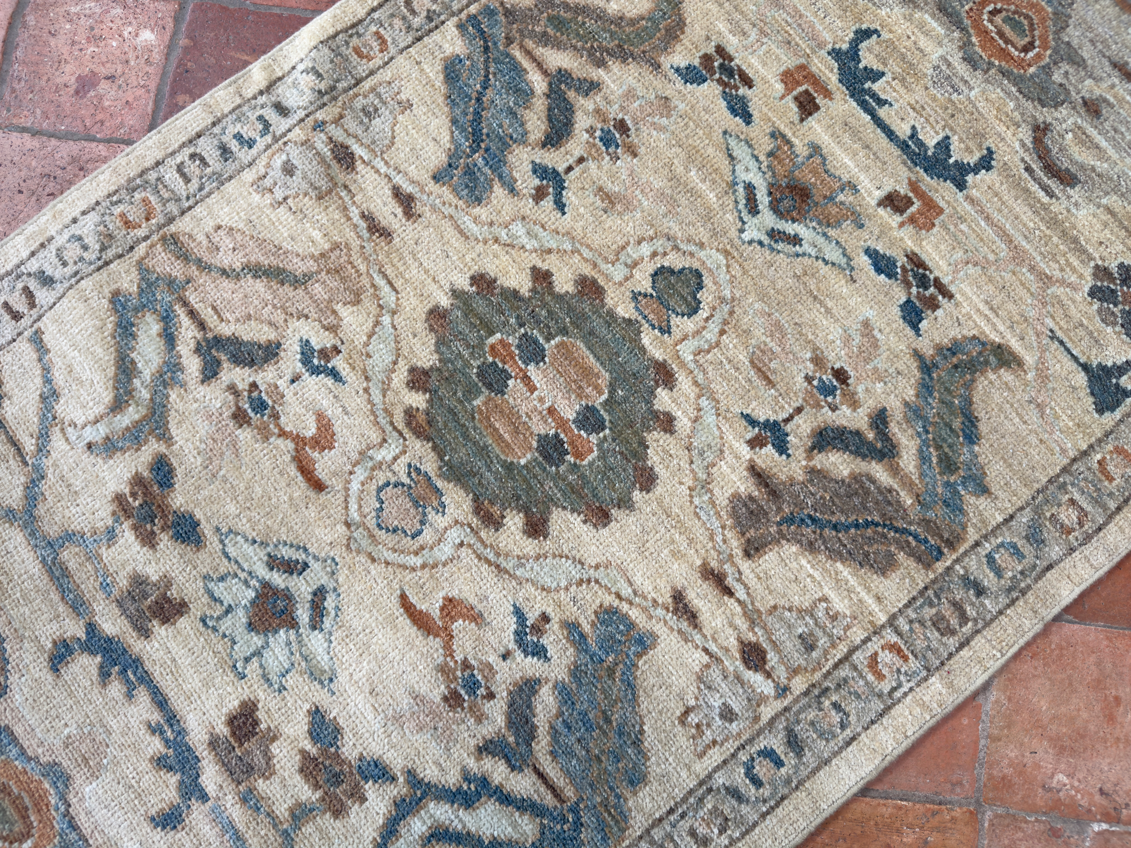 A soft sandy toned contemporary Sultanabad runner that would enhance any corridor or hall and brighten the space. Hand-woven with all natural dyes and soft wool. Sandy yellow tones, greens, pale blues and muted terracottas these are all lovely colours to use for the well spaced out pattern, all hand-woven with soft wool.