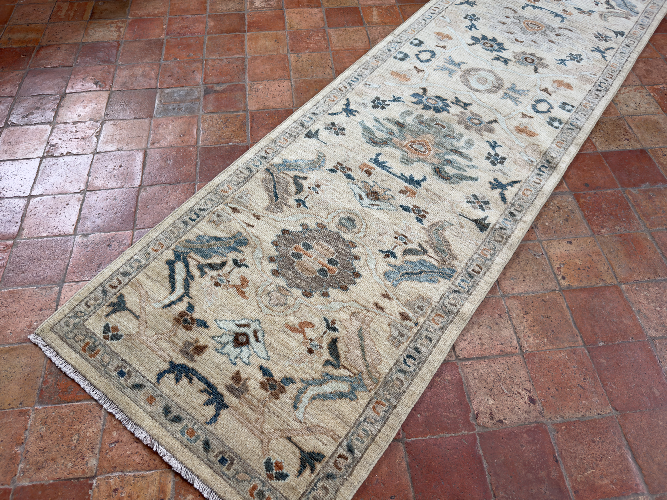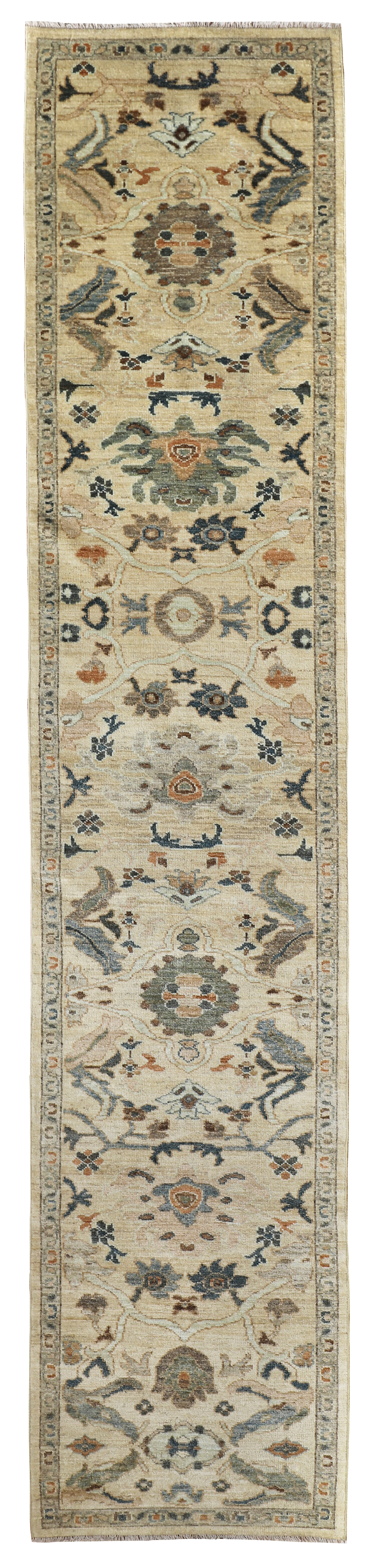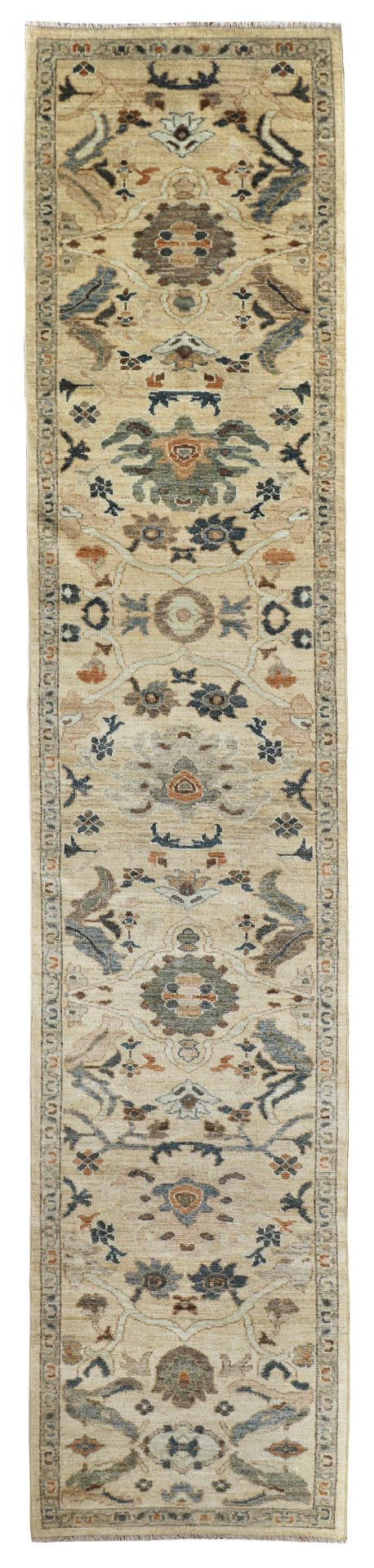 A soft sandy toned contemporary Sultanabad runner that would enhance any corridor or hall and brighten the space. Hand-woven with all natural dyes and soft wool. Sandy yellow tones, greens, pale blues and muted terracottas these are all lovely colours to use for the well spaced out pattern, all hand-woven with soft wool.
