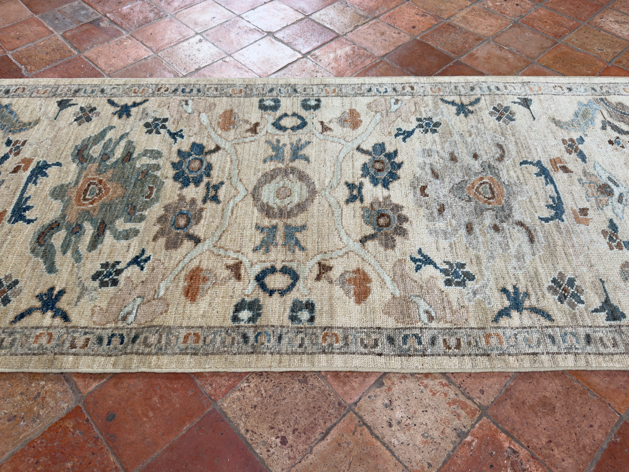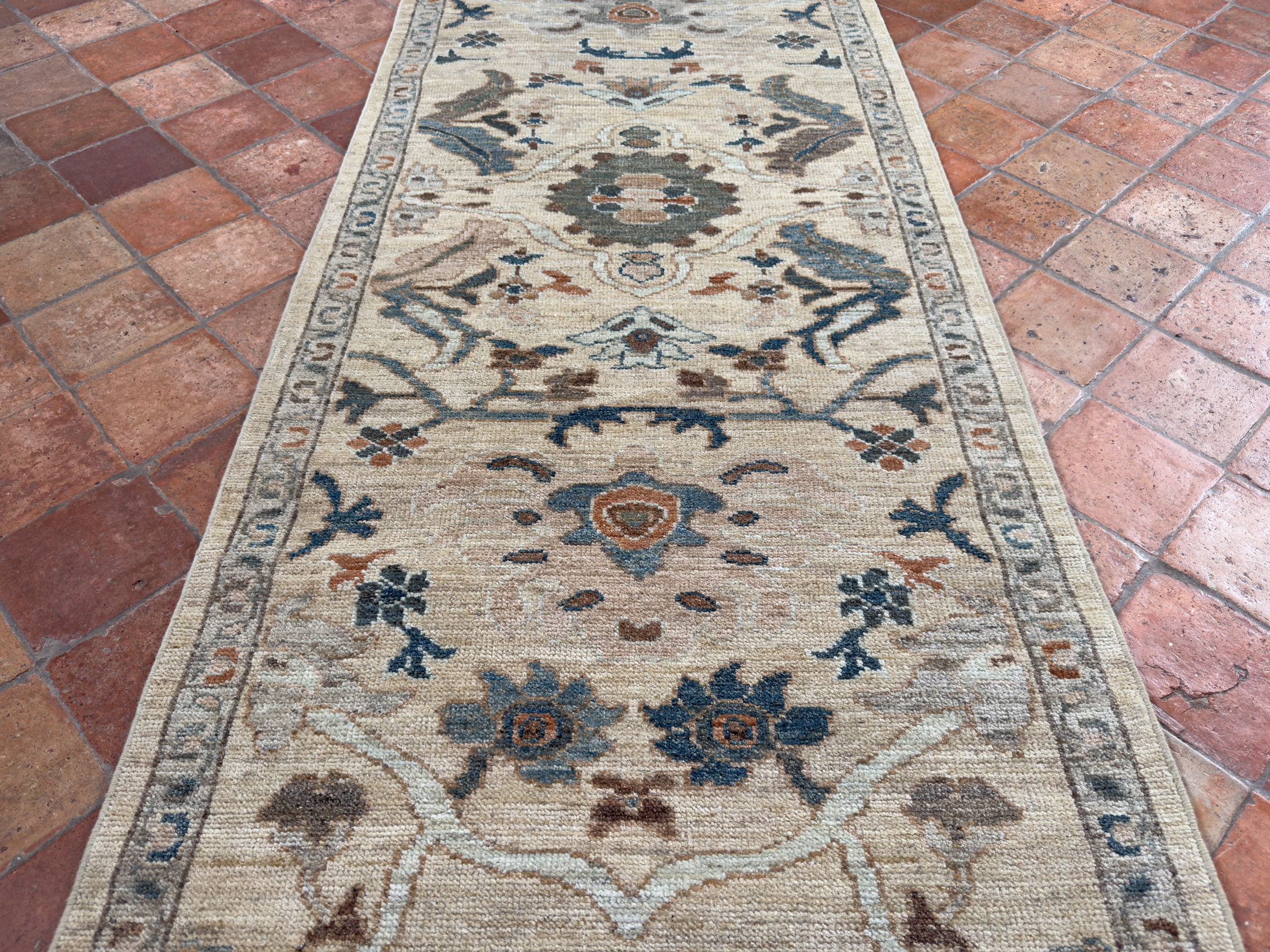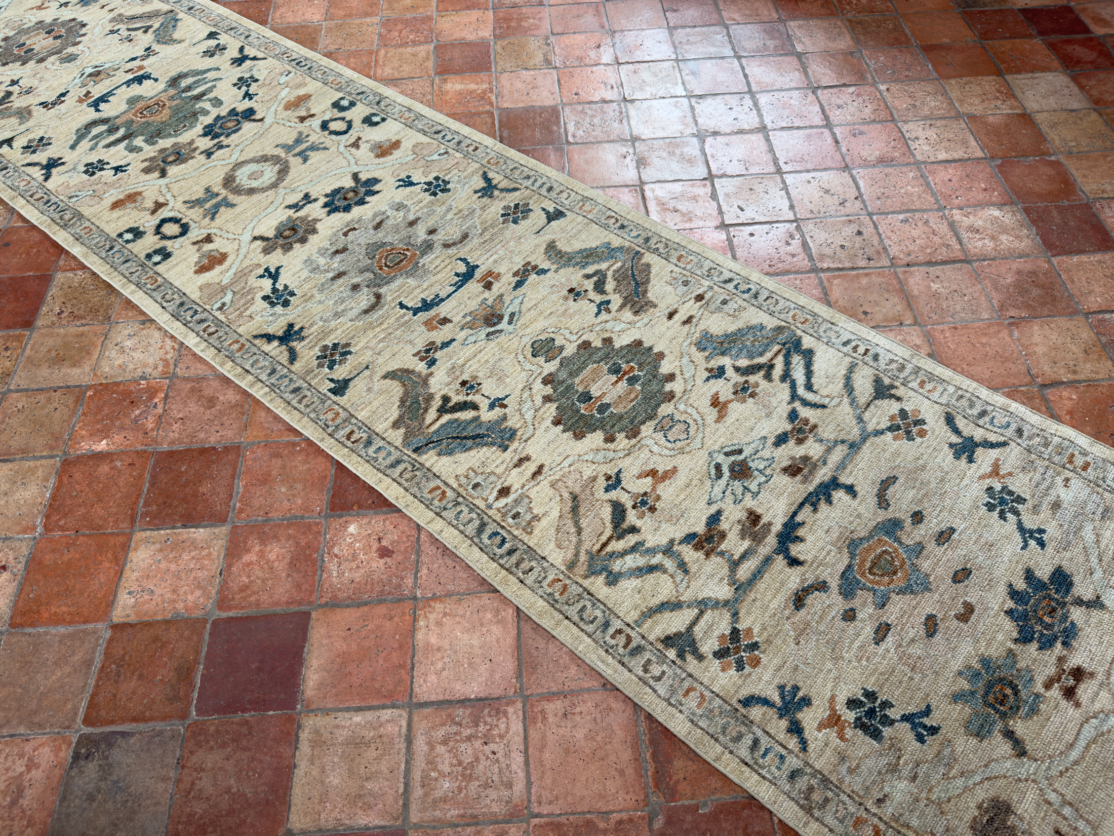 A soft sandy toned contemporary Sultanabad runner that would enhance any corridor or hall and brighten the space. Hand-woven with all natural dyes and soft wool. Sandy yellow tones, greens, pale blues and muted terracottas these are all lovely colours to use for the well spaced out pattern, all hand-woven with soft wool.