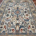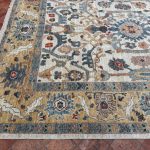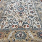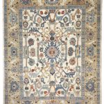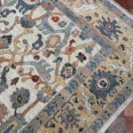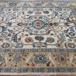 A contemporary carpet with modern, fun colours, using traditional designs, the main border of a subtle flowers and stylised leaves is executed beautifully by the best weavers today. The dyes are faded yet have warmth, with an off-white background, lovely blues, sage green tones, burnt oranges, dusky pinks, the best light blues, gold hues, and hints of warmer reds, there are so many colours to work in an existing scheme or to build a room around this carpet. It would be a lot of fun choosing fabrics to work with this wonderful carpet.