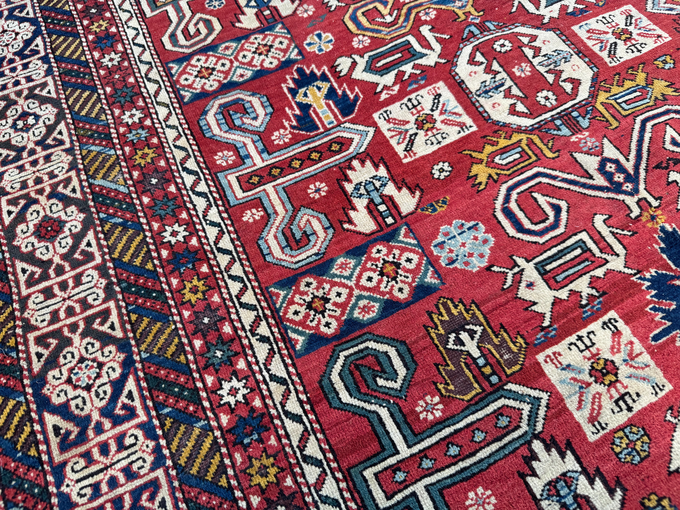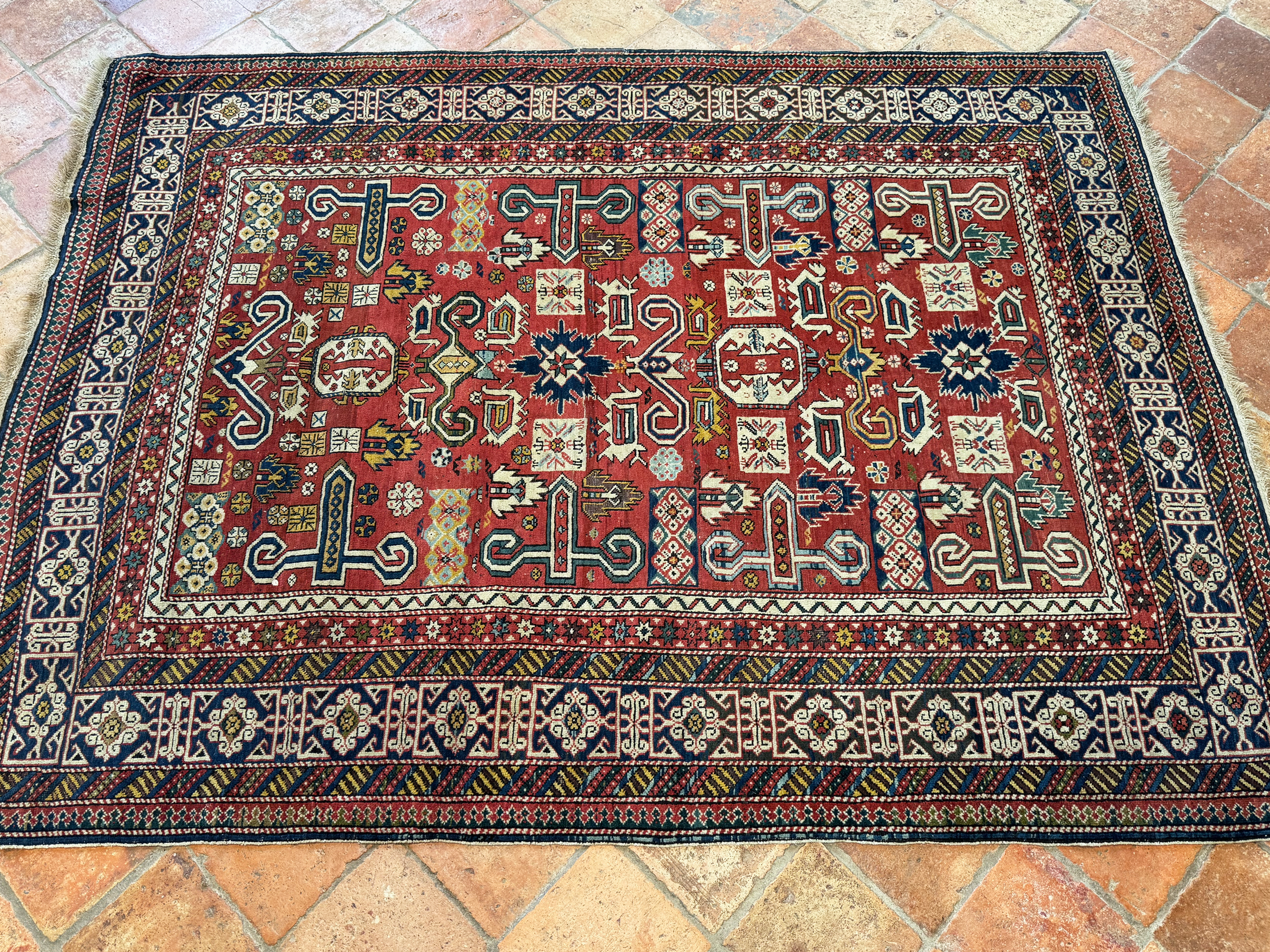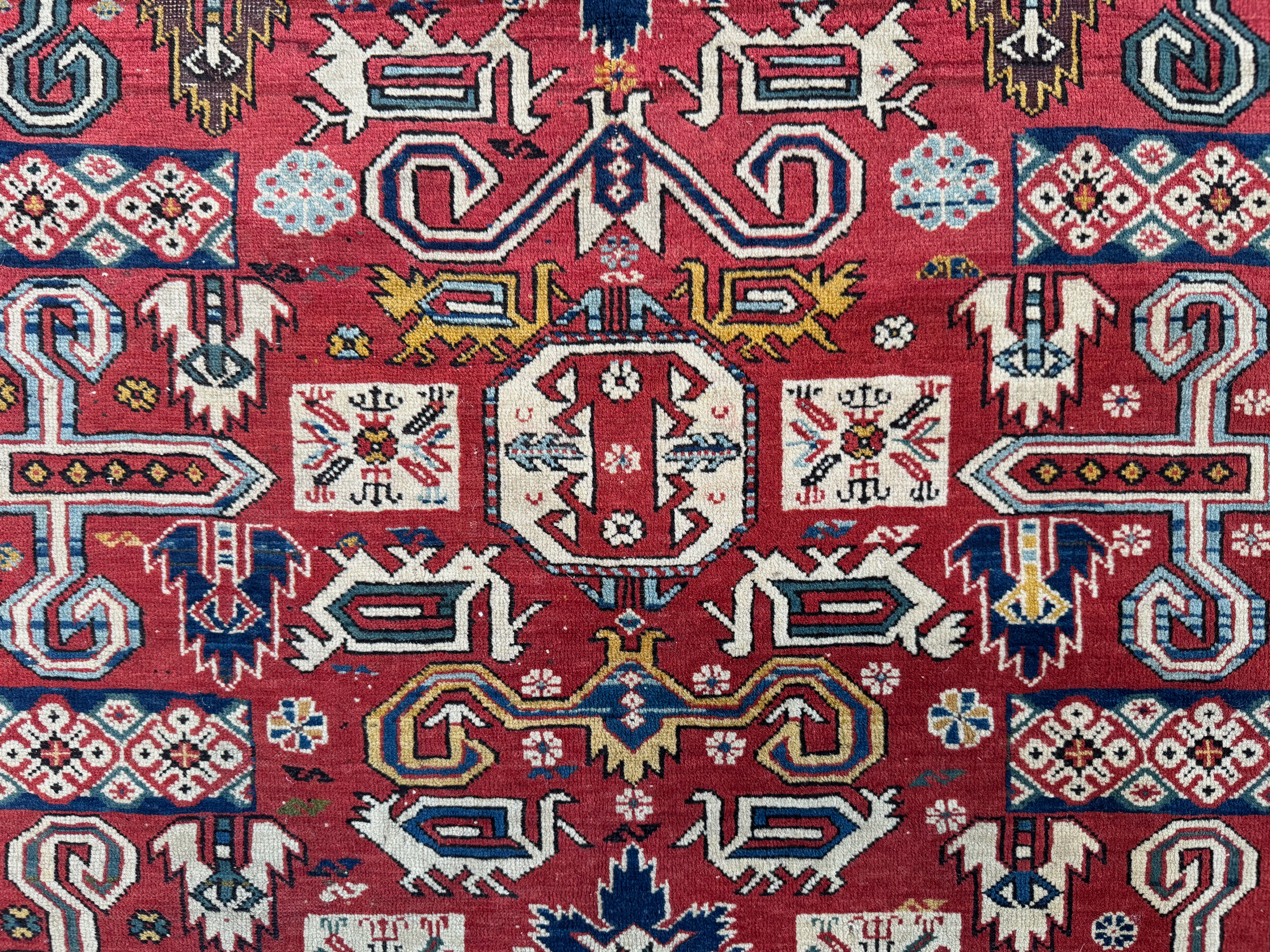Wonderful soft toned Antique Perepedil rug in very good original condition.  With vivid and varying dyes of orange and red dyes, some pinks and teal blues, an antique Caucasian rug with great colour and depth. A classical Perepedil design with the famous rams’ horn design in the field.  This rug has an unusual ground colour being red – most Perepedils’  being woven with a blue ground.  A rare rug for a collector, or to be used as a decorative item, with a great soft wool pile.