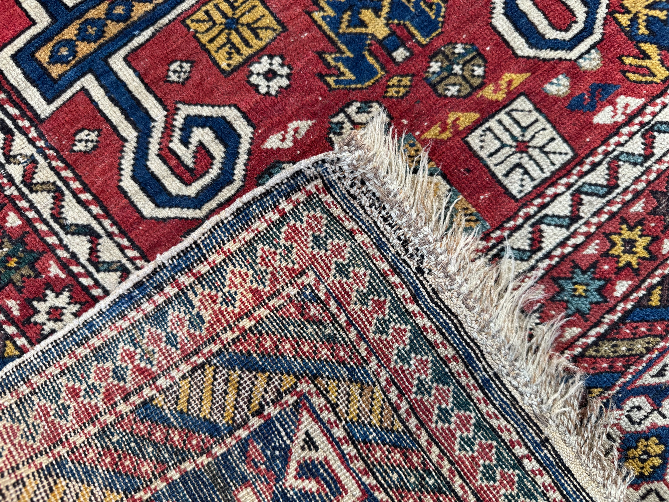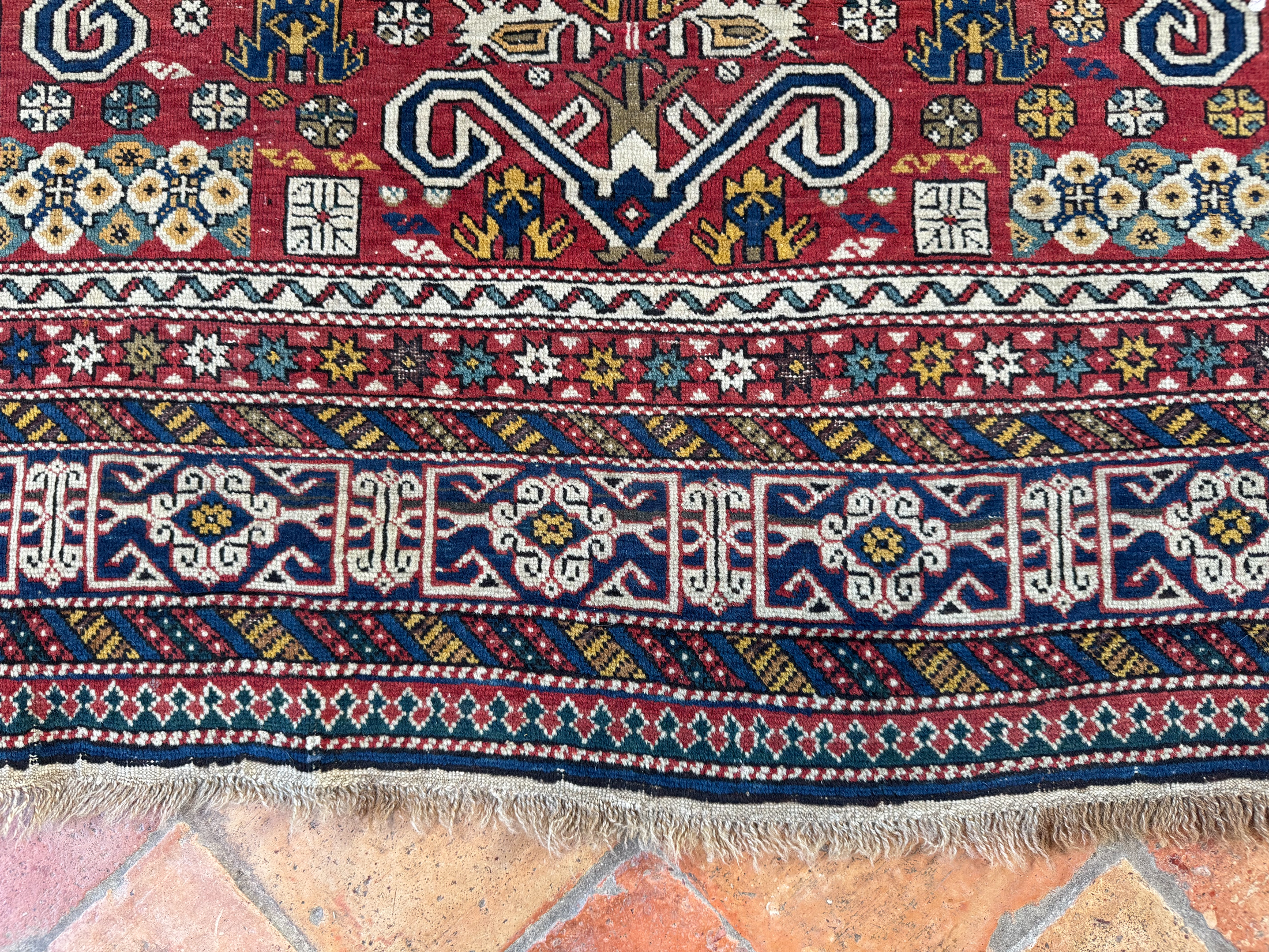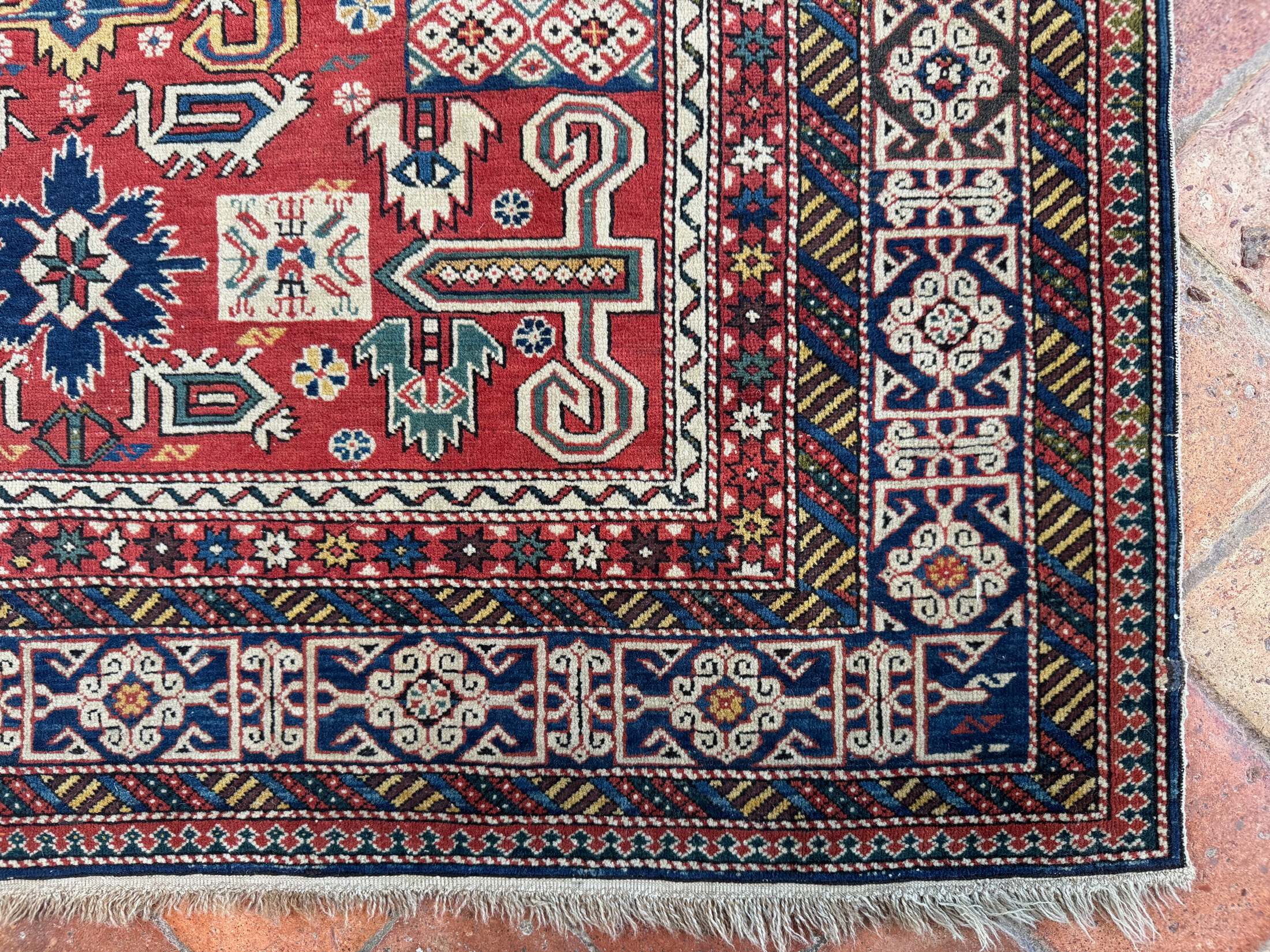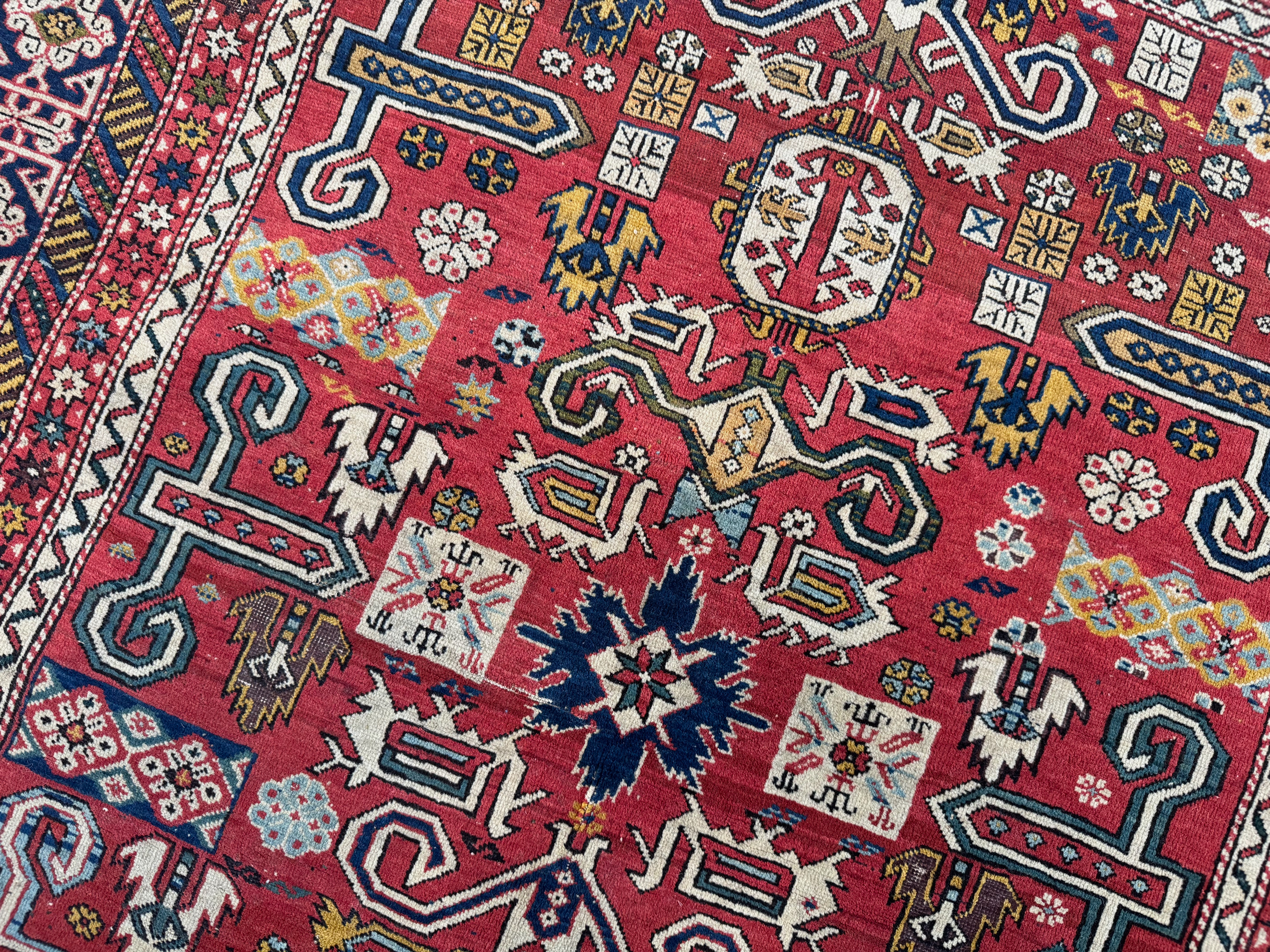 Wonderful soft toned Antique Perepedil rug in very good original condition.  With vivid and varying dyes of orange and red dyes, some pinks and teal blues, an antique Caucasian rug with great colour and depth. A classical Perepedil design with the famous rams’ horn design in the field.  This rug has an unusual ground colour being red – most Perepedils’  being woven with a blue ground.  A rare rug for a collector, or to be used as a decorative item, with a great soft wool pile.