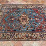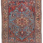Antique Karaja rugs were woven in a village in the northeast of the Heriz region of Persia, not far from the Azerbaijan Border. Their designs generally consisted of 8 pointed star motifs like this piece as well as weaving in animals and people which adds great interest. The sun-burst design is not uncommon or they would weave a more geometric central motif known as a latch-hook design.