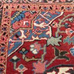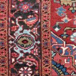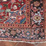 The larger border design is often known as the so-called “turtle” pattern, which has probably been derived from the interlacing arabesques that appeared in rugs at least as early as the beginning of the 15th Century. The rosette and attendant leaves between adjacent “turtles” show the other ancient ‘Herati’ pattern. Which has been stylised from two fish swimming around a water-lily over the centuries. This is more often seen on larger carpets from Heriz, so rare to see in a small rug.