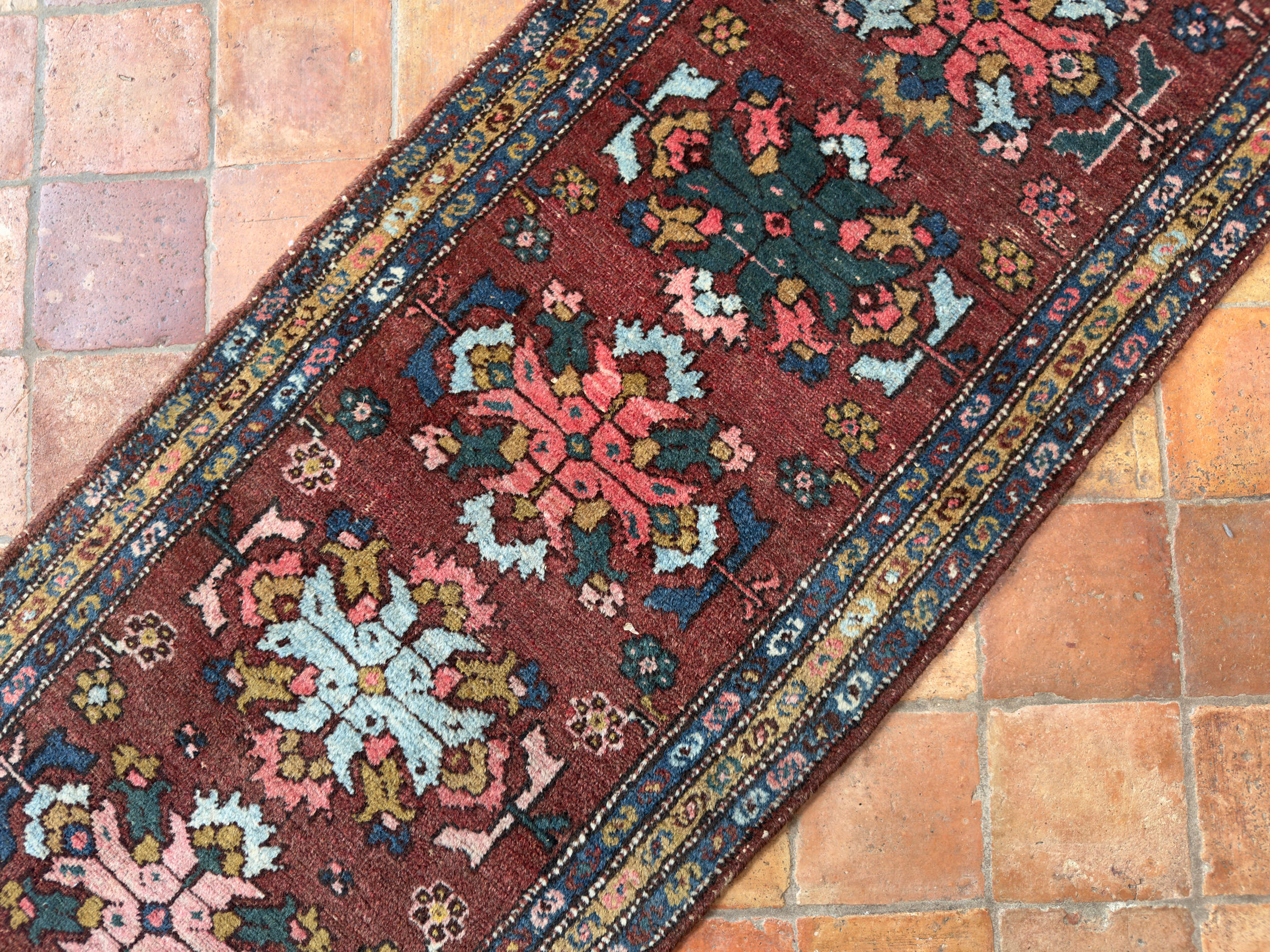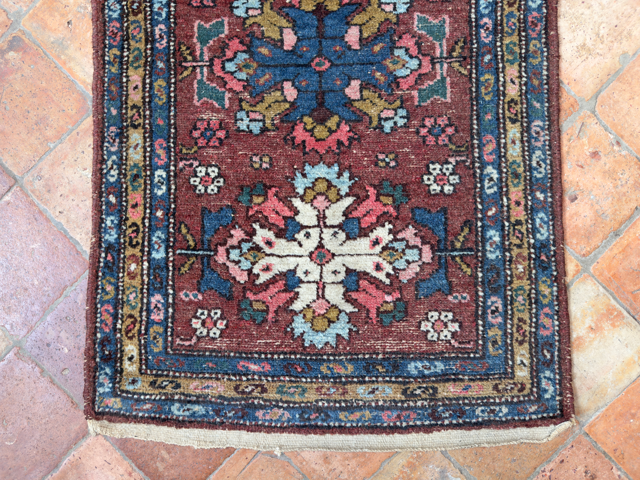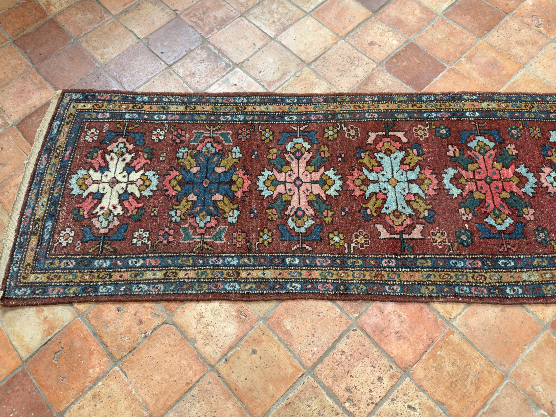 An antique Hamadan runner woven in North-West of Persia, woven around 1910-1915. Rich deep colours using a reddish brown main background, and small minor borders in pale blue and golden tones. Lovely pinks, greens and pale blues have been used for the repeating floral design running down the main centre of this runner. Condition is very nice, a good wool pile with only minimal lower pile showing. This could even be restored by our workshop if necessary.