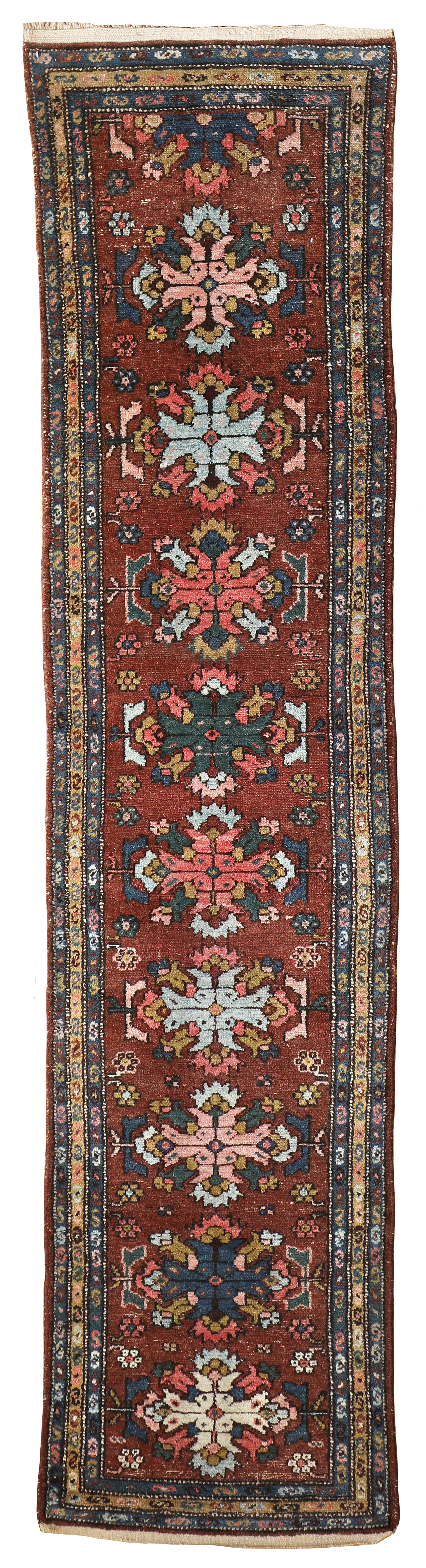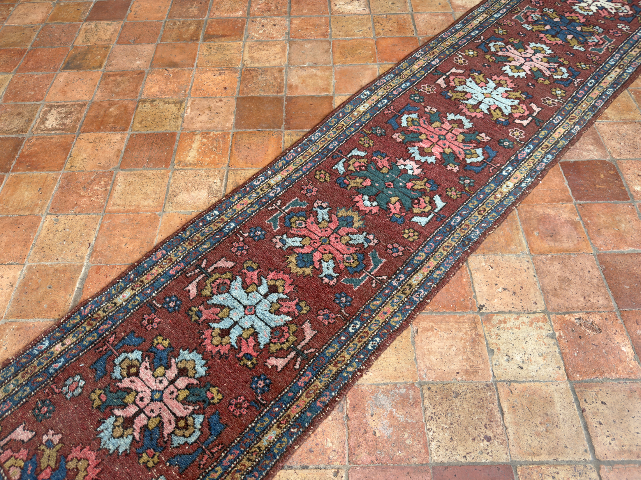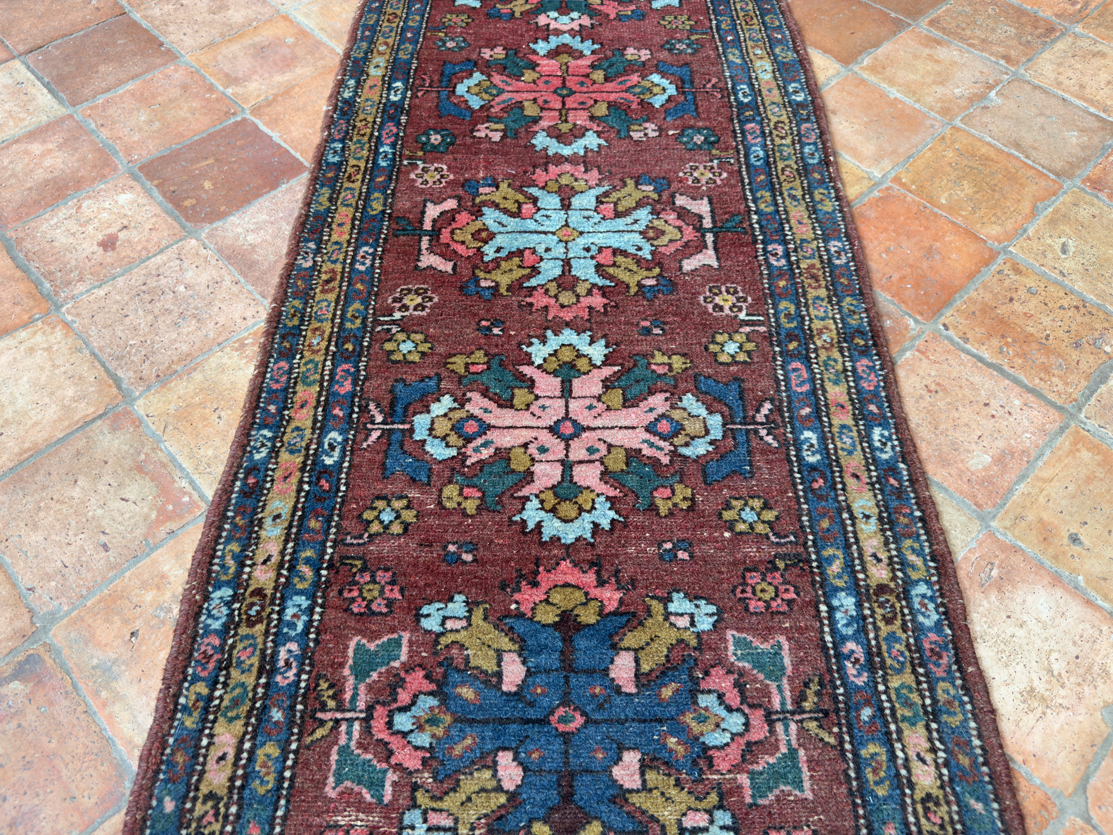 An antique Hamadan runner woven in North-West of Persia, woven around 1910-1915. Rich deep colours using a reddish brown main background, and small minor borders in pale blue and golden tones. Lovely pinks, greens and pale blues have been used for the repeating floral design running down the main centre of this runner. Condition is very nice, a good wool pile with only minimal lower pile showing. This could even be restored by our workshop if necessary.