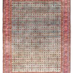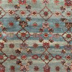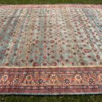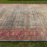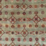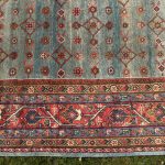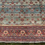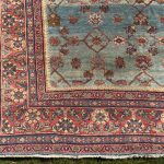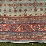 Green is one of the rarest dyes in antique carpets, as this was expensive to produce and a sacred colour, rarely do we come across examples such as this with so much green and pale blues, changing from light greens up to deeper shades of turquoise tones. The changes in the dye we can see, are due to different batches of wool being used, these wonderful variations add so much depth to an antique carpet, known as abrash, we can also see subtle changes to the soft red border.