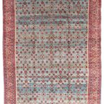 Green is one of the rarest dyes in antique carpets, as this was expensive to produce and a sacred colour, rarely do we come across examples such as this with so much green and pale blues, changing from light greens up to deeper shades of turquoise tones.  The changes in the dye we can see, are due to different batches of wool being used, these wonderful variations add so much depth to an antique carpet, known as abrash, we can also see subtle changes to the soft red border.