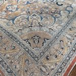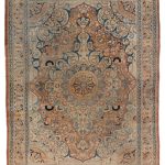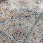A glorious antique Tabriz carpet from the master weaver workshop known as ‘Haji Jalili.’ Carpets woven from this workshop are extremely fine in their execution, and were always made using excellent dyes that have mellowed beautifully. The soft palette is due to the carpets age, woven around circa 1880 the dyes would have been much stronger and fade to give a wonderful saturated feel. The soft pale blue dyes are exquisite and highlight the carpets stunning central medallion which exquisite floral designs.