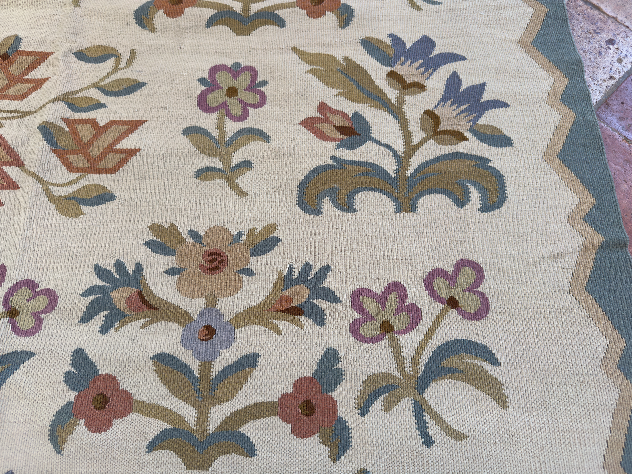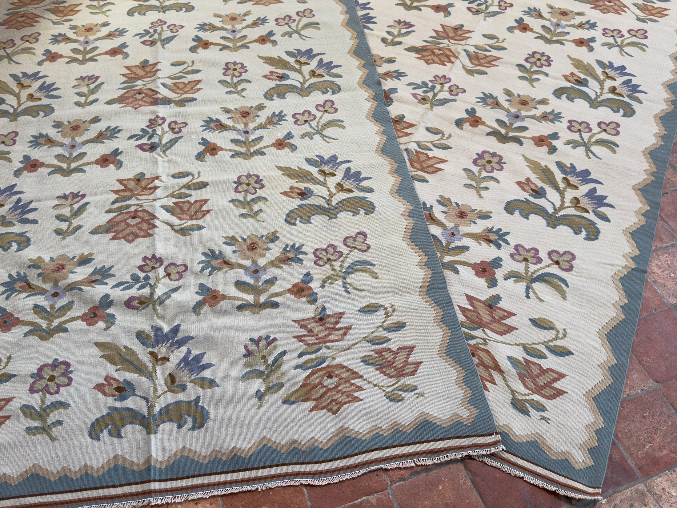 A wonderful pair of Bessarabian Kilims, dating from 1920 and in excellent original condition. Beautiful floral elements to replicate barley, poppies, and various other flowers. Using soft greens, pinks, pale blues and greens with some light orange hues, to create the prettiest pair of kilims. Rare to find a pair of antique Bessarabian kilims in these lovely smaller sizes. Each kilim measures 230 x 148 cm.