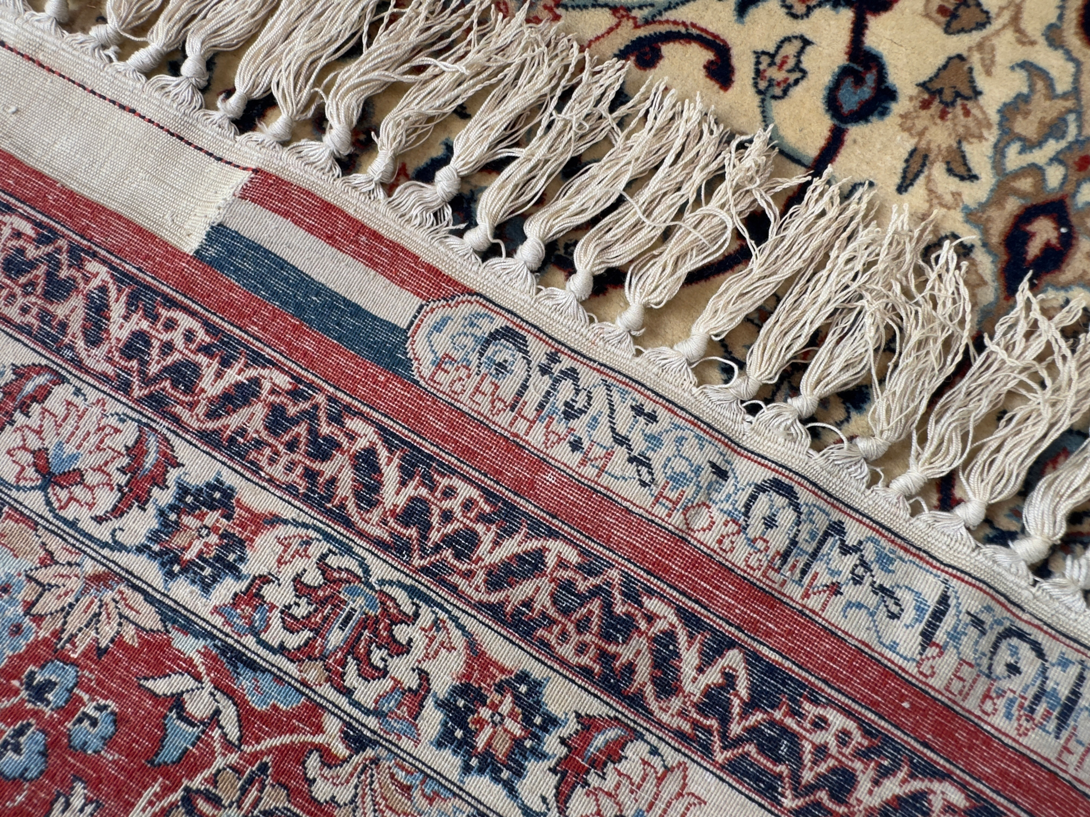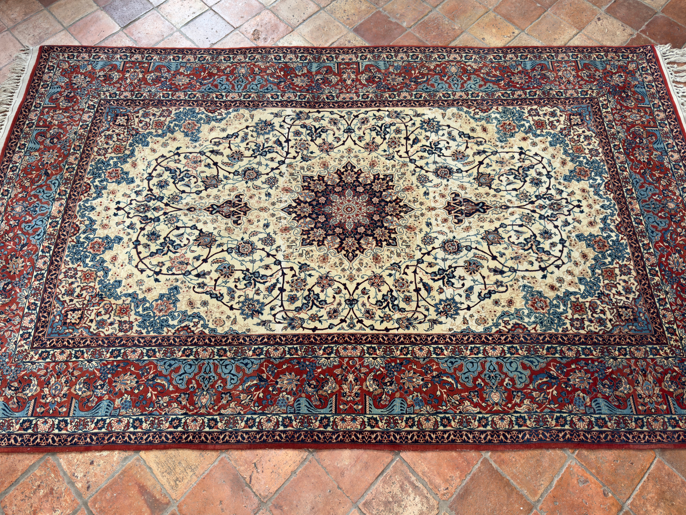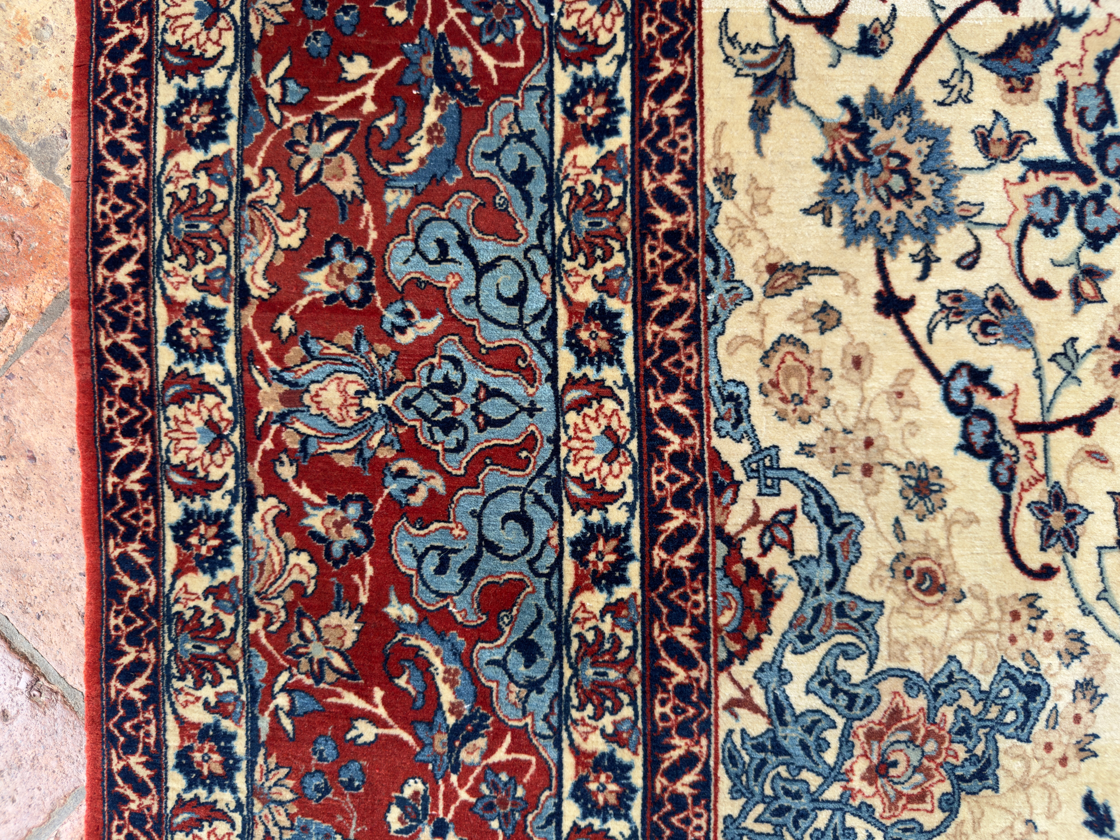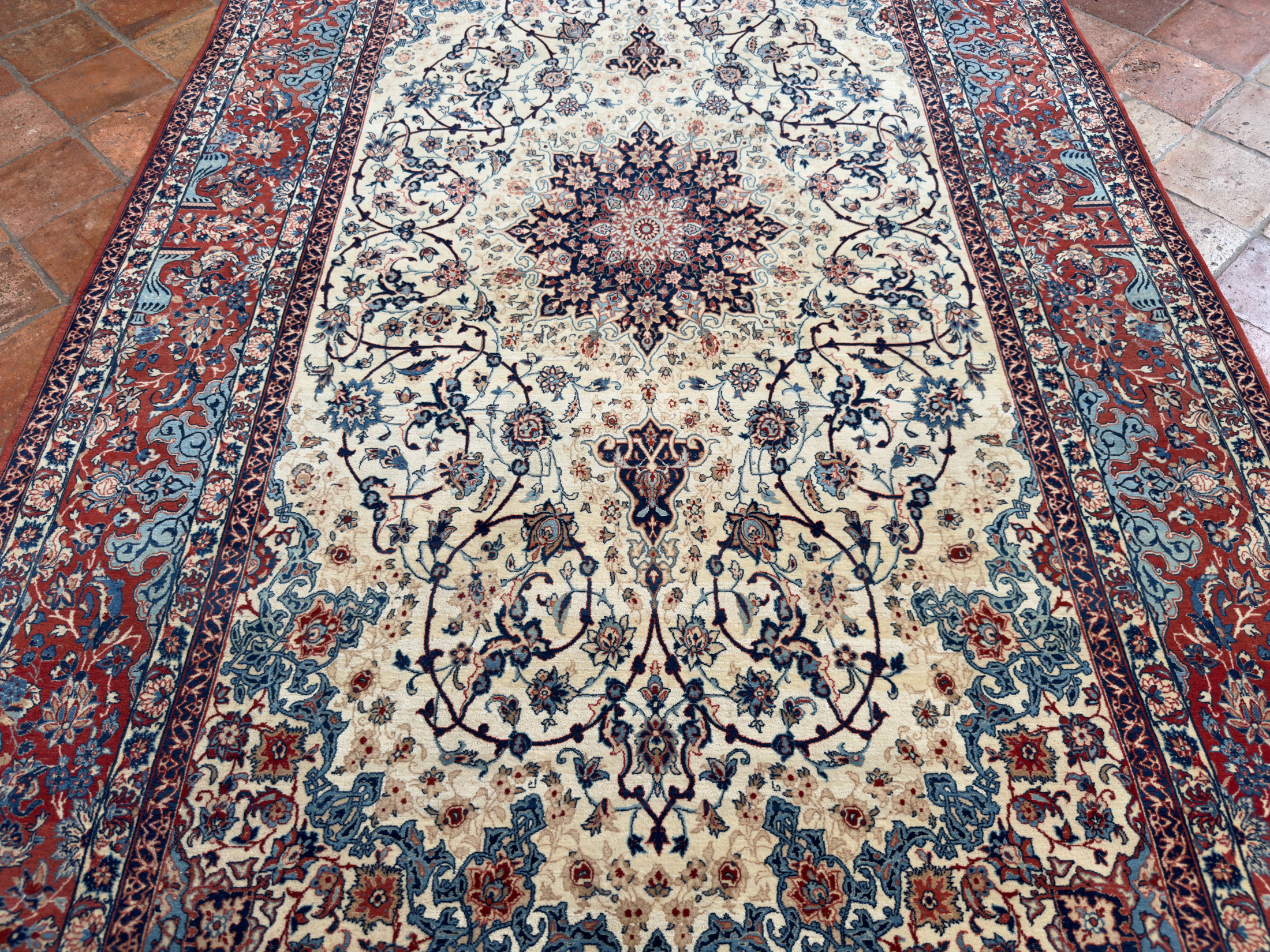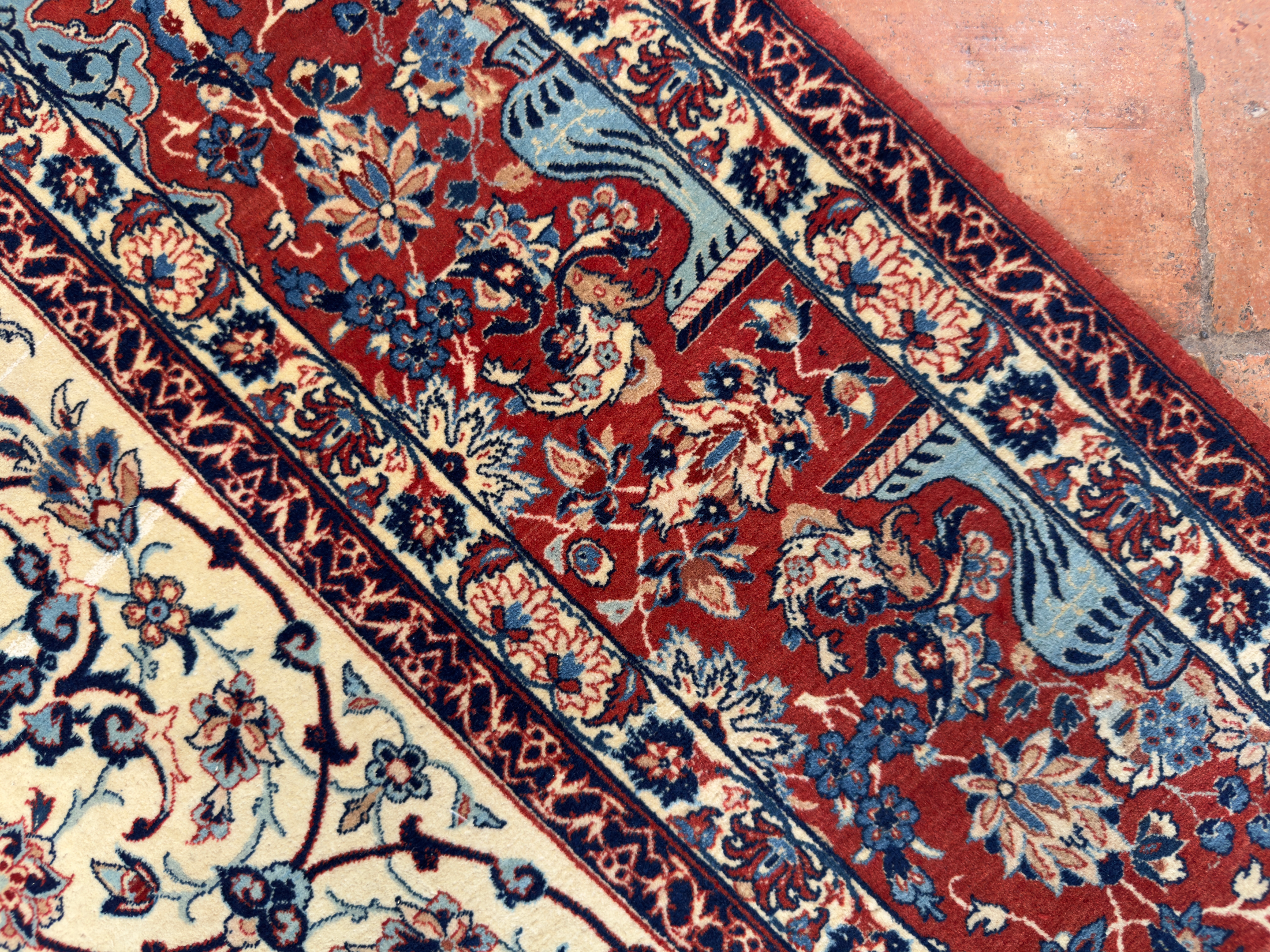 Isfahan is situated virtually in the centre of Iran, and was once the capital city. The rugs are woven in the city itself and the surrounding villages. Starting in the early 17th century, their name was renowned throughout Europe – this has continued to the present day. Although rug making was interrupted by the Afghan invasion, it quickly re-established itself as a major centre for the finest handmade carpets. This example show cases why Isfahan are famous for weaving the most detailed, beautiful fine rugs.