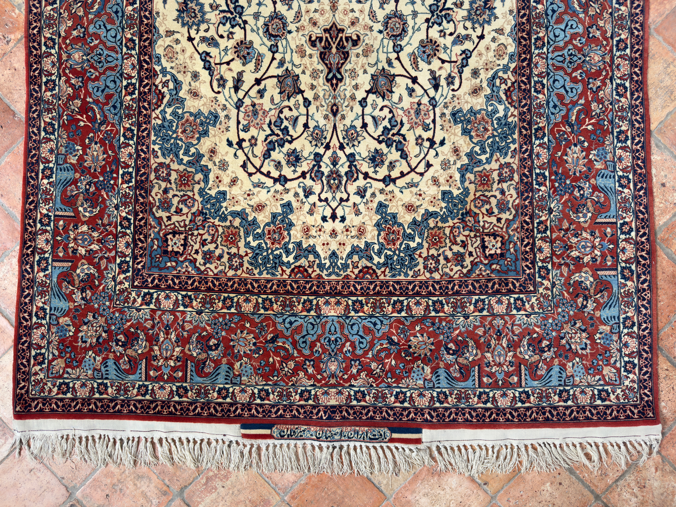A rare antique Seirafian rug, signed by Hossein Seirafian, unbelievable detail, the scroll work is remarkable and the border of half cut pale blue medallions and vases are very unusual to see. Woven with an off-white to cream toned background, which has some abrash (dye change) this is an exceptional piece of art woven by the Master Seirafian workshop.