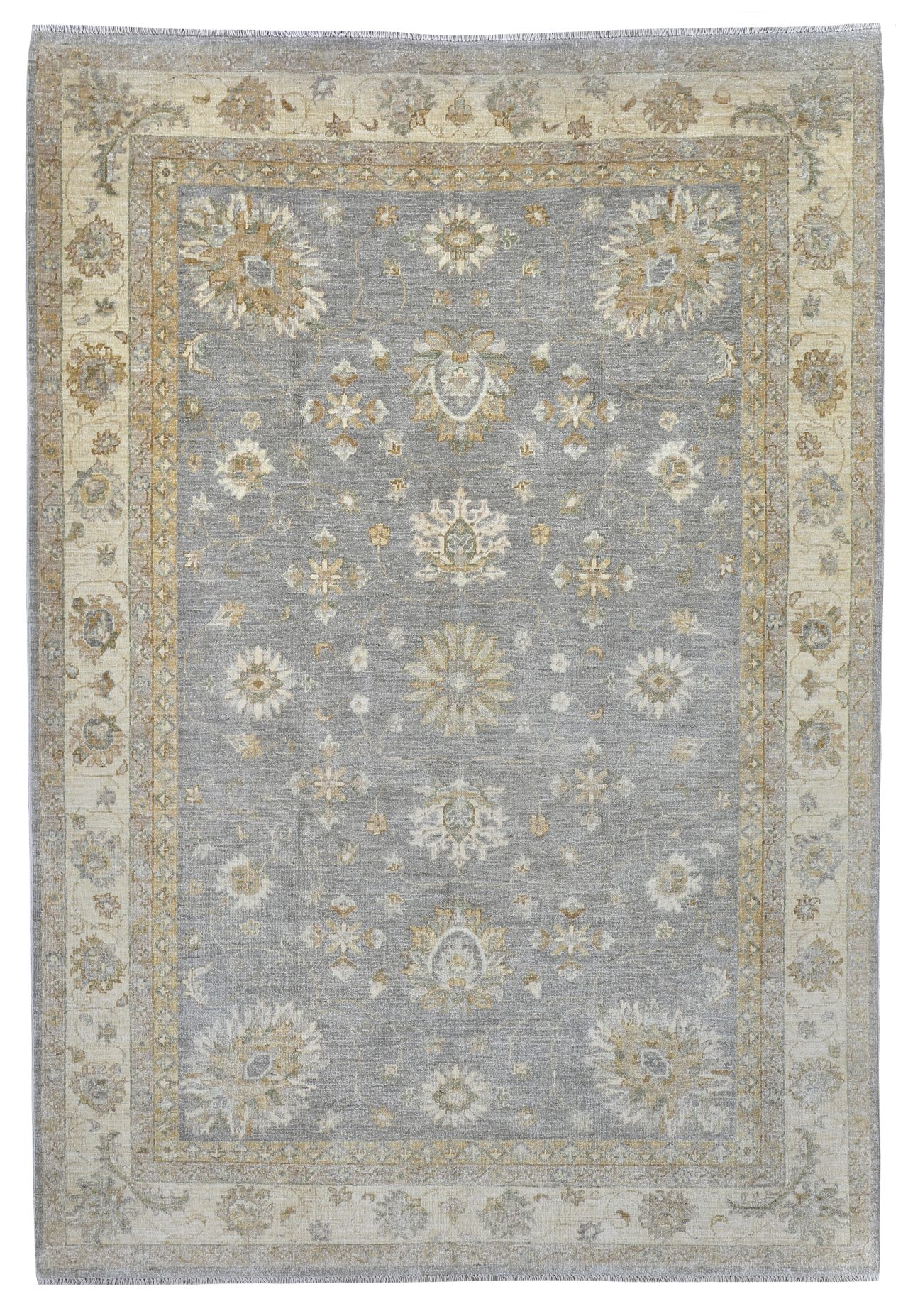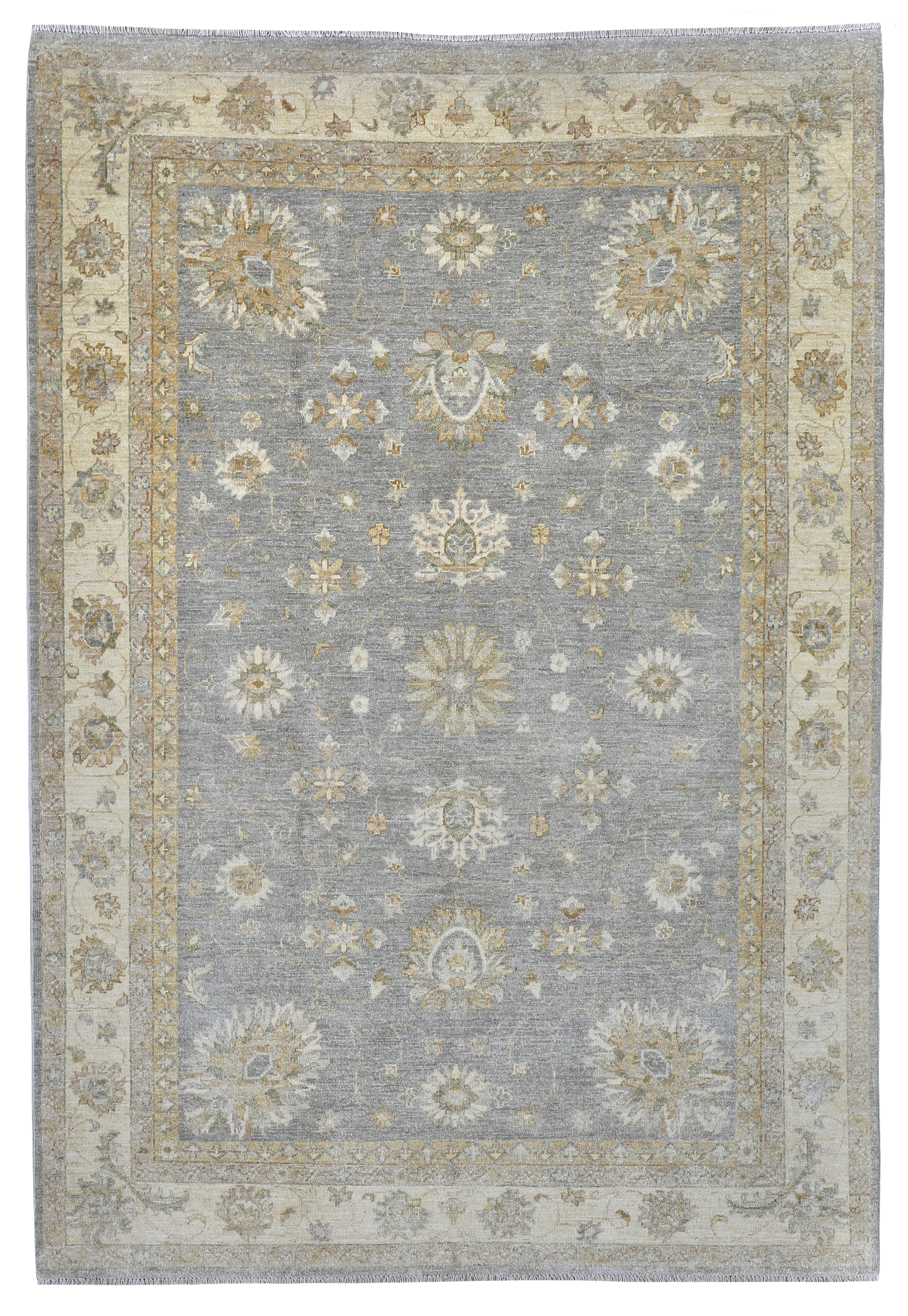 A modern Ziegler carpet hand-woven in Afghanistan with natural hand-spun wool and natural dyes. A lovely pale border with muted grey/blue background, some soft greens and golds in the minor borders. These brand new contemporary carpets we have woven in these muted colours for todays modern interiors which sometimes require softer colours which are easier to live with.