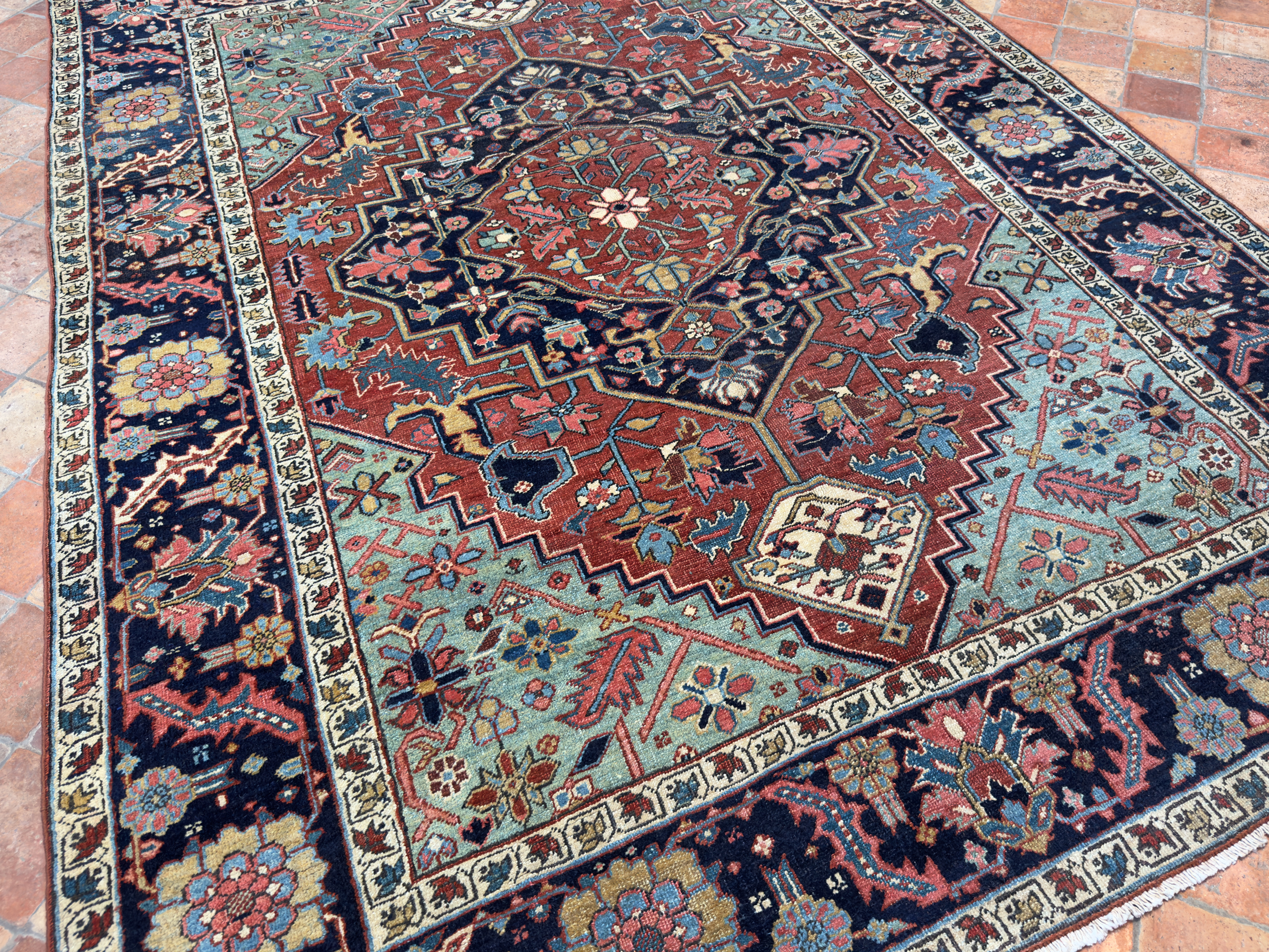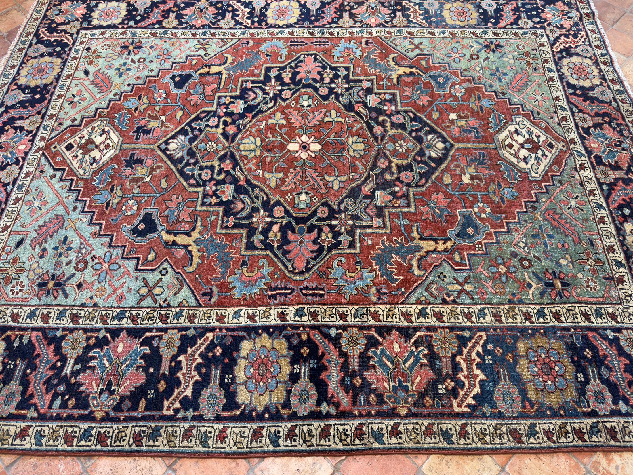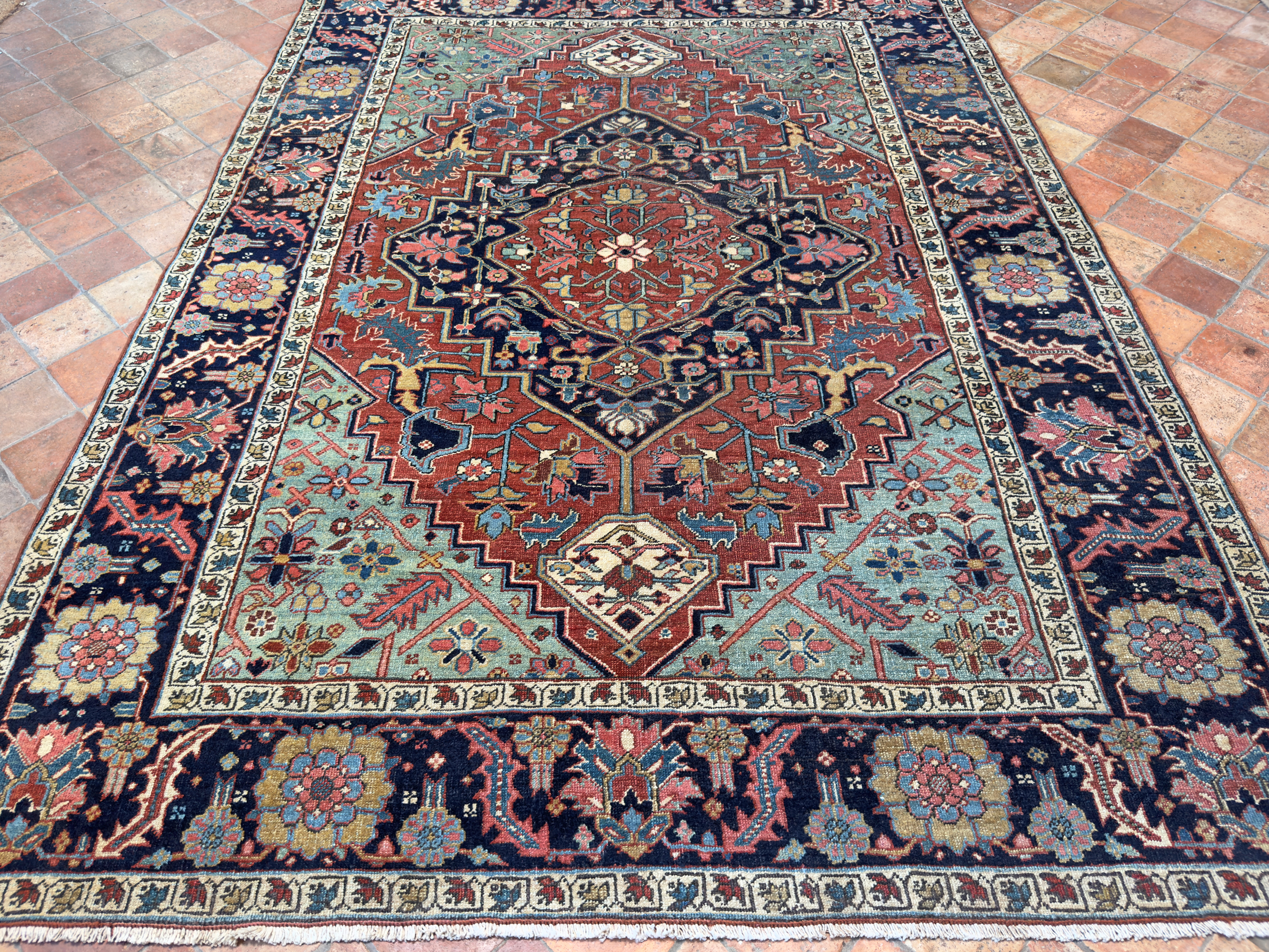A wonderful early antique Heriz carpet woven around circa 1880 with the best early green dyes and and pale blue natural colours.  The pale blue, green tone corners are faded and a palette of warm terracotta brick tones and deep blue almost black border.  In exceptional condition with a medium wool pile height all over, these carpets are known for being incredibly tough.  One of the best designs and well spaced out drawing, the border motif is exquisite, large leaves and golden flowers.  The central medallion is beautiful too, one of the best we have had.