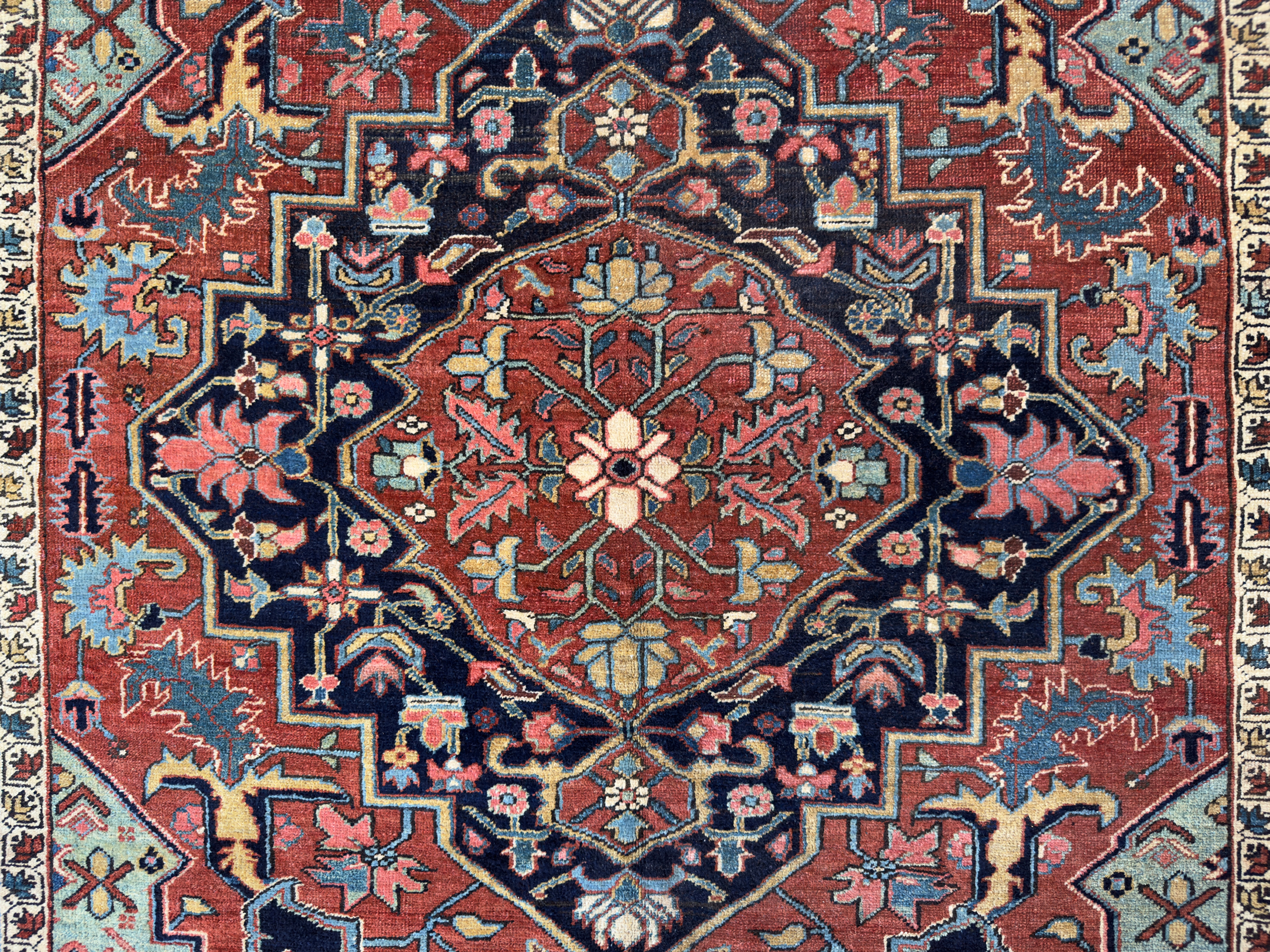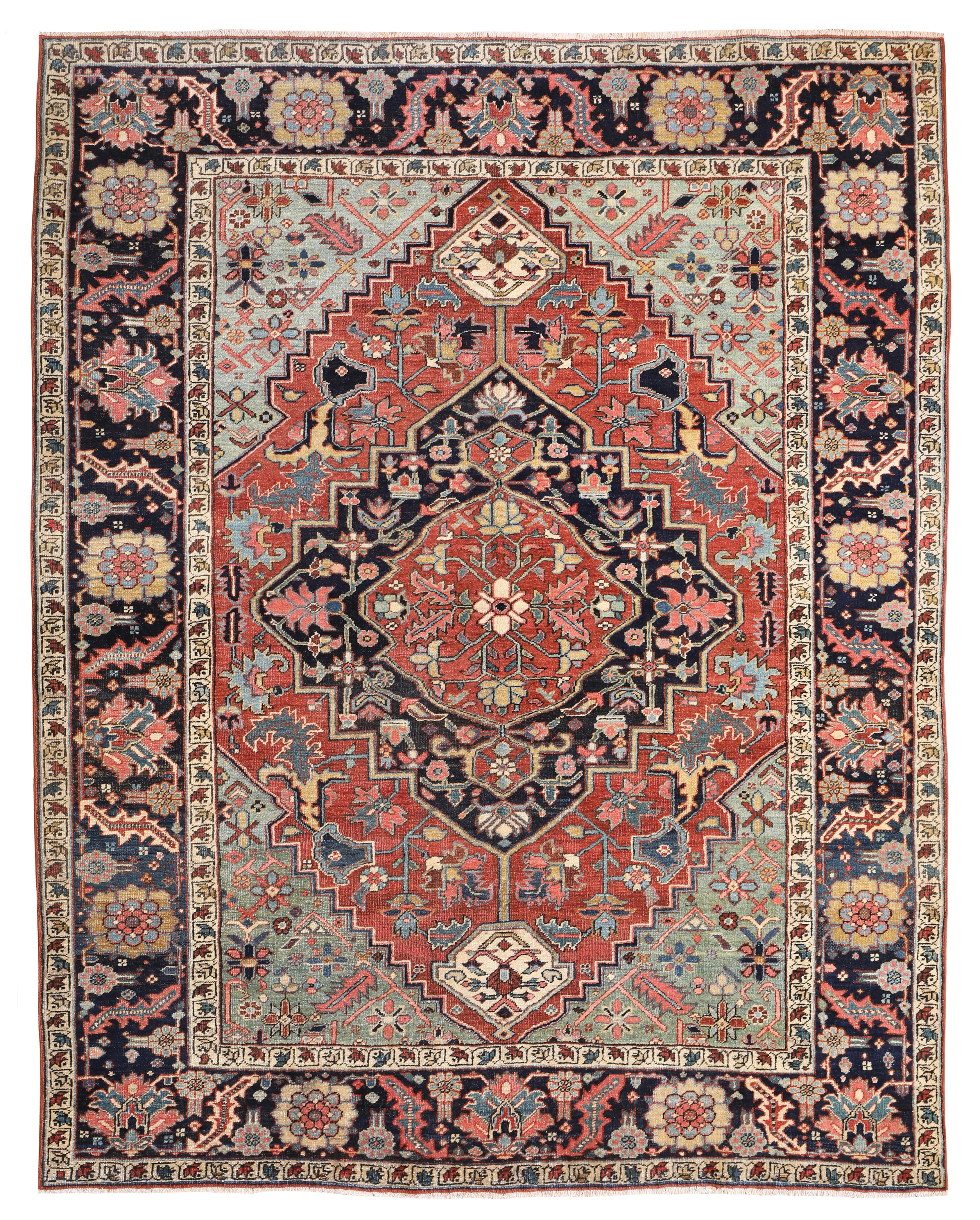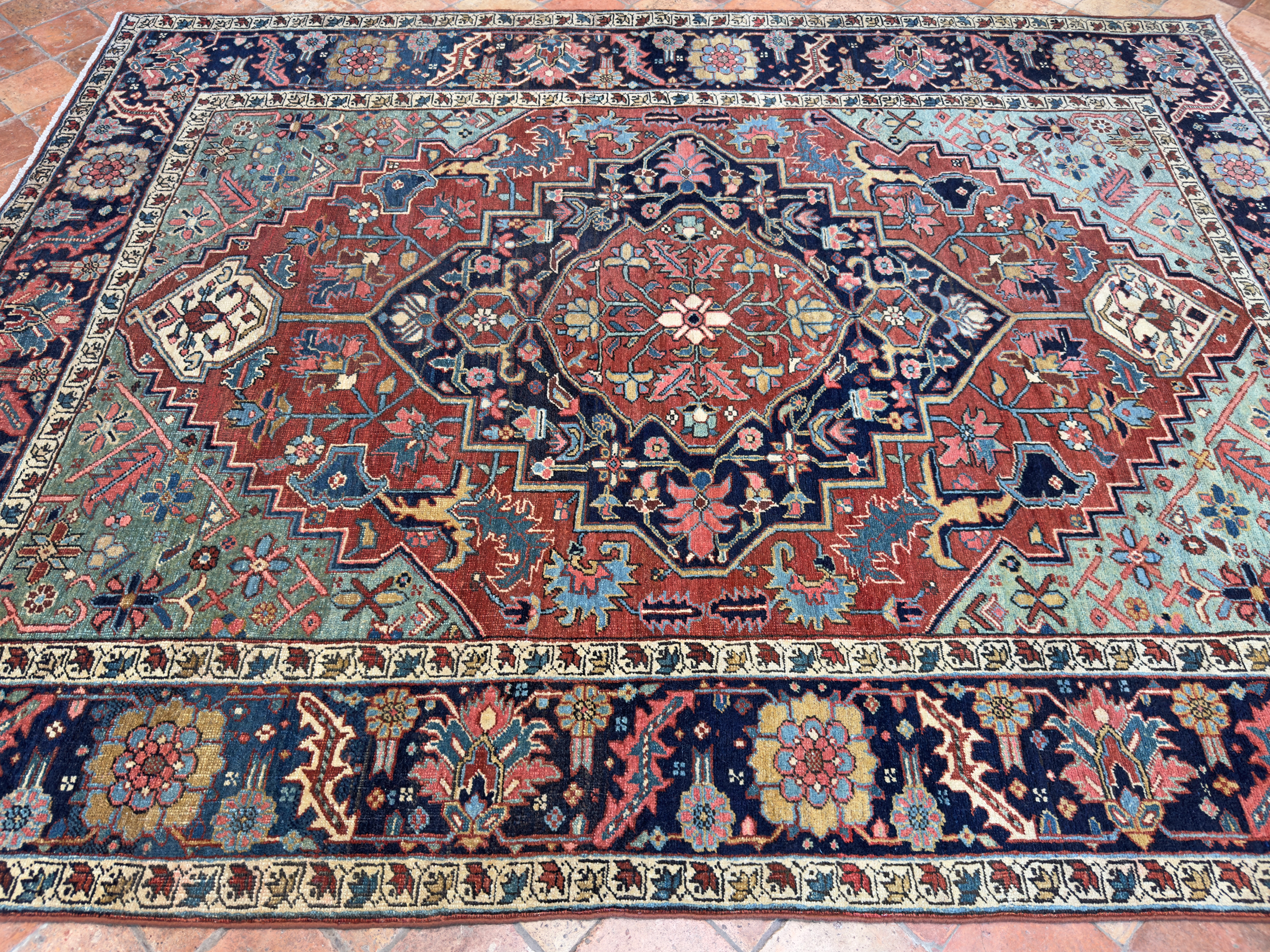 A wonderful early antique Heriz carpet woven around circa 1880 with the best early green dyes and and pale blue natural colours.  The pale blue, green tone corners are faded and a palette of warm terracotta brick tones and deep blue almost black border.  In exceptional condition with a medium wool pile height all over, these carpets are known for being incredibly tough.  One of the best designs and well spaced out drawing, the border motif is exquisite, large leaves and golden flowers.  The central medallion is beautiful too, one of the best we have had.