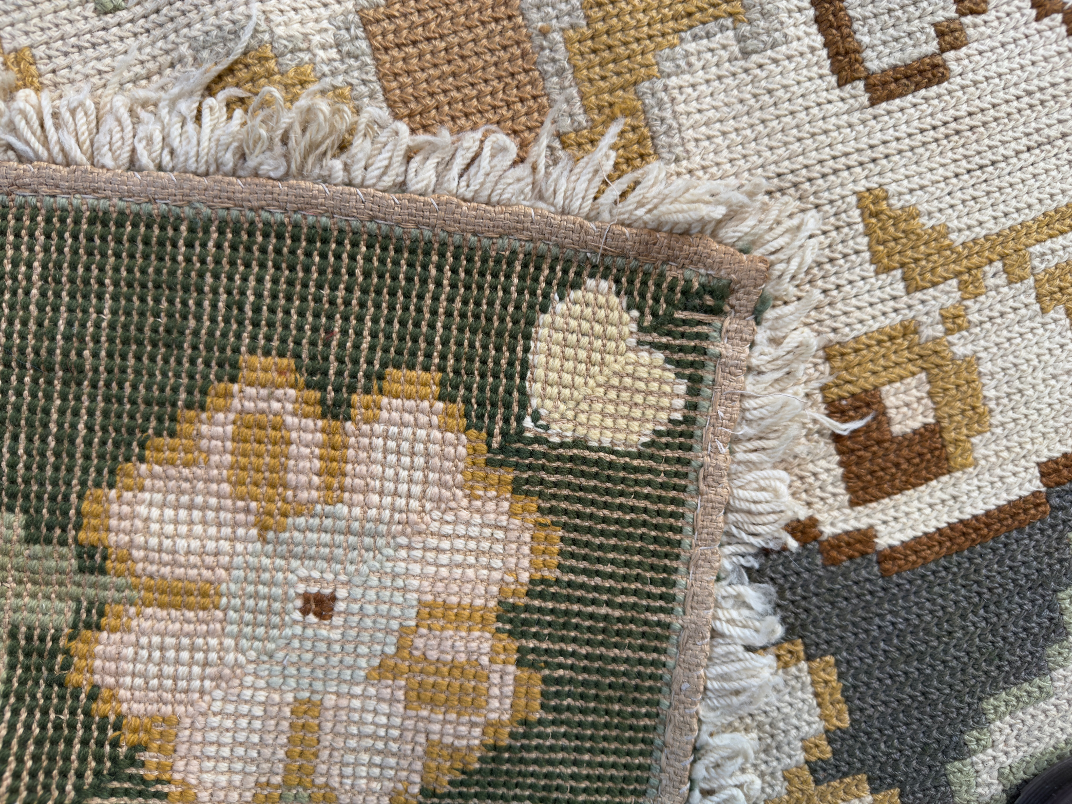 In great condition for its age, with original fringes which flow all the way round a needlepoint. Gently cleaned by our workshop recently, it has brightened up and is such a pretty decorative carpet.