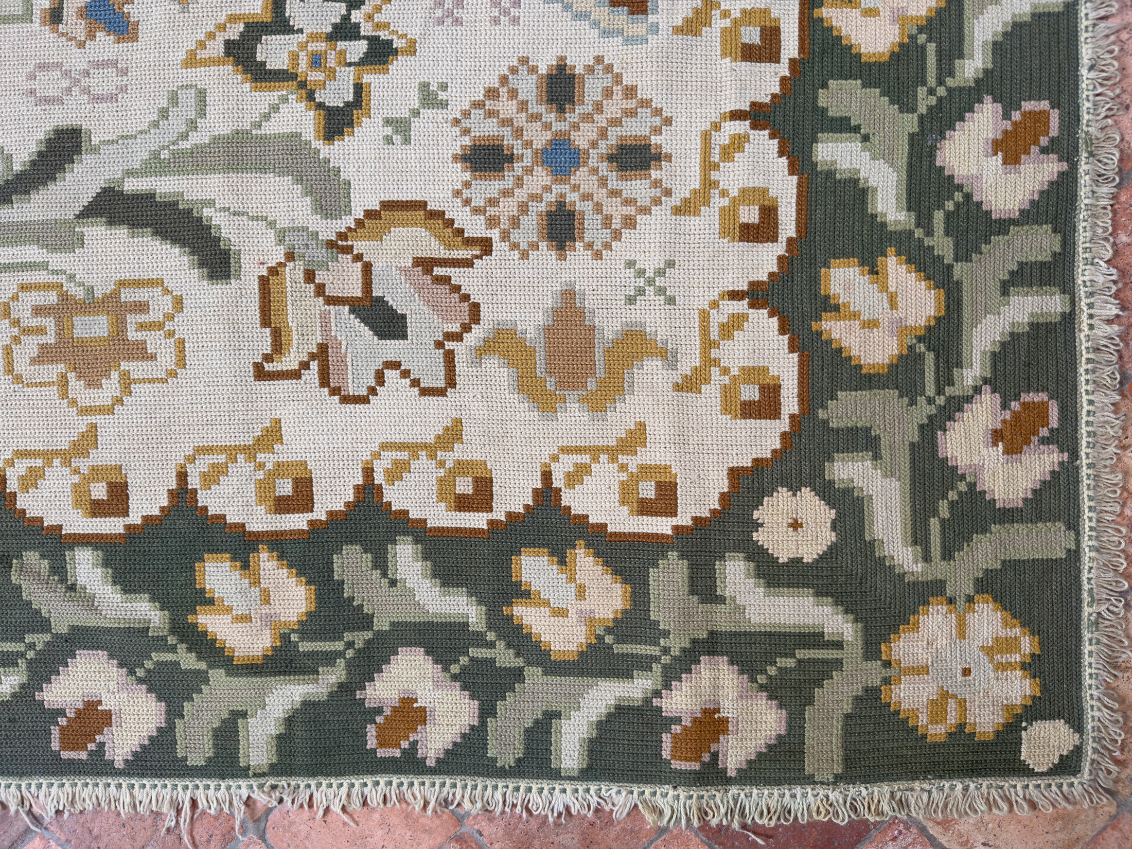Portuguese Needlepoint carpets differ from traditional Persian carpet weaving in that they produced using a tapestry needle and are created using diagonal stitches on the carpet’s jute or wool canvas. They have a larger wool knot because of this technique. The elegant floral patterns are actually created by changing the colours of the wool. Where as traditional Persian carpets are woven on a vertical loom, where the warp is strung vertically and the weft and knots go across the warp.