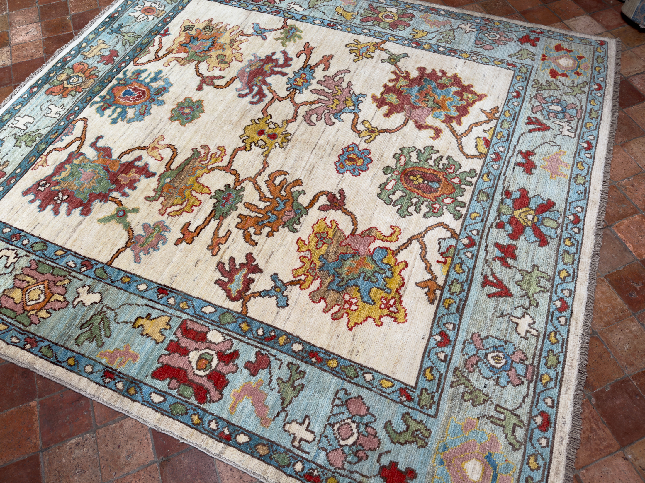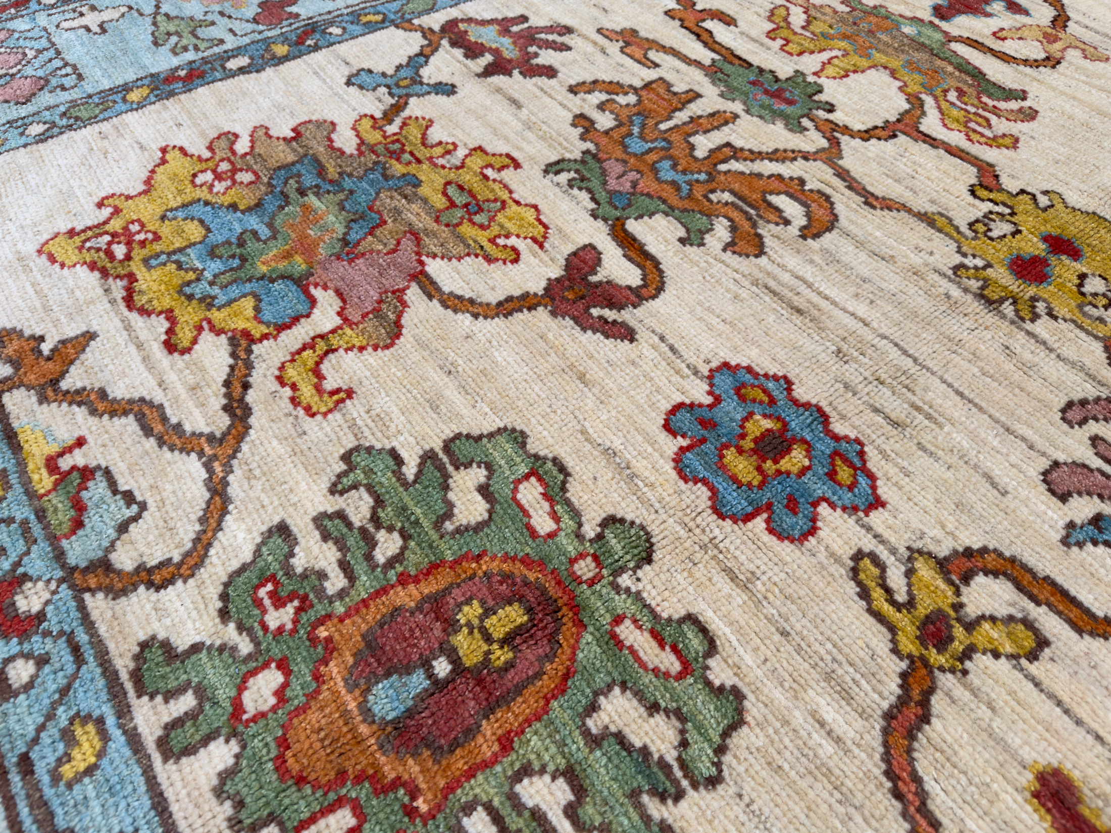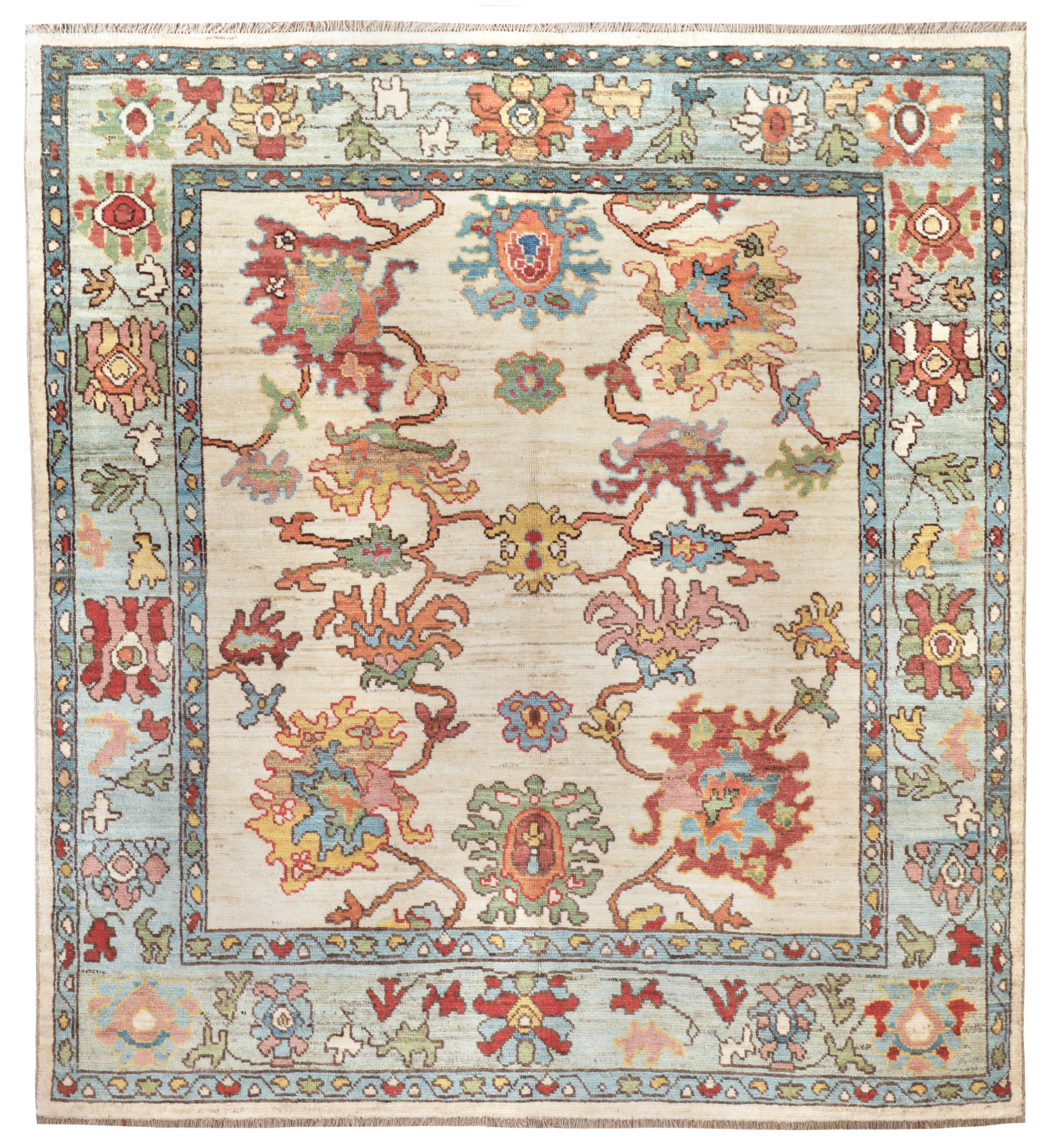 Using famous designs from antique Ushak carpets, with large scale palmettes and an open design, this is a contemporary Ushak carpet using light greens, soft reds and blues, all hand-woven using soft wool and natural dyes.